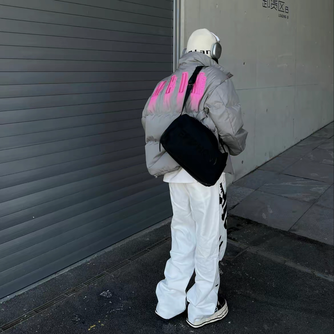 🌙🌙今天的ootd可以称得上近期的小帅哥之最了! 灰色的羽绒服搭配超酷的抽象印花牛仔裤简直不要太吸睛了!外套背后的撞色大印花超上镜 💫💫搭配我的冷帽和耳机(走在路上回头率好高啊hhh
