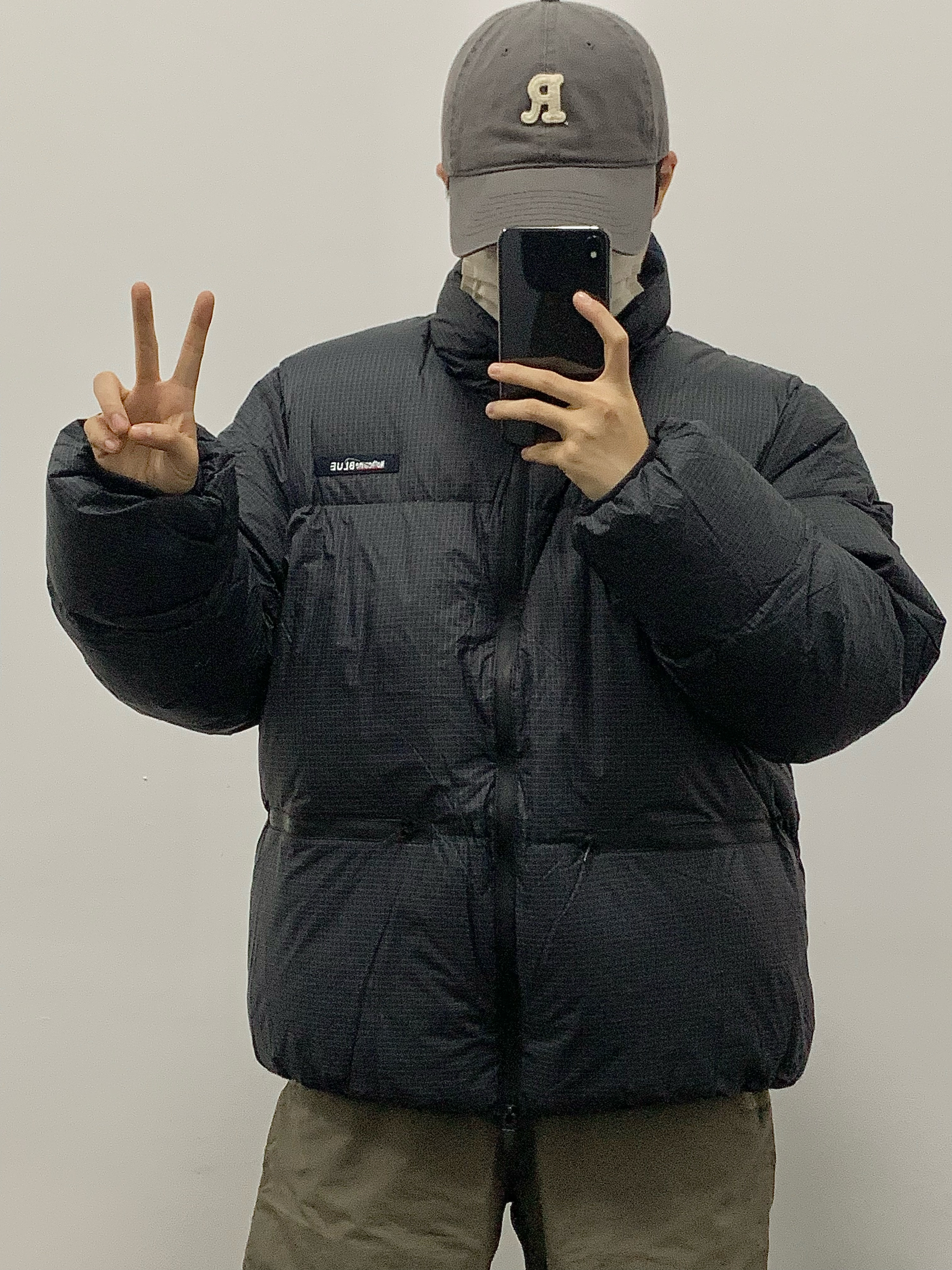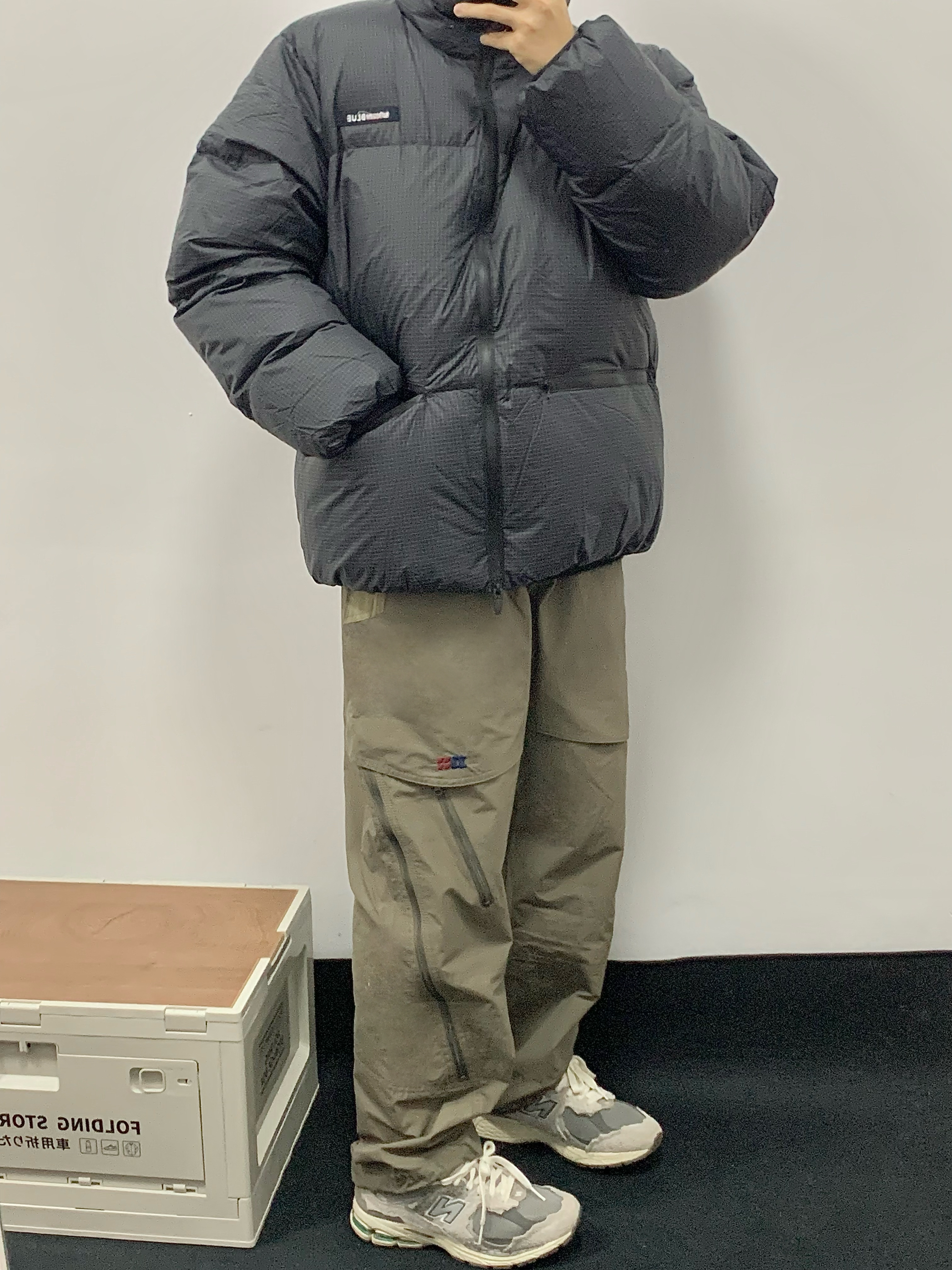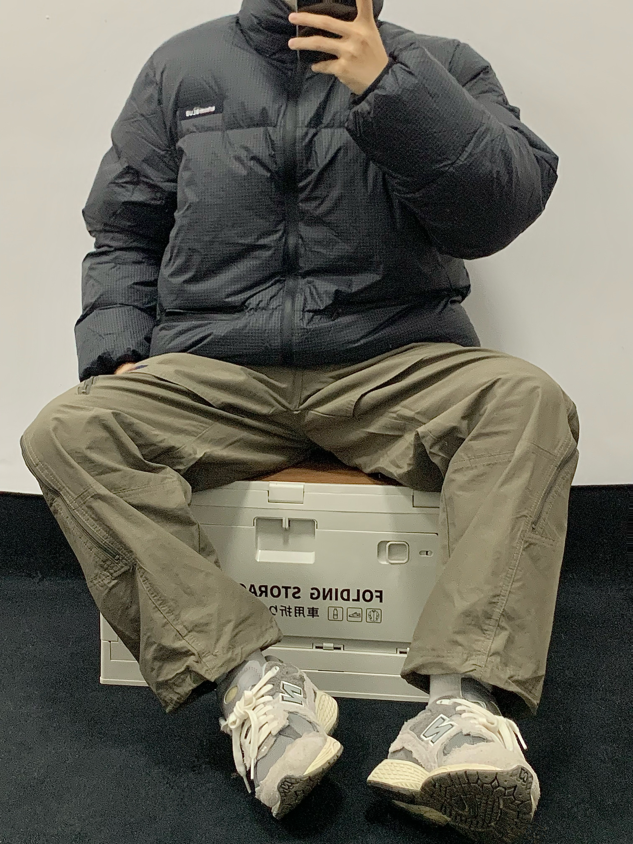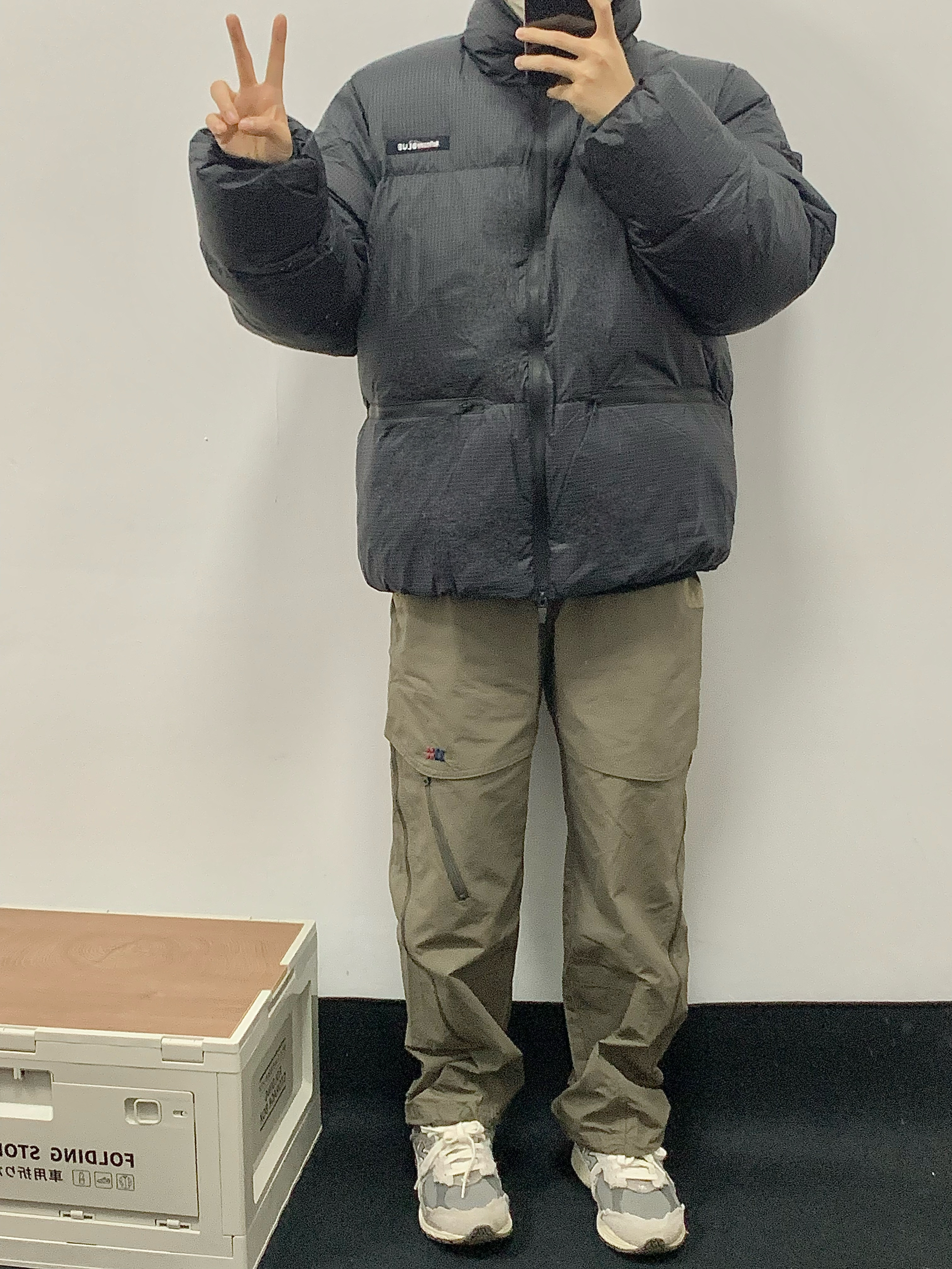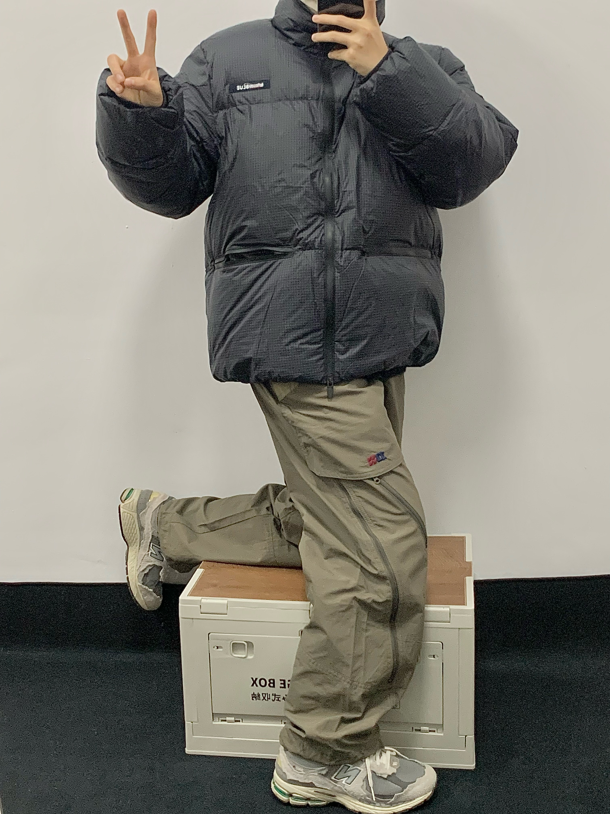 上衣是藏青色的羽绒服 暗格设计 简单大方 95%的白鸭绒填充 300克充绒量 拉链处也做了防水的设计 上身很轻盈 不会显得臃肿 下装是卡其色的工装裤 侧边拉链设计 修饰腿型 裤脚抽绳设计 可阔腿 可束脚 冬天就这么穿! 👔:NOTHOMME 👖:NOTHOMME 👟:NB2002R