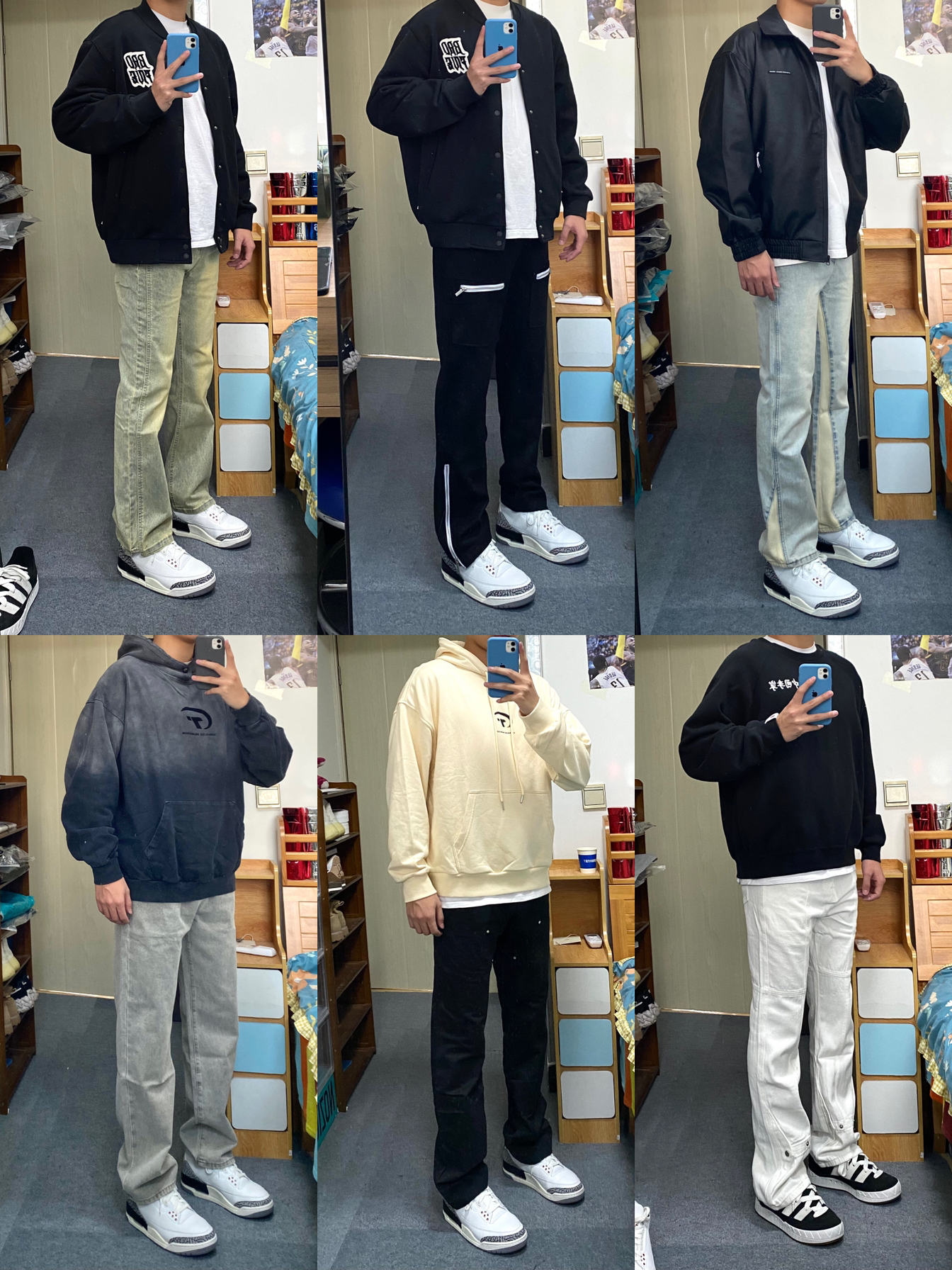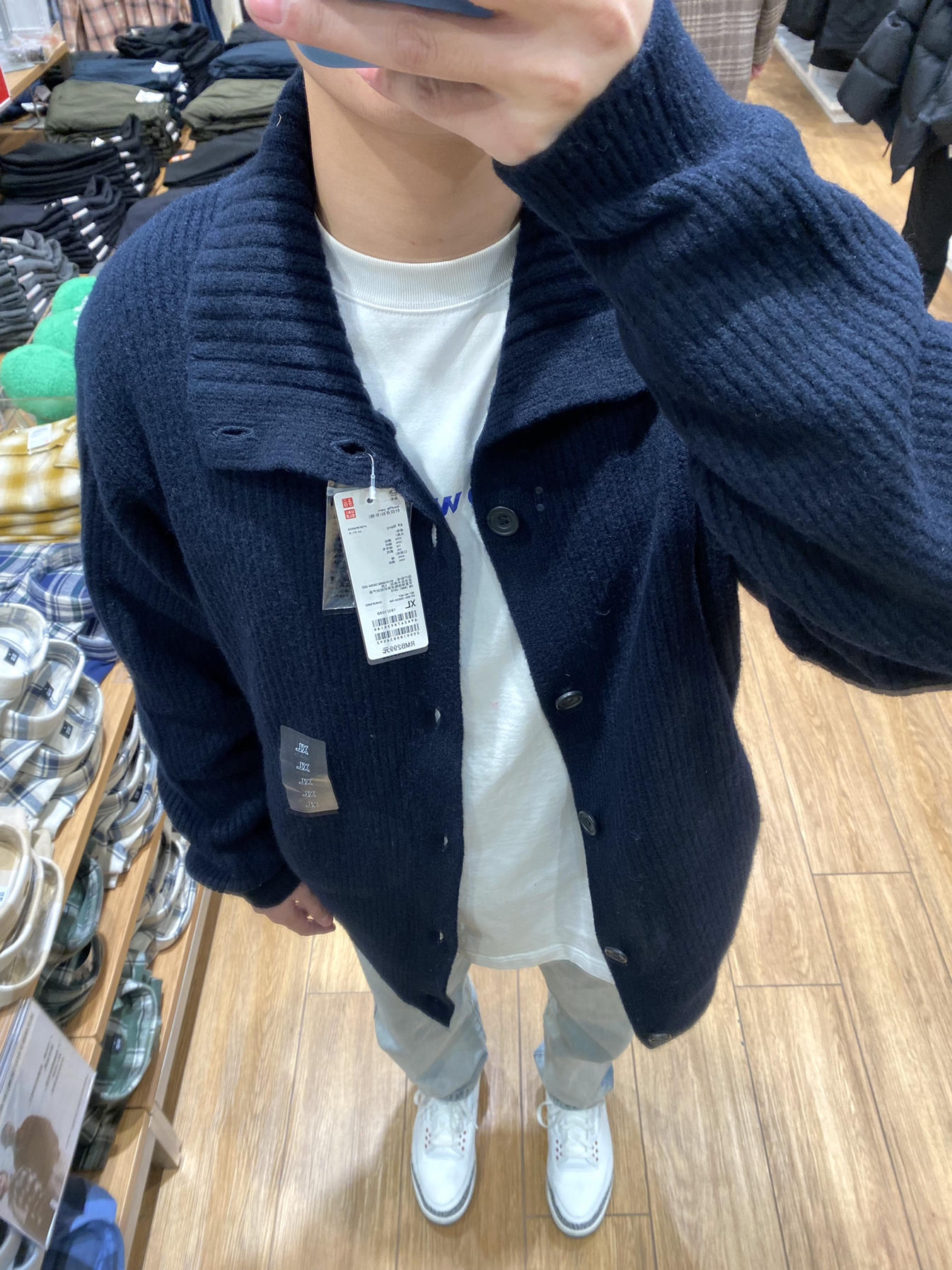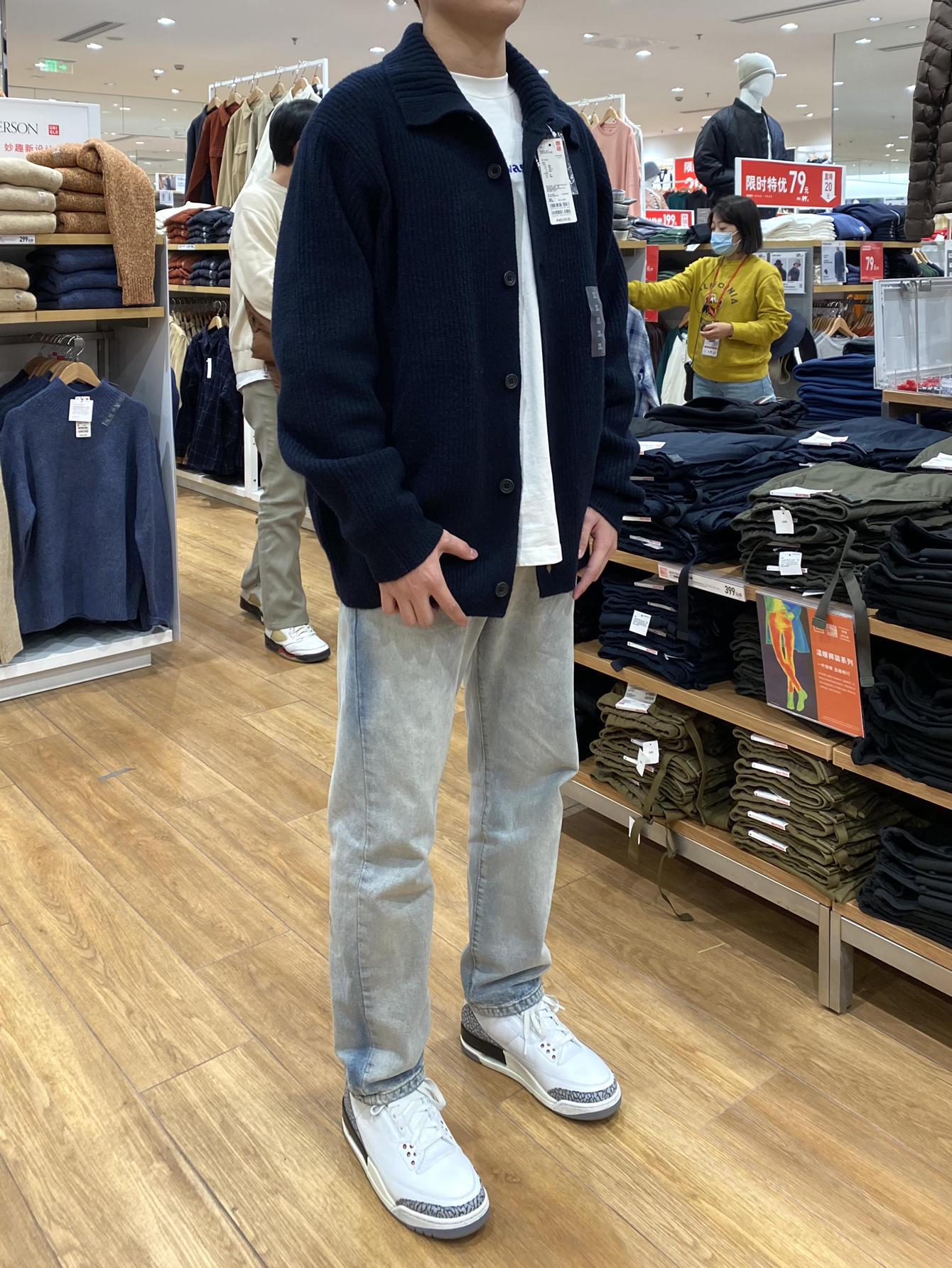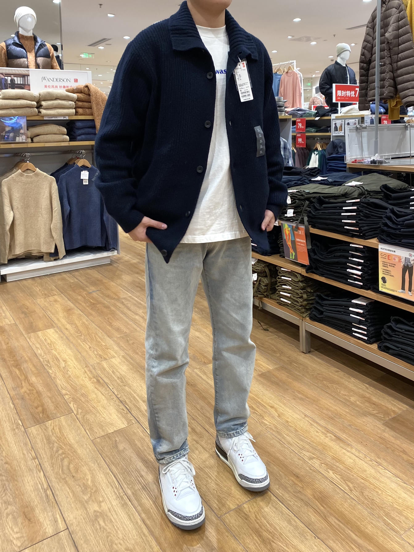 试了很多这个毛衣外套很搭!183 75kg ⬆️U家的毛衣外套,很帅!应该不能机洗,穿着很舒服,U家的质量大家都懂。穿的XL ⬇️主页推了无数次的牛仔裤,真的帅又百搭,质量很好!穿了好久了都,春秋可以穿,北方的冬天里面需要加衬裤,不透风。穿的L 👟AJ3神鞋,什么都能搭!买大一码