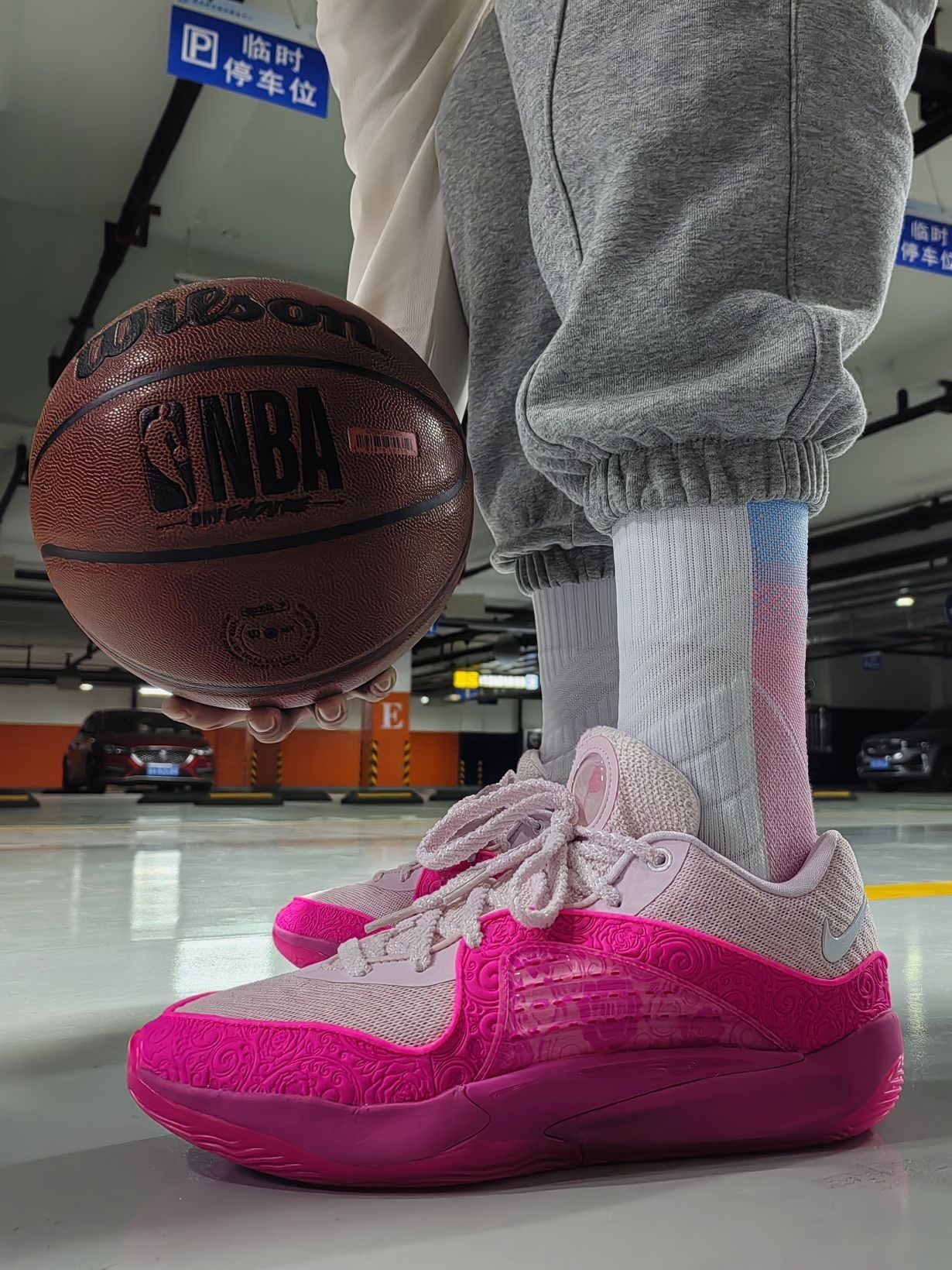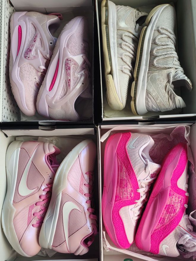 👟球鞋名称:Kd乳腺癌系列。 🔍设计亮点:亮粉的设计别出心裁。 ⛹️实战感受(缓震/包裹/抓地力):买这个配色的朋友们都只为了颜值!何况性能呢? 📃总结评价:乳腺癌的配色太经典了,导致它升值涨价
