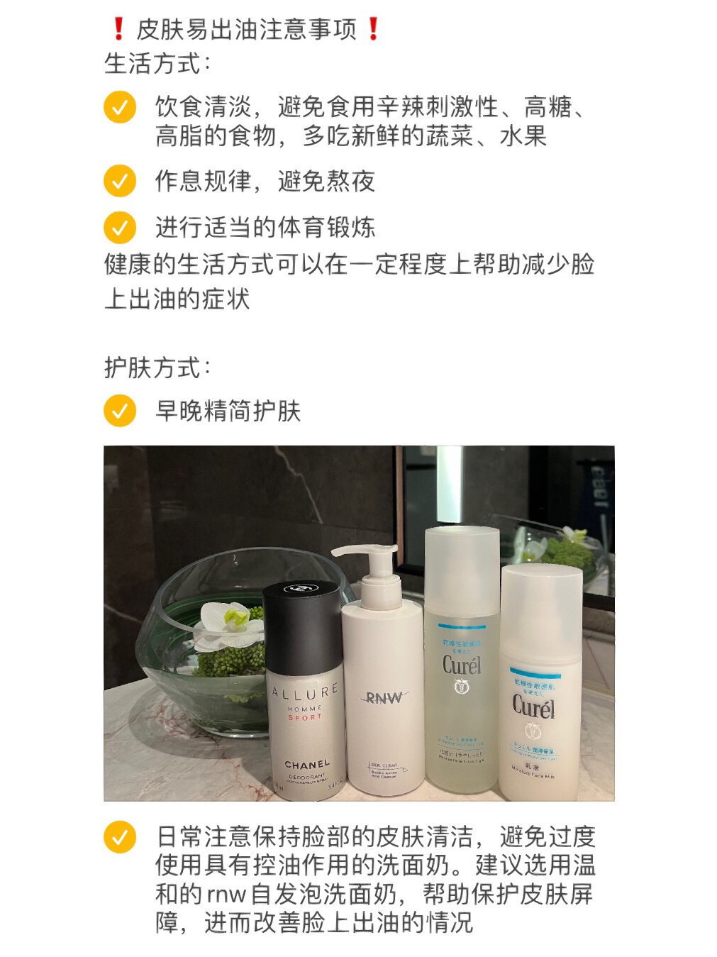 作为一个长期经受风吹日晒的黑皮啊哈哈哈哈哈,平时训练暴汗后脸部容易出油,对比之前洗把脸就直接出门的粗糙,现在也有意识的把基础护肤提上日程了,因为脸部出油后肤色🏼又暗了一度!!一度! ❗️划重点❗️ 针对皮肤易出油简单说一下我最近的操作: 1.饮食清淡,避免高油、高盐、高糖的食物 2.避免熬夜,设闹钟提醒自己早睡(别偷偷👀剧)或者喝杯牛奶助眠 3.精简护肤: 🌞:洗面奶+爽肤水+乳液+防晒 🌙:...