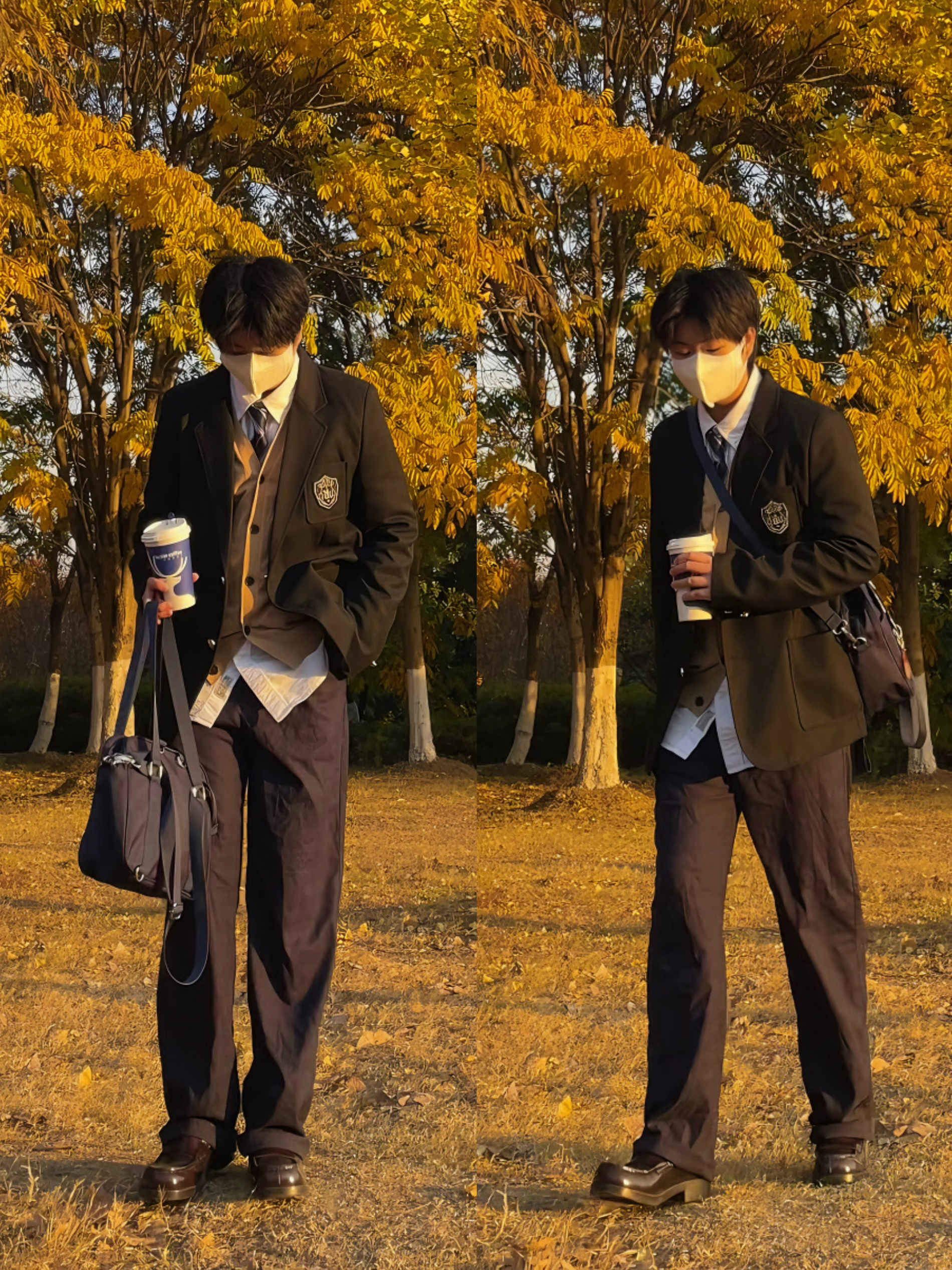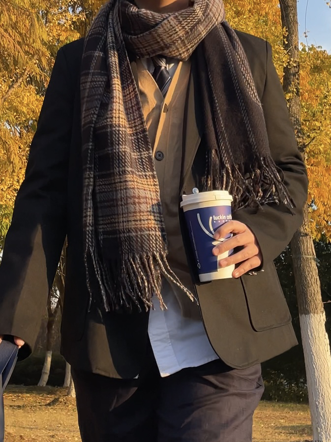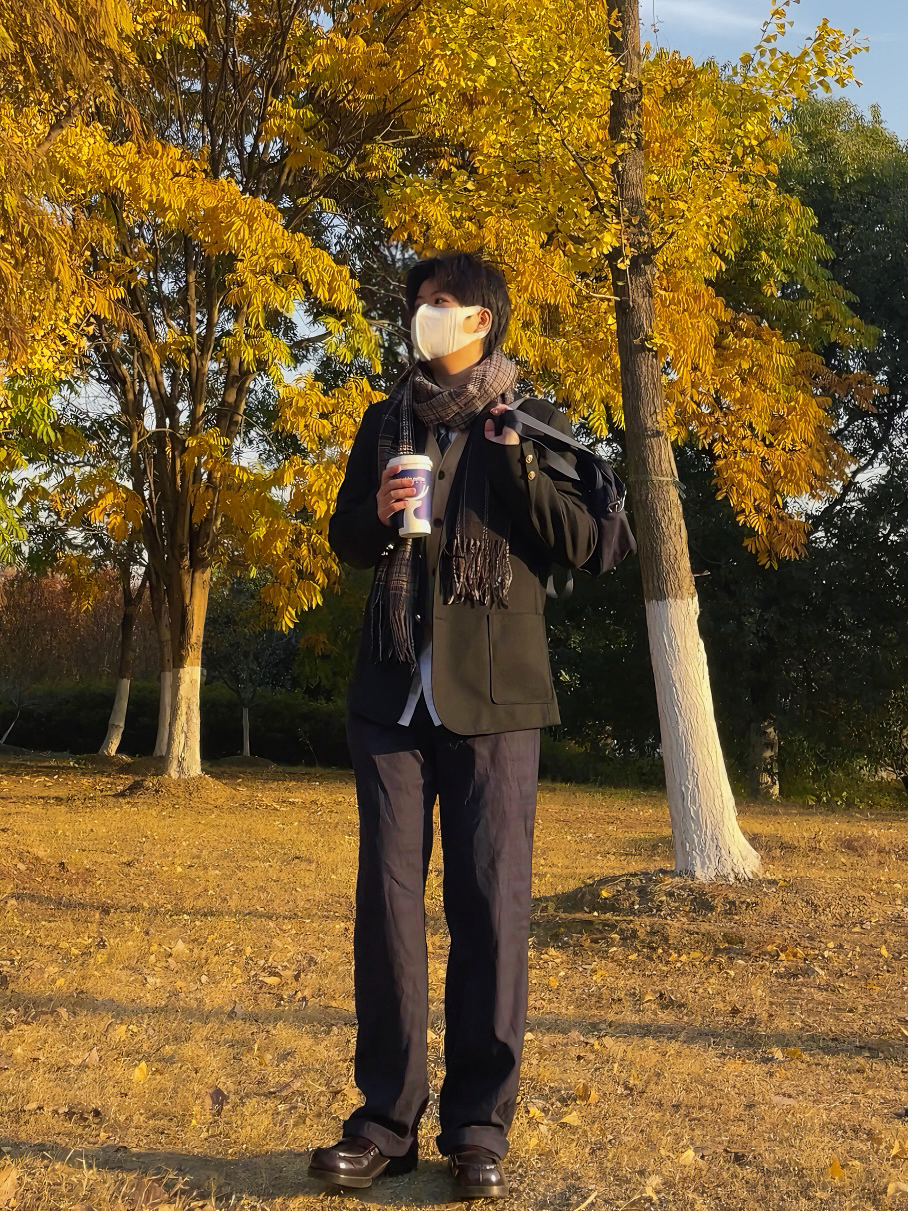 ✨今日搭配 黑色西服 直筒西裤 棕色学院风皮鞋 白衬衫 杏色针织衫 ————————————— ✨很久没有穿的dk 学院风冬日搭配格纹的围巾加强了保暖性 杏色的背心也有温柔少年气