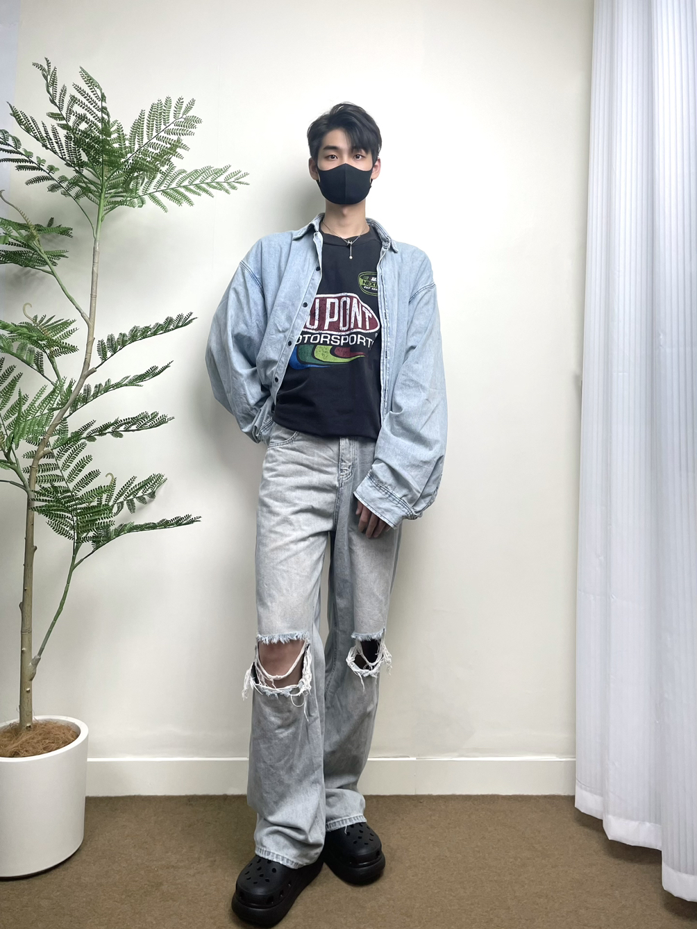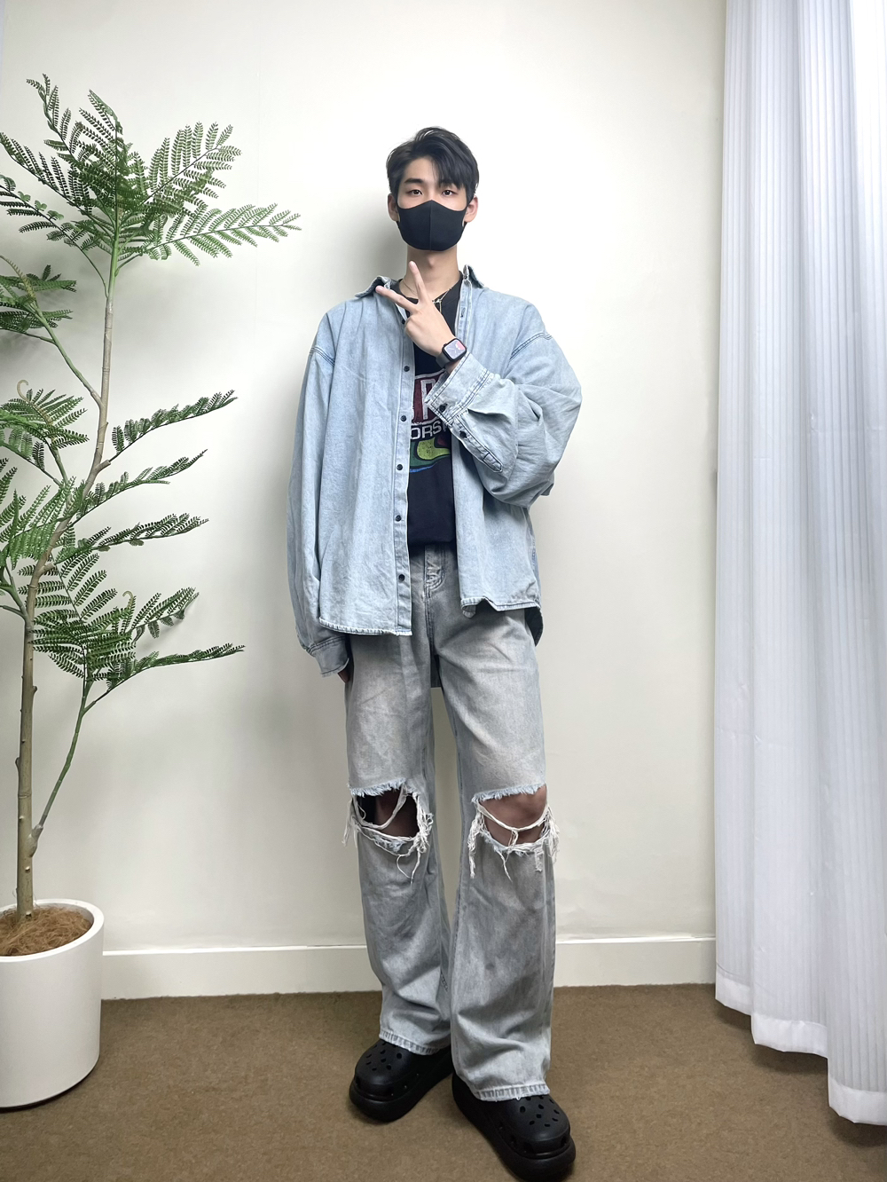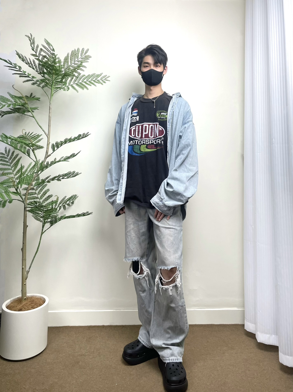 天空般蔚蓝色☁️的穿搭给这个季节增添颜色🎨 👔- 宽松版型的牛仔外套搭配FISH YU黑色T,从里向外美式复古直接拉满❤️🔥 虽然全身都是蓝色系🩵 但是裤子的破洞设计和不同色调的饱和度避免了套装的尴尬 👟- Crocs泡芙洞洞鞋,懒人一脚蹬,增高的同时还能融入这套搭配风格里