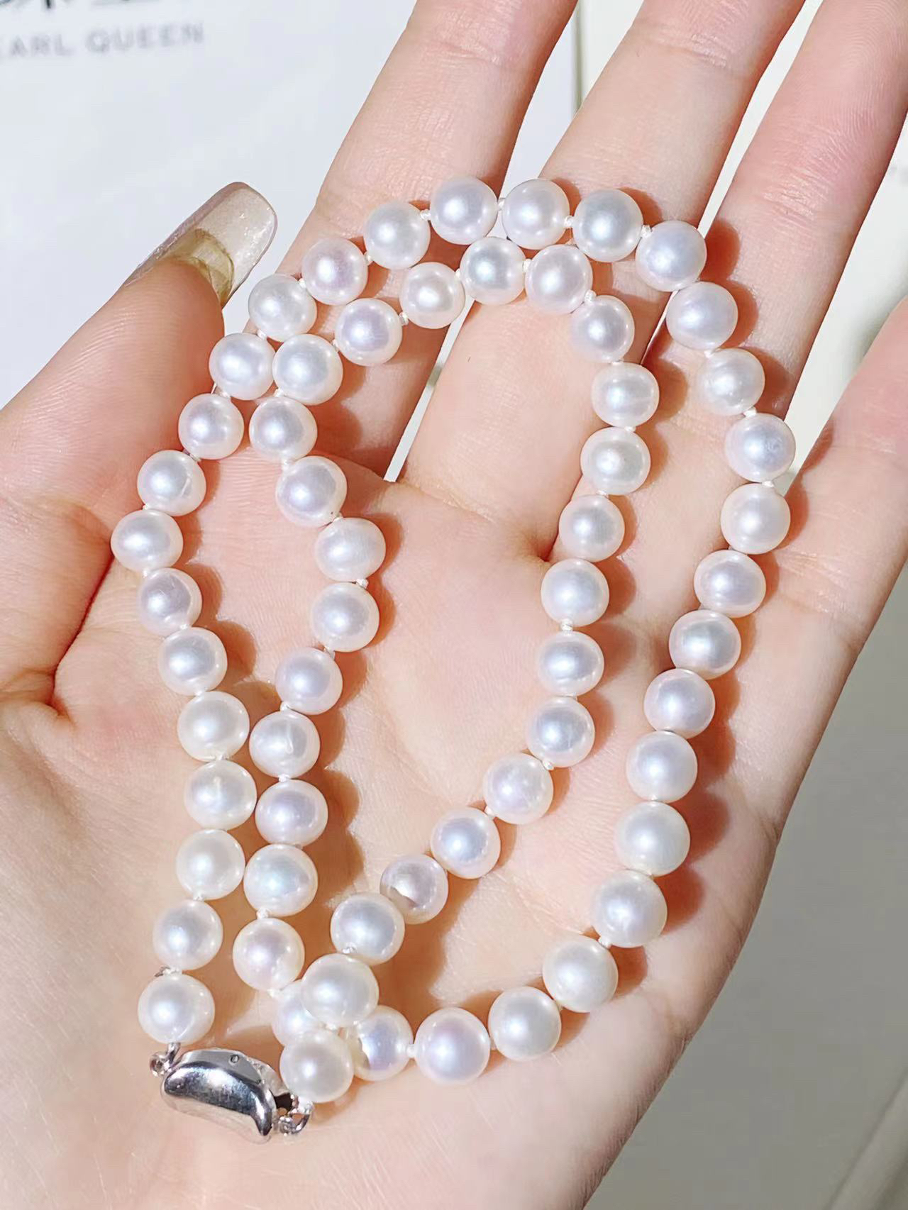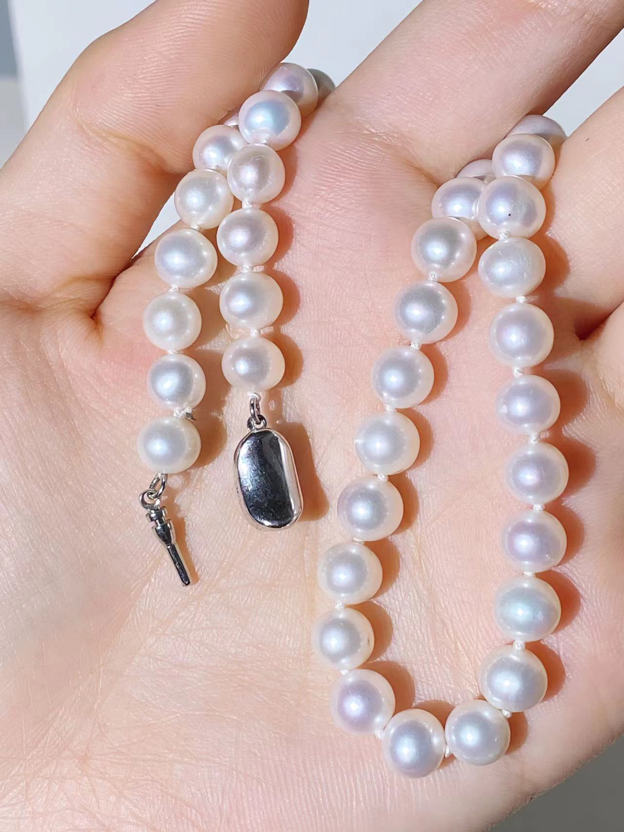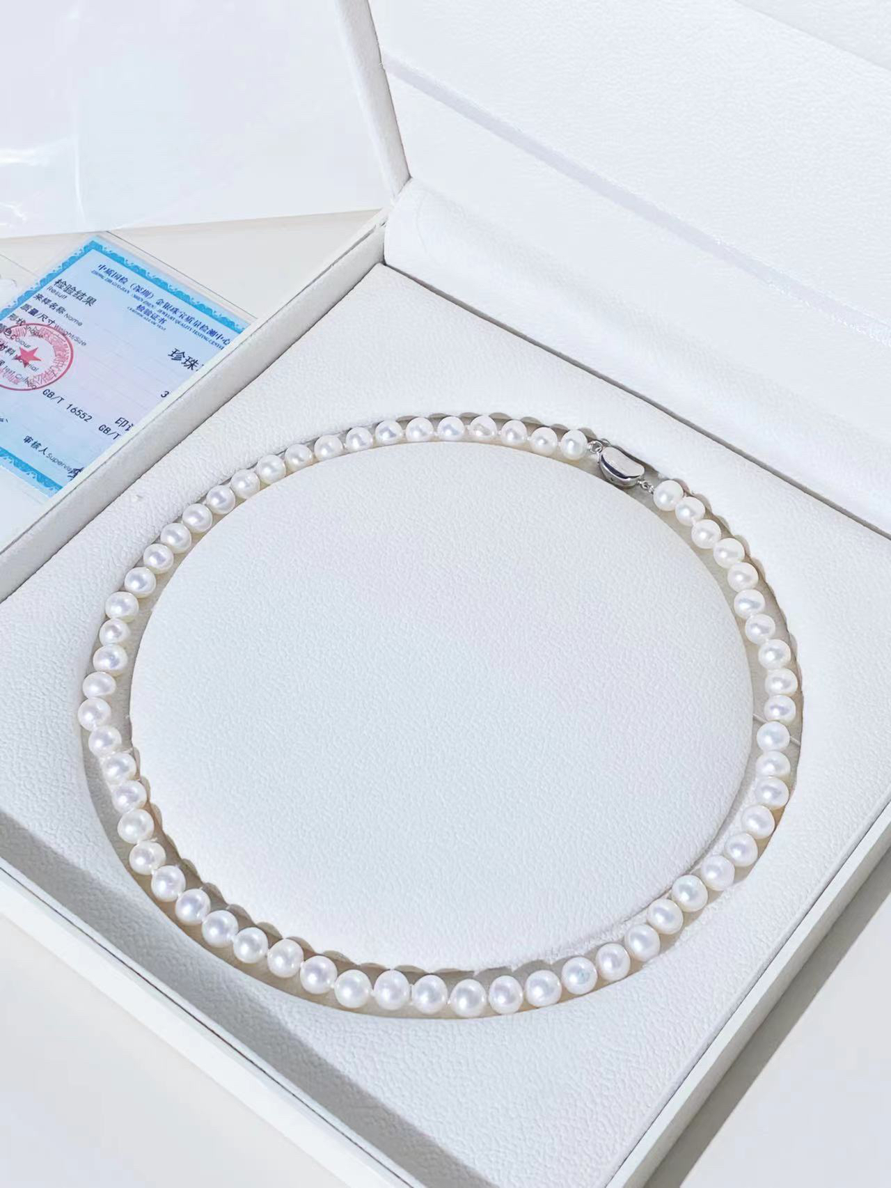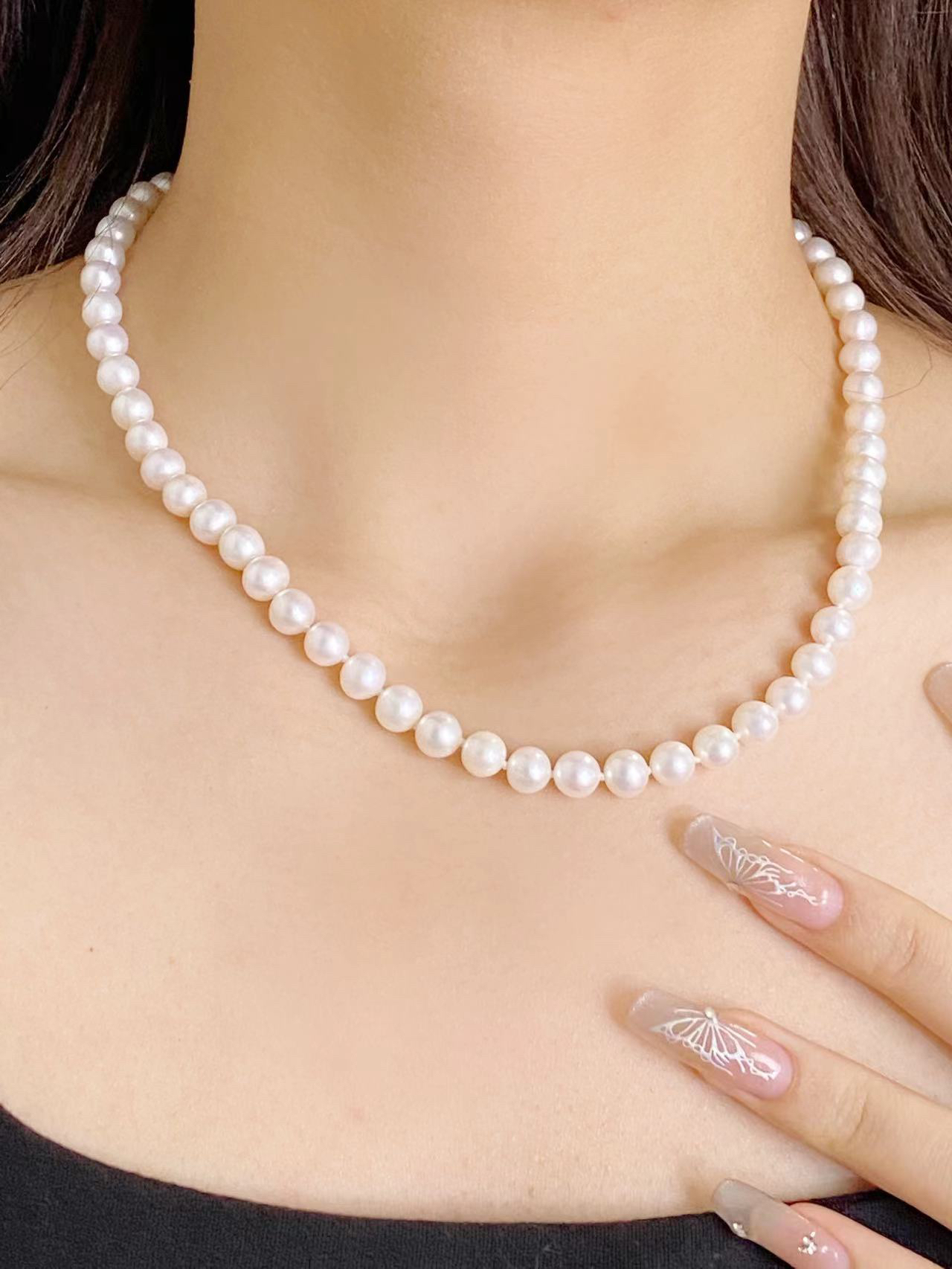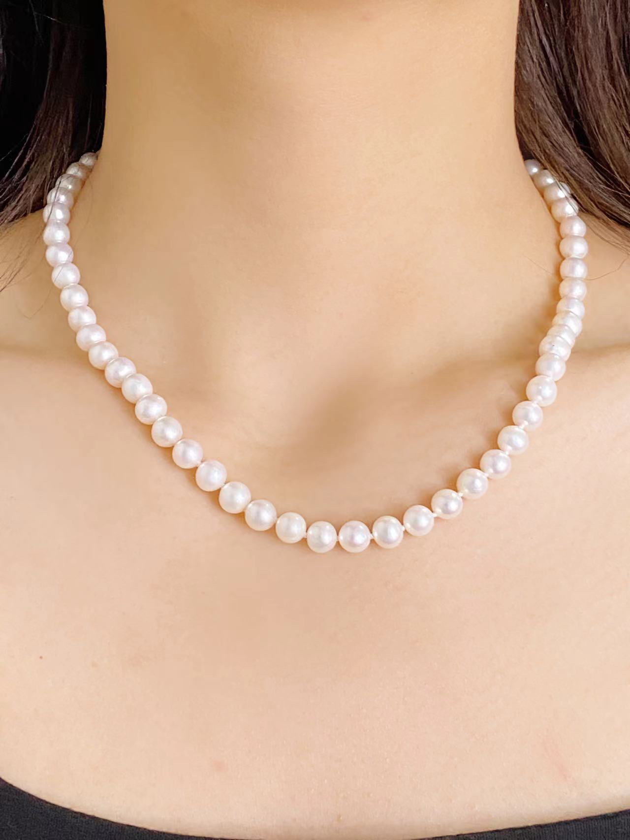 终于get到珍珠项链的美啦!! 冬天的穿搭沉闷,搭配一条亮眼的珍珠项链 百搭又显气质~ 7-8mm的珍珠,圆润饱满,质感满满。 经典的珍珠项链,贵气感十足,无论怎么搭配都好看!