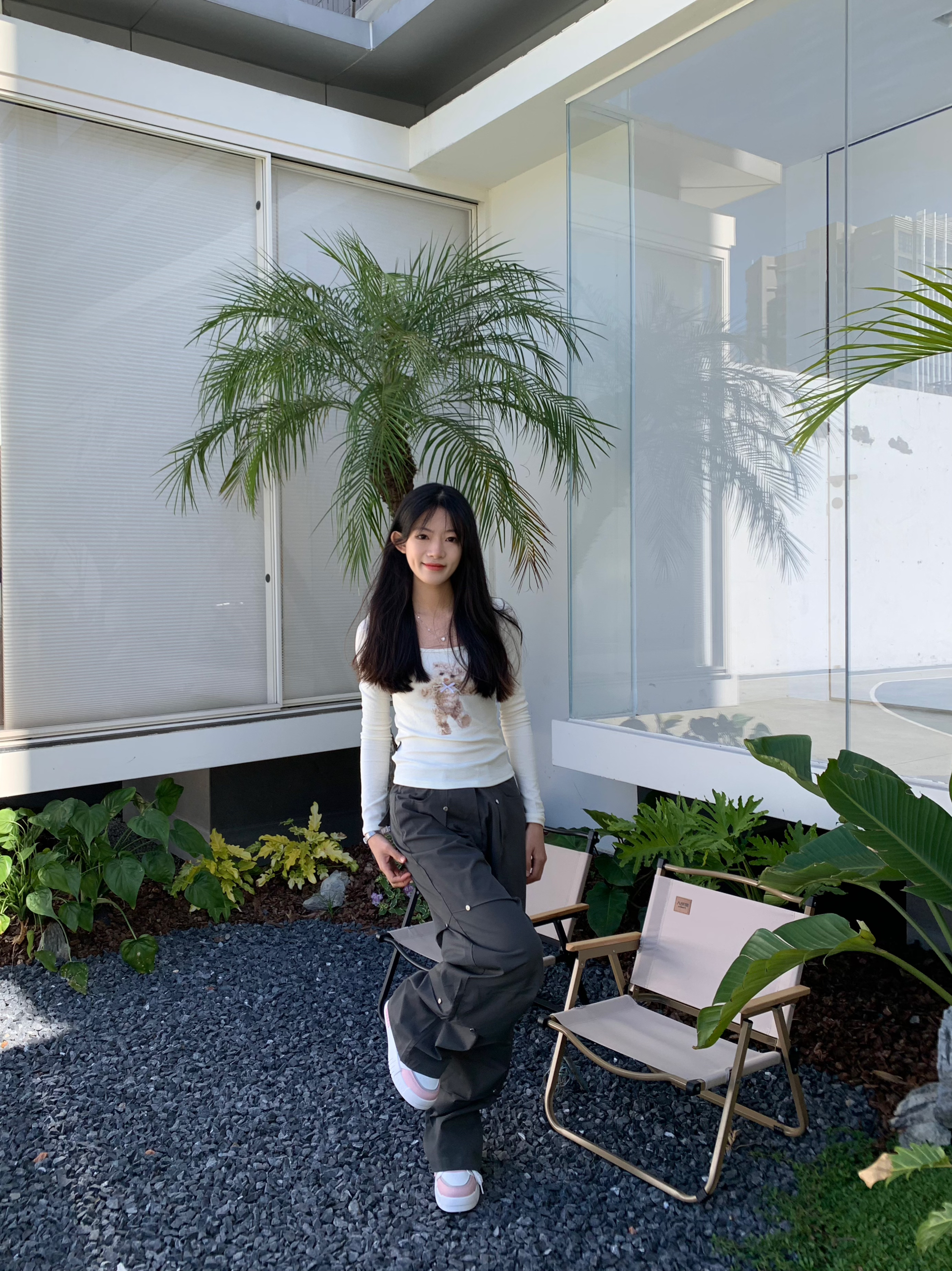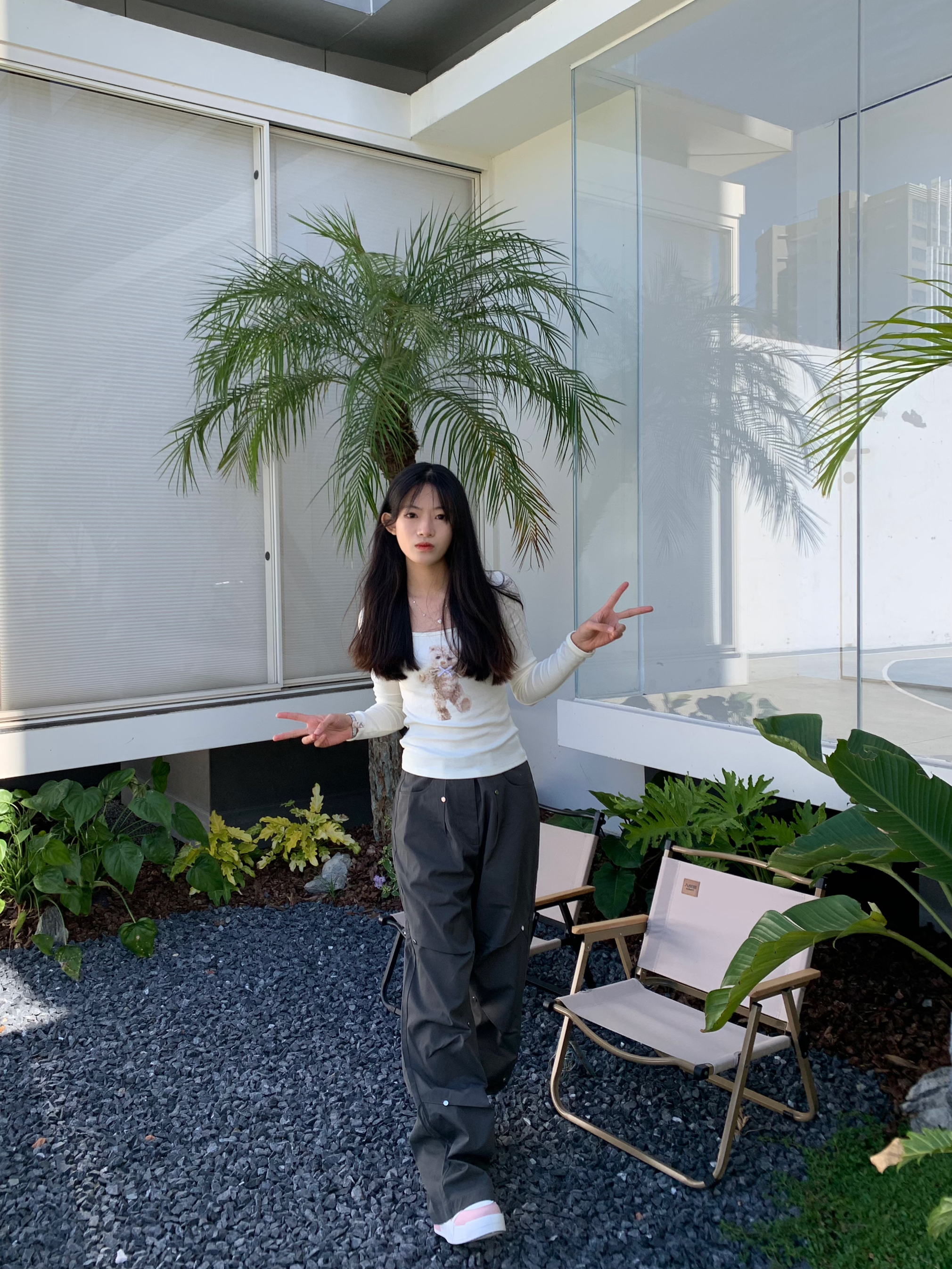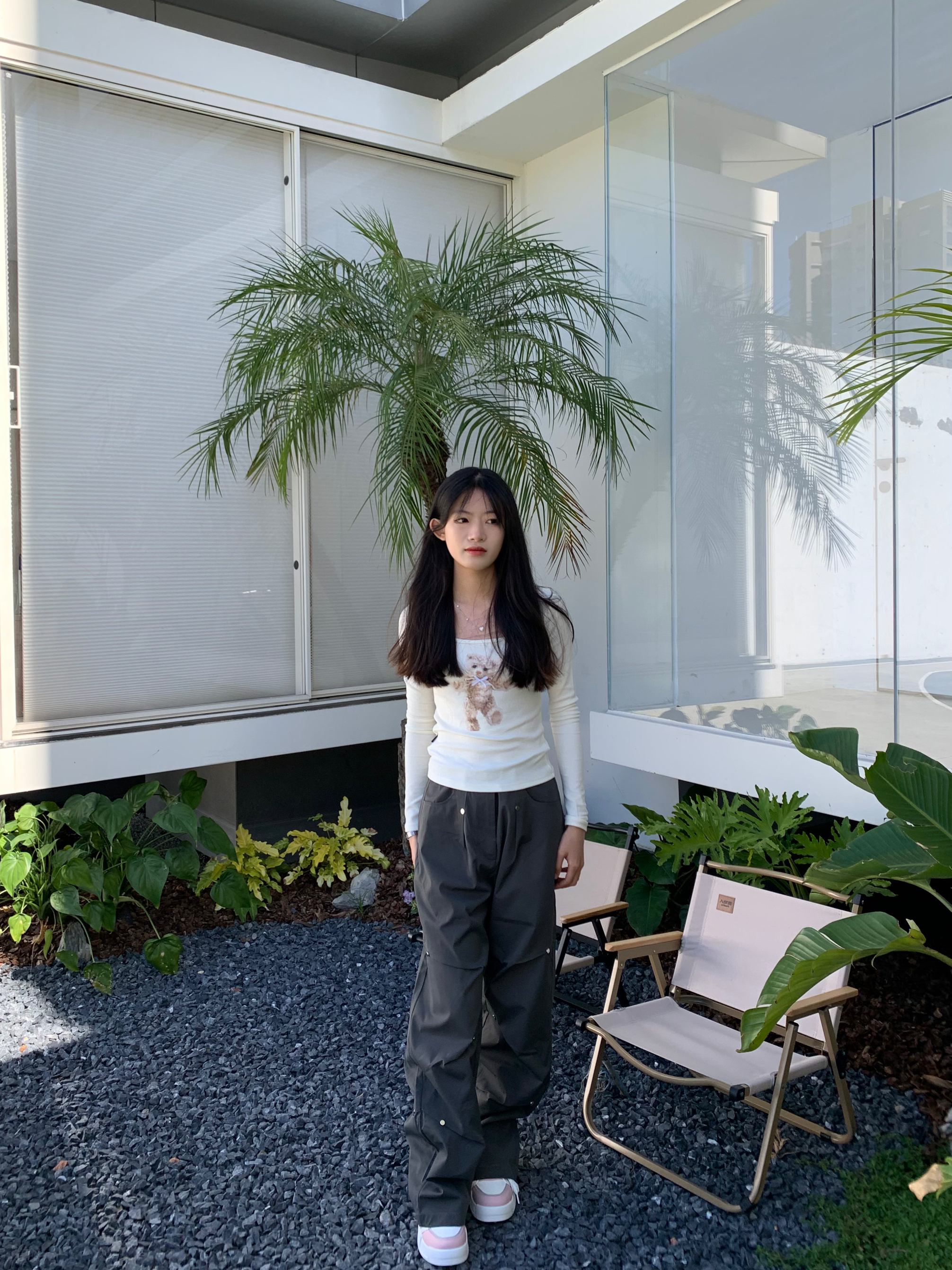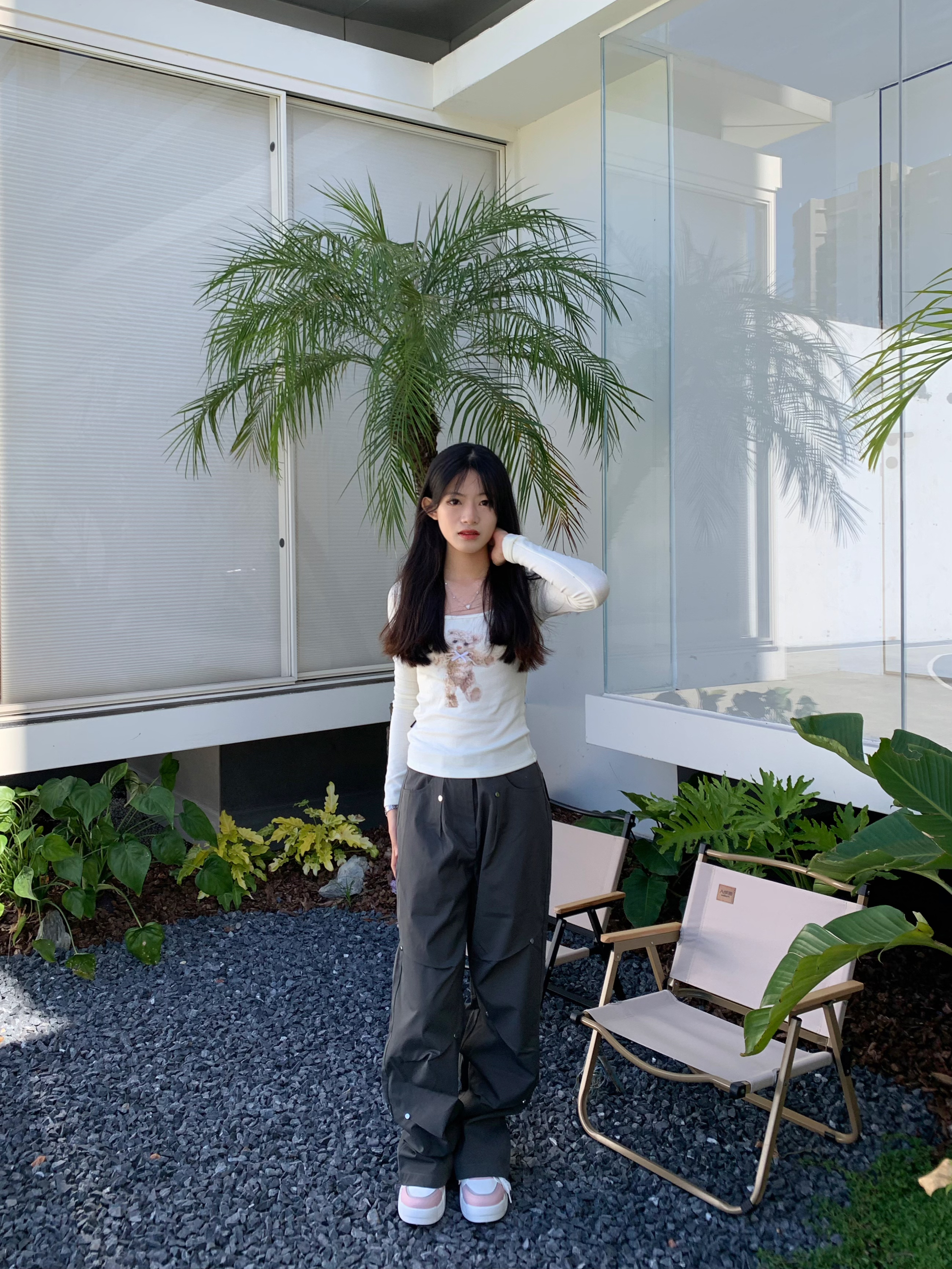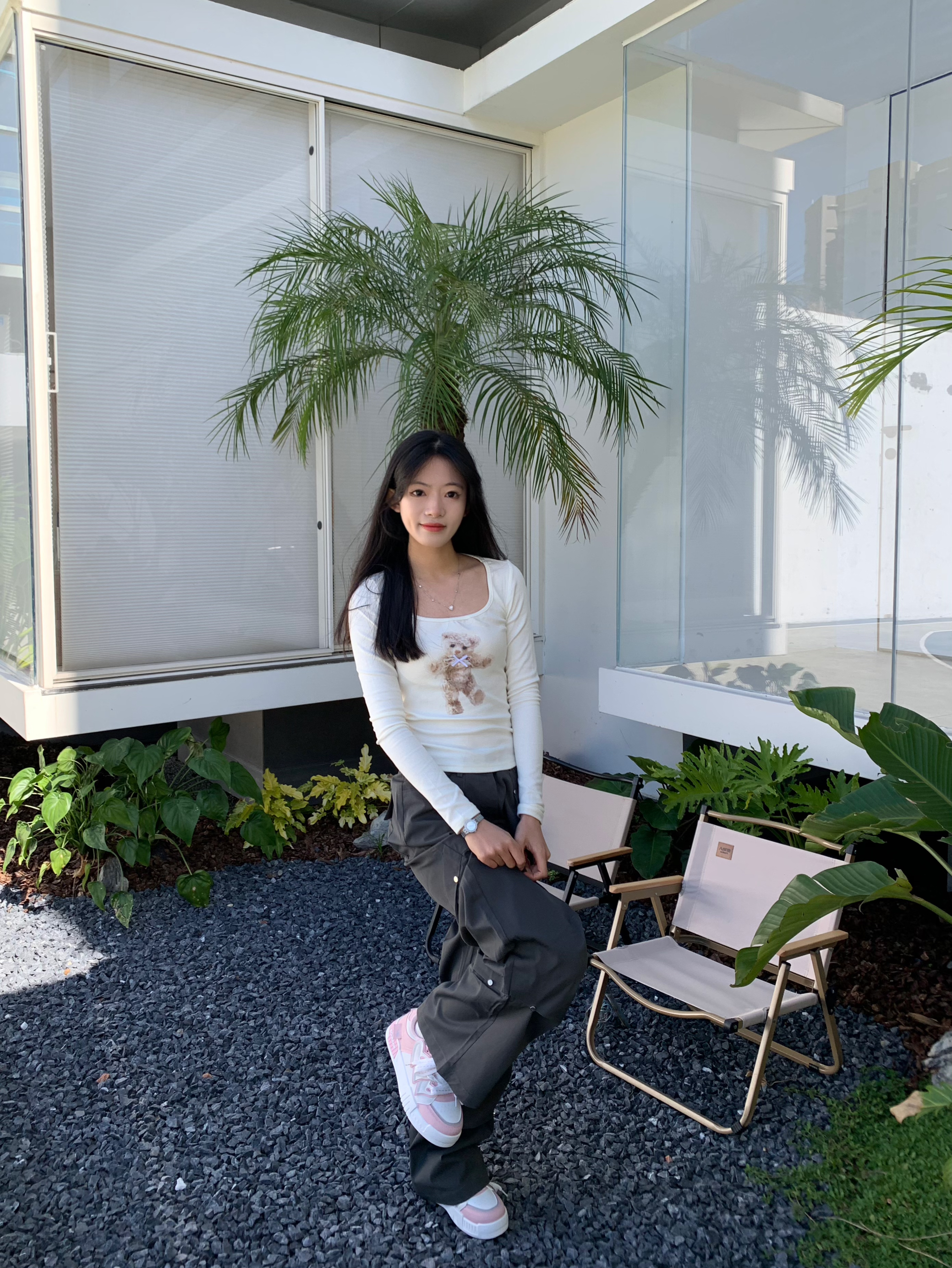 又到了温柔惬意的下午茶时光 喜欢这种简单干净的穿搭 小熊蝴蝶印花T谁能拒绝呢 面料弹性有质感 能很好的修饰腰部曲线 搭配休闲工装裤 嘎嘎出片