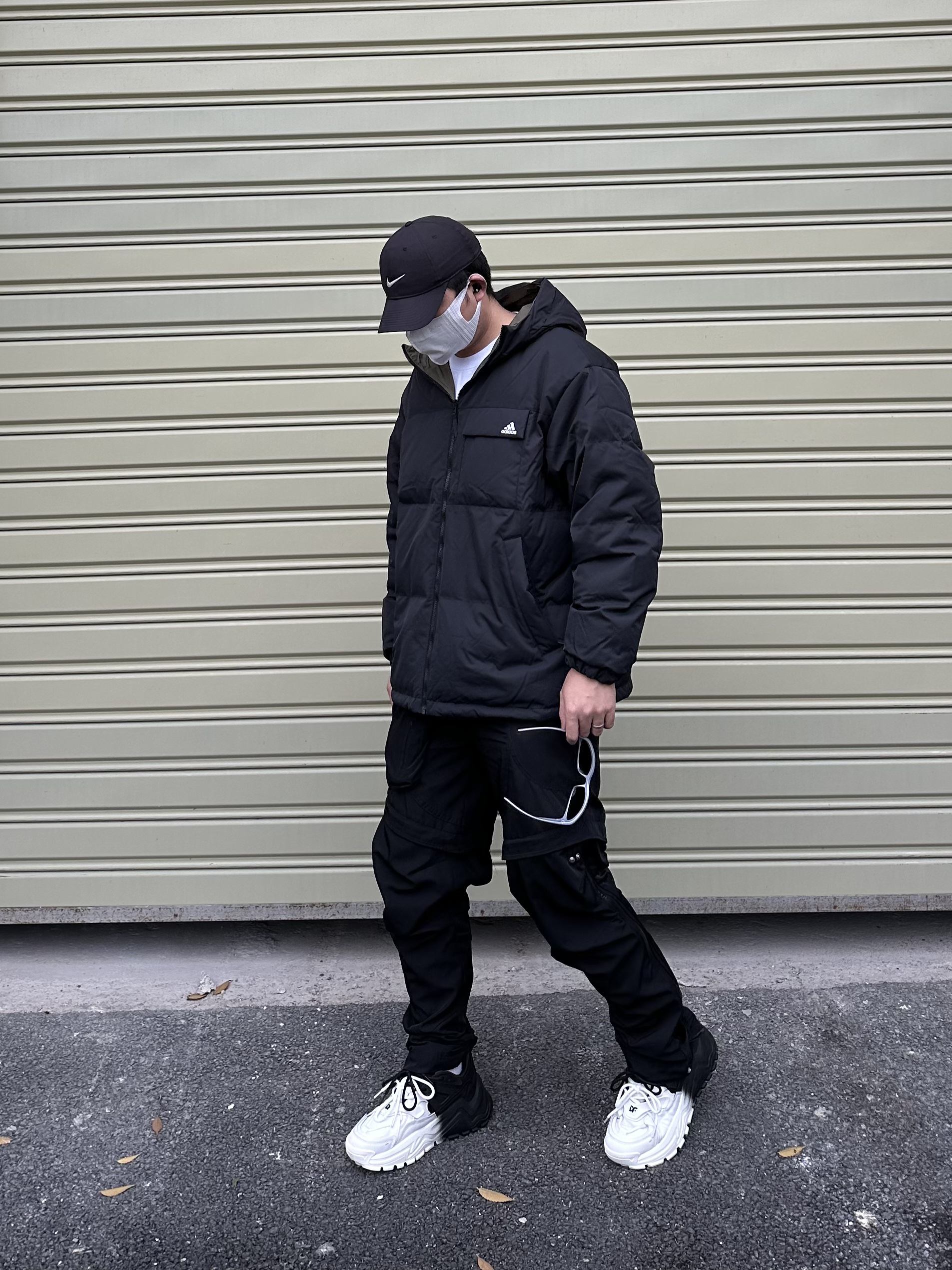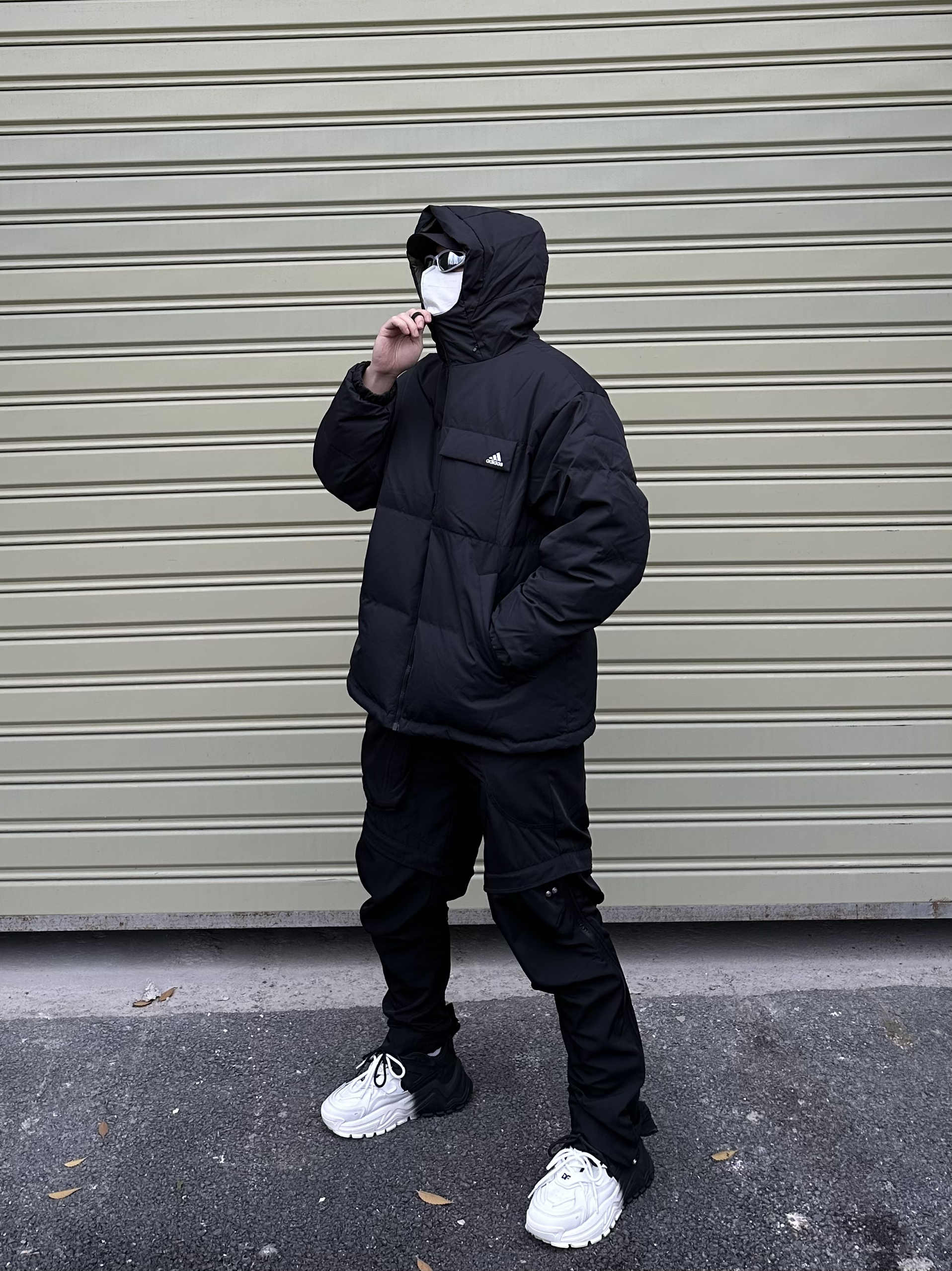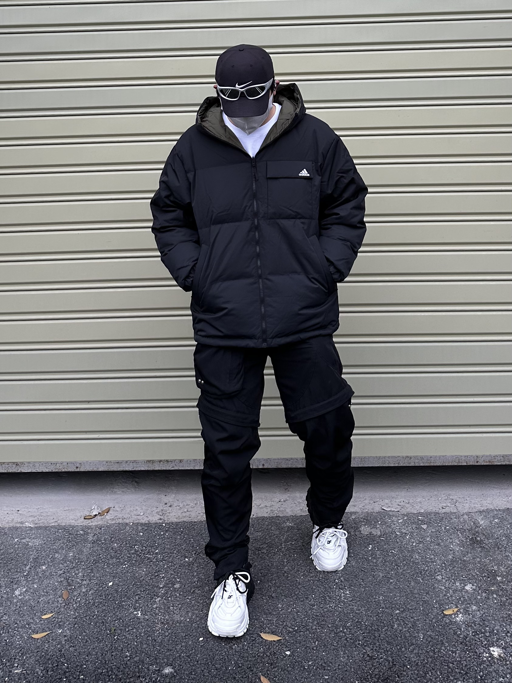 羽绒服和尼龙裤的搭配 保暖又不失风格 搭配一对黑白配色老爹鞋 整体黑白配的搭配 耐看又不挑人