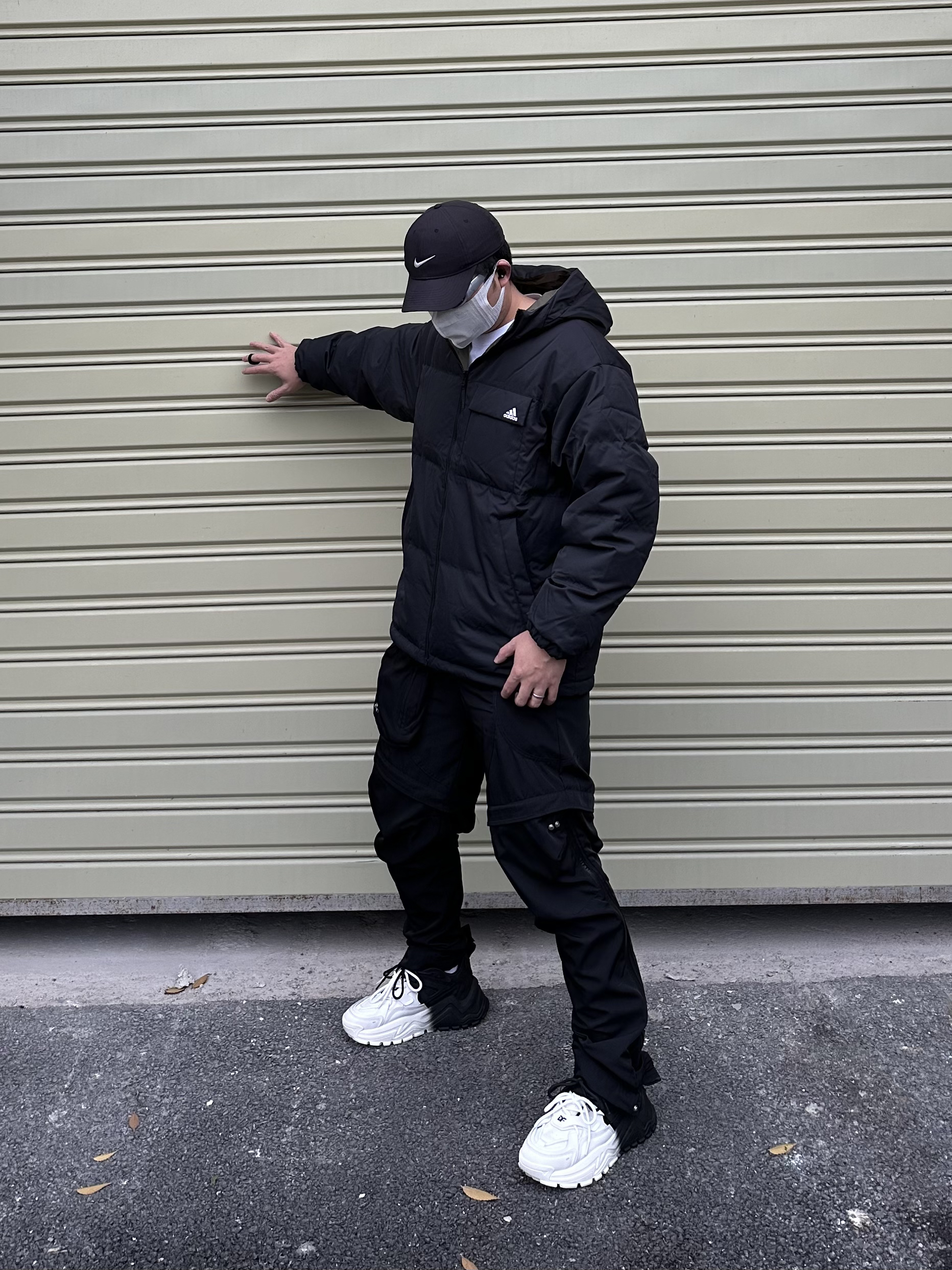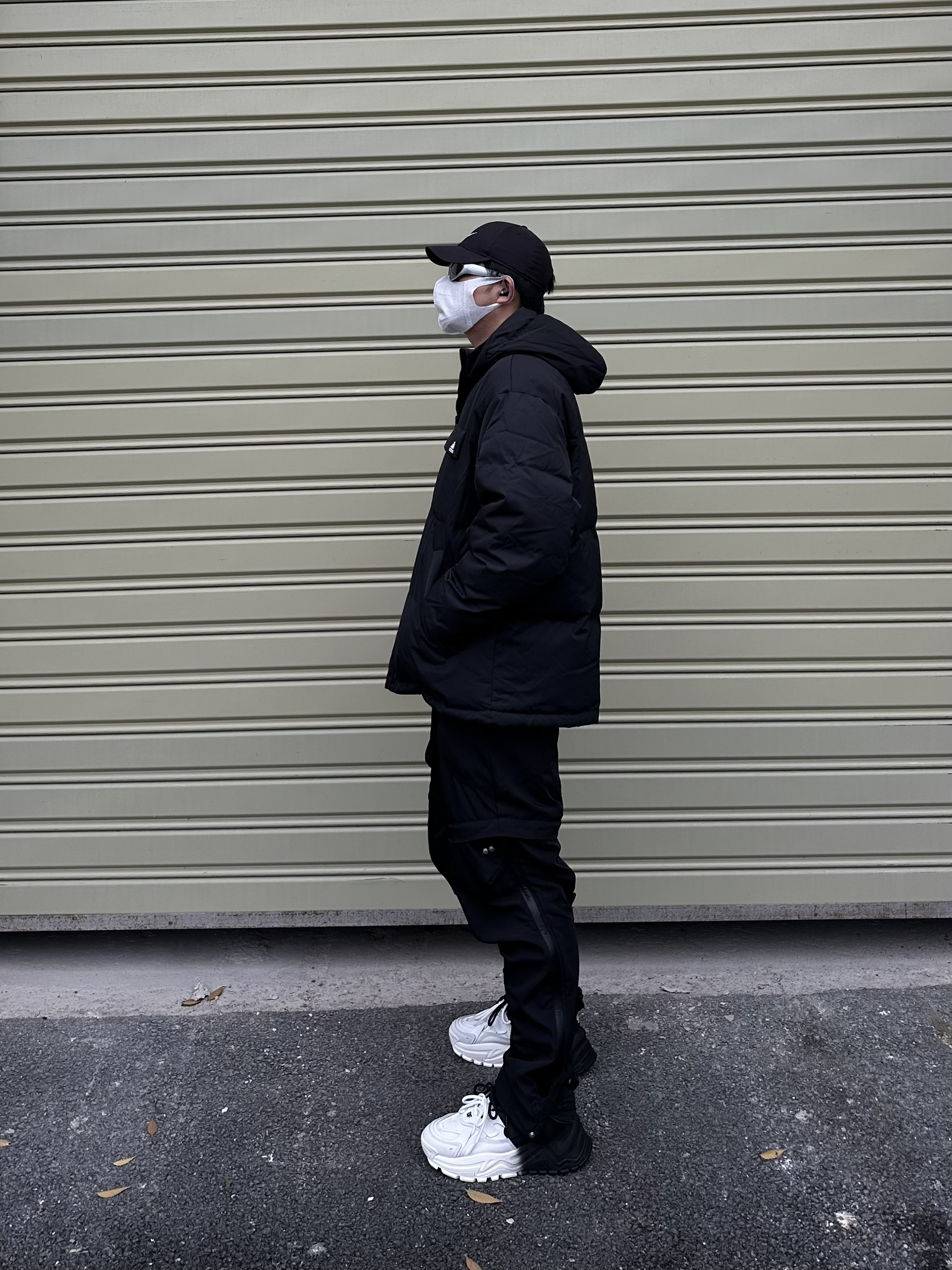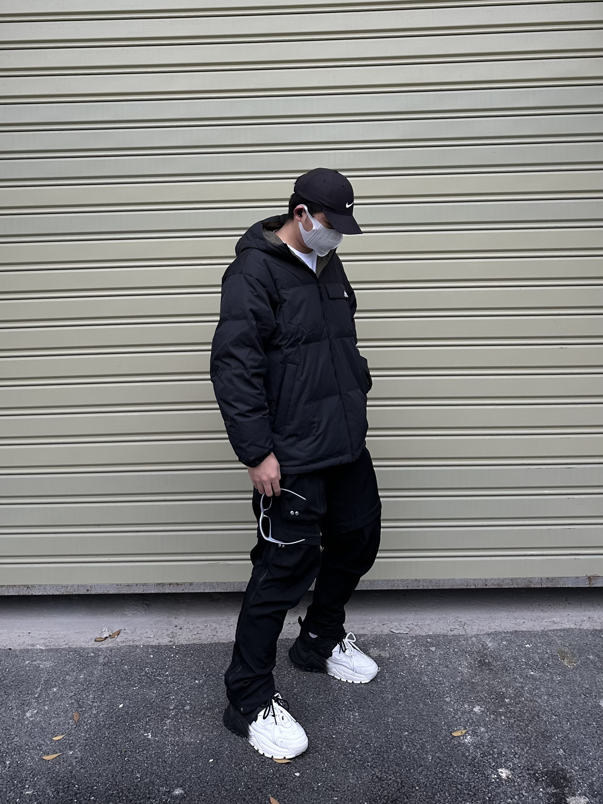 羽绒服和尼龙裤的搭配 保暖又不失风格 搭配一对黑白配色老爹鞋 整体黑白配的搭配 耐看又不挑人