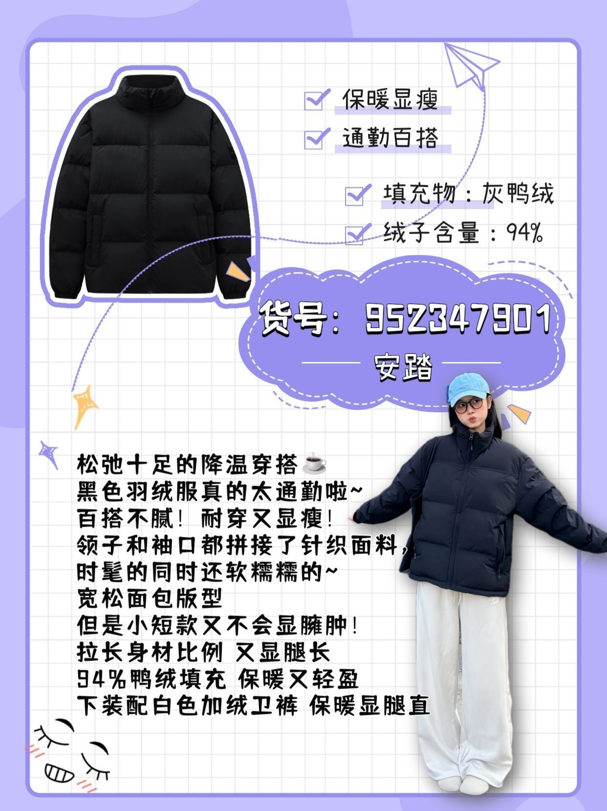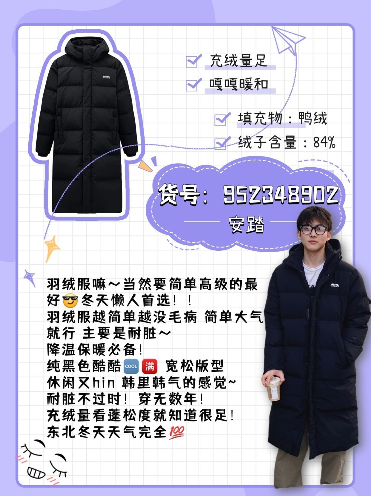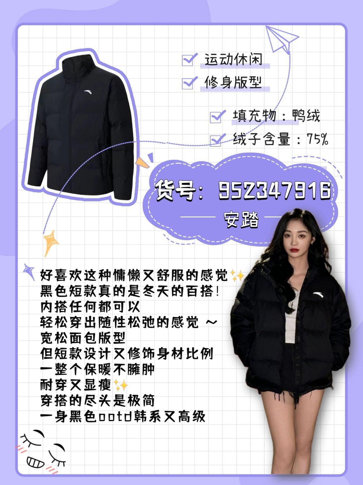 有没有人一样 跟我一样喜欢蓬松又柔软的羽绒服 不压个子舒适又实穿的款 👇 我整理了一下 安踏这个品牌性价比之king的六件羽绒服 1⃣️ ins风高级感all black 很低调洋气的颜色 大胆预测今年会🔥 三防面料处理 充绒量足 上身整个就是蓬松柔软保暖 两色 还有个实穿的黑色(货号:952348902) . 2⃣️长款羽绒服怎么能没有呢 冬天陪我去过西藏雪山的羽绒服 过膝保暖长度 重点是不显胖...