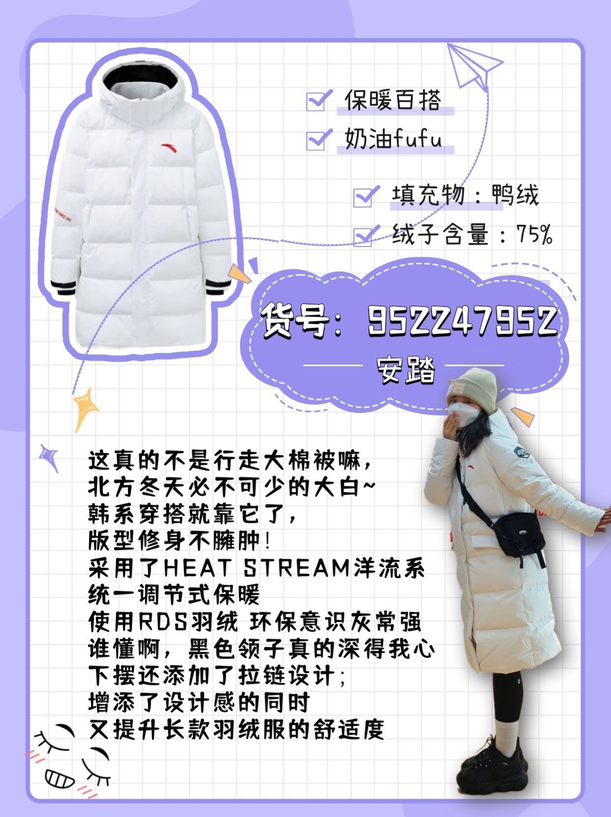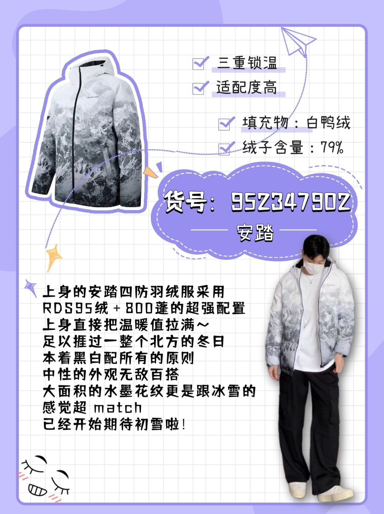 本篇笔记关联了Anta/安踏 综训系列CHI系列四防科技保暖连帽过膝鸭绒羽绒服 952247952 纯净白、【王一博同款】Anta/安踏 四防科技速暖防泼水防风防油污短款鸭绒羽绒服 952347902 纯净白/向山而行、【王一博同款】安踏 综训系列六度芯科技雪壳四防科技防风加厚抗寒防泼水防油污速暖立领短款长袖灰鸭绒羽绒服 952347901 基础黑等商品,为用户提供真实的使用体验和购买参考。