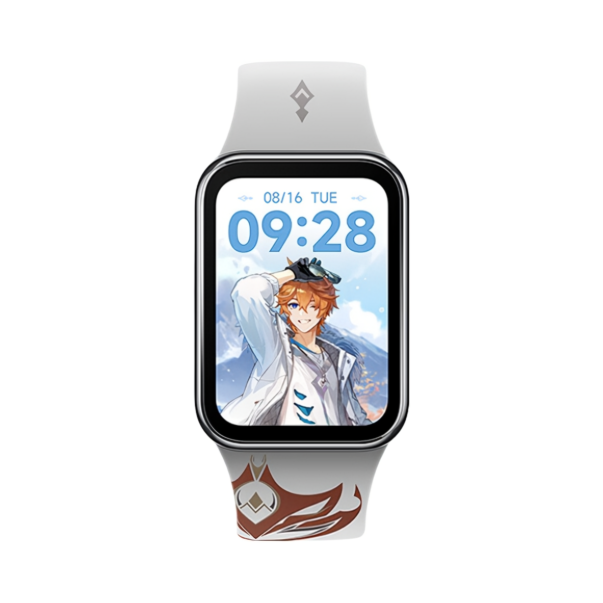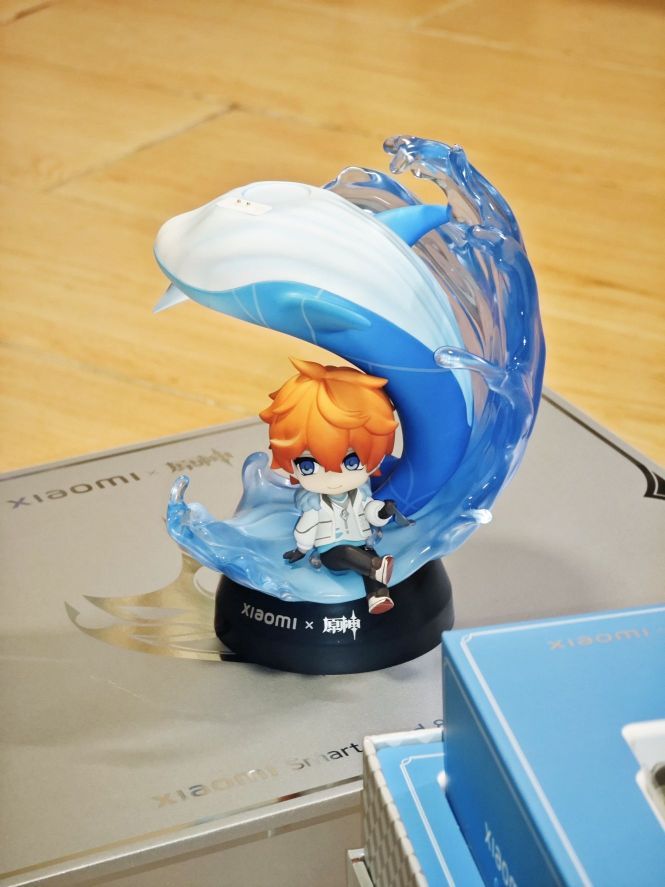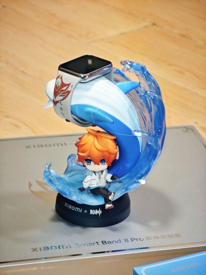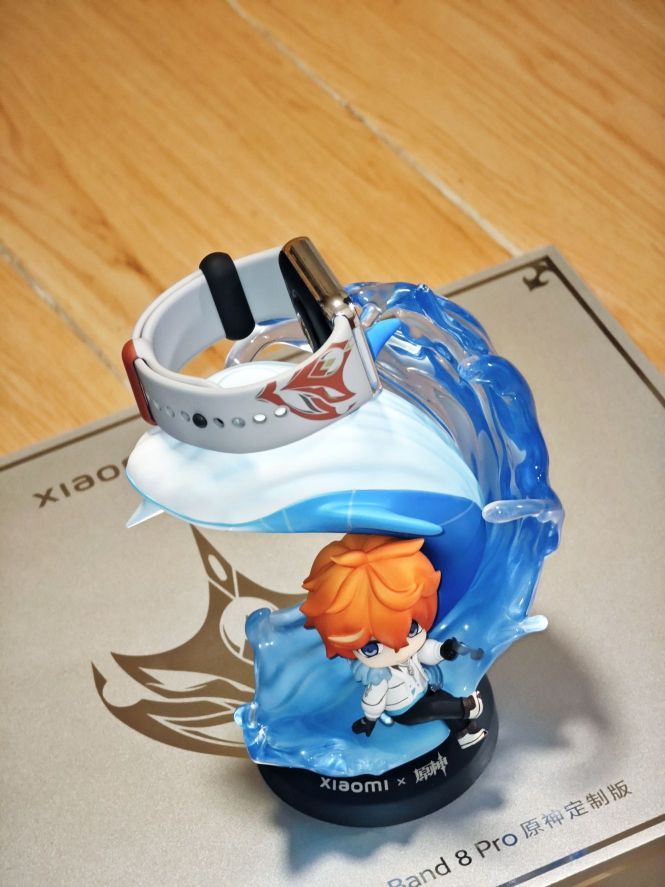 小米与原神定制版主题礼盒,联名的是原神里面的达达利亚角色进行深度定制,礼盒内包含了手办造型的充电底座、联名贴纸、达达利亚海报一张。同时在手表的腕带上印有公子的面具图案,联名的设计细节还是很到位。我已经被这个精致的Q版的手办所吸引了。