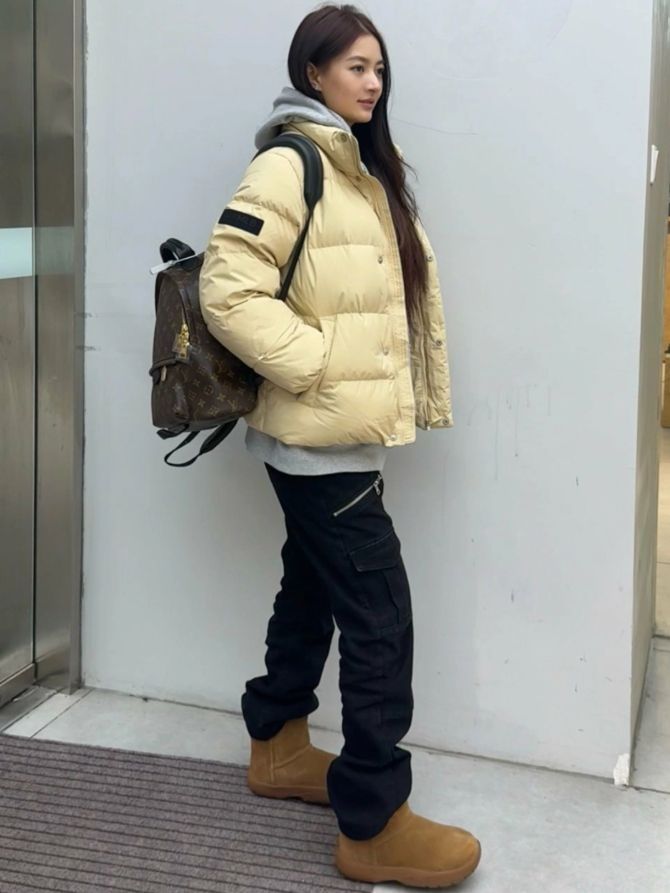 奶fufu的米白色MLB羽绒服有谁不爱吗?? 经典的立领小标设计,整体简约又百搭,宽松韩式版型,上身效果完全不臃肿,充绒量很良心,肉眼可见的蓬松感! 内搭建议和我一样,搭一件浅灰色连帽卫衣,下装运动裤+棉靴,这一套的保暖性去东北都没问题!