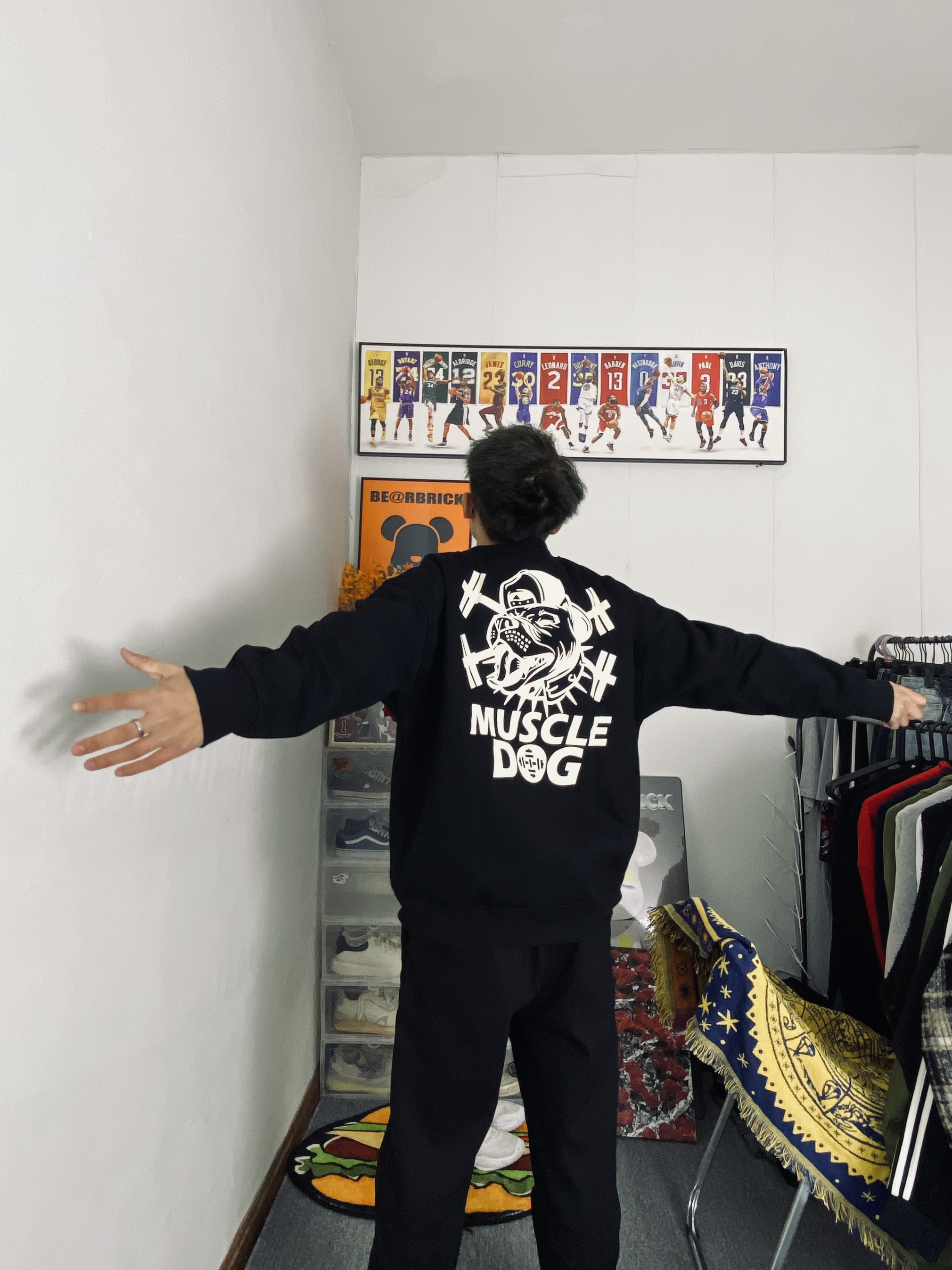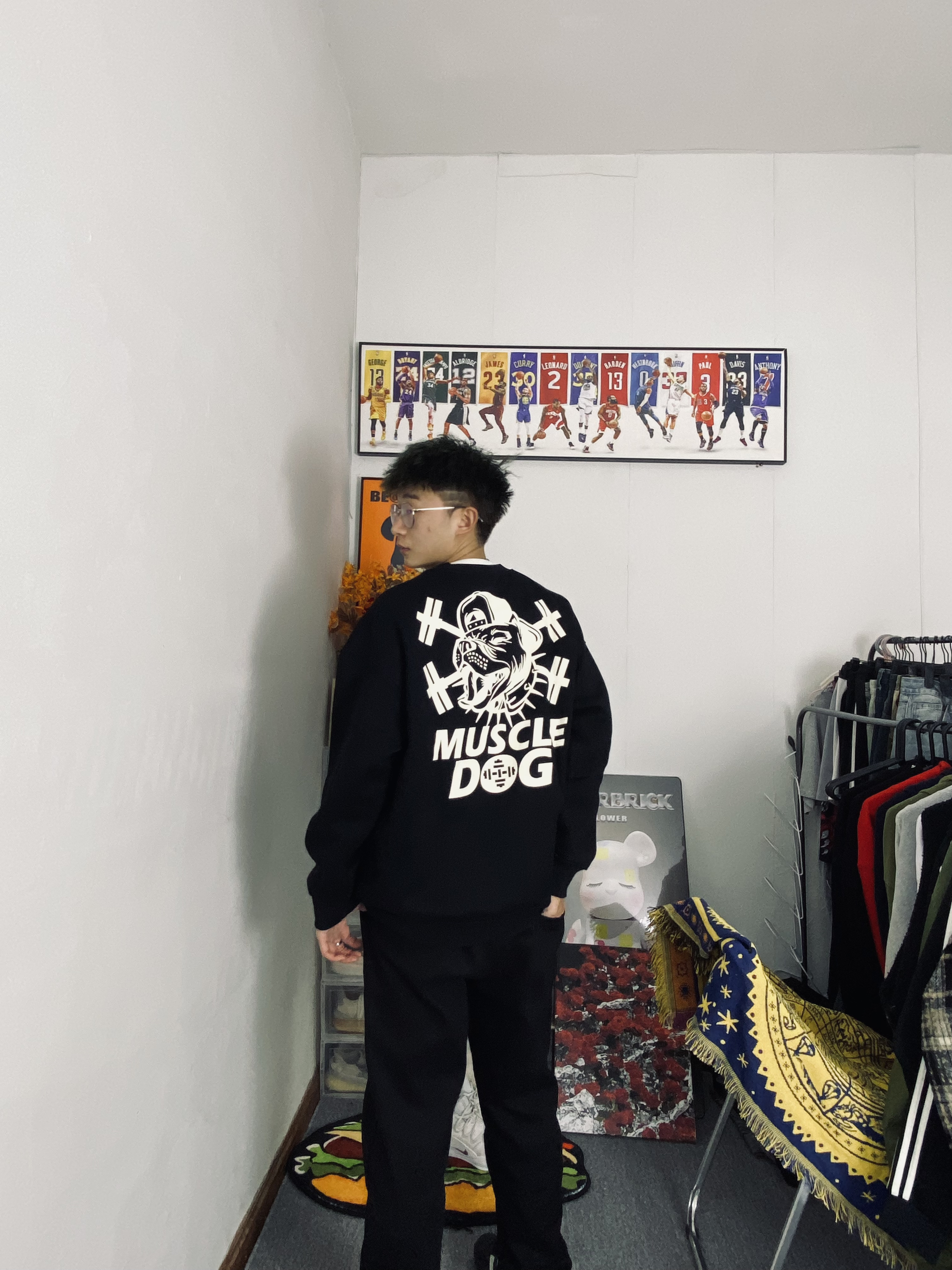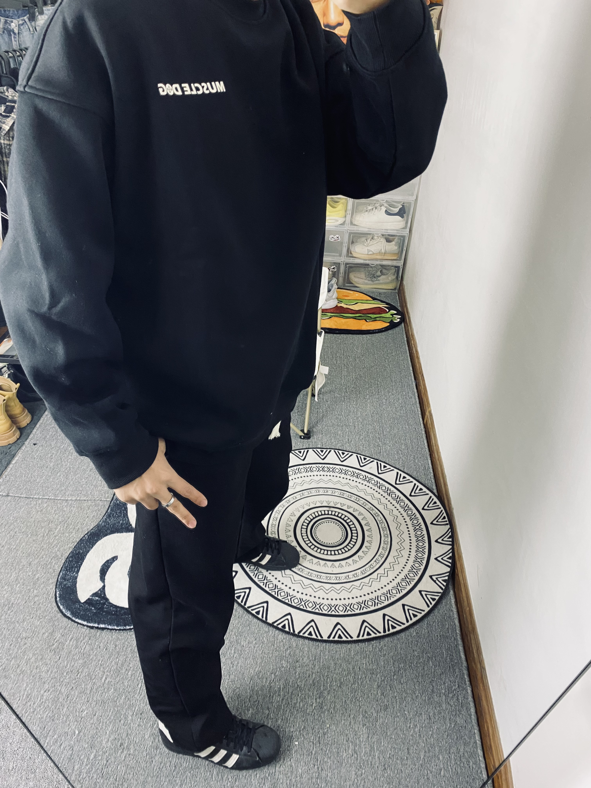 🌈今日冰美式穿搭 👔今天衣服上身的是一件黑色加绒保暖长袖冬日卫衣 我个人比较喜欢他叫背后的品牌印花logo好帅 衣服整体是偏宽松的里面有一层加绒增加保暖性 — 👖裤子的话就穿了一件黑色直筒裤 黑色比较百搭直筒裤的版型又能修饰我腿型 有时候不懂搭配我就一身黑🥹 身高/体重:178/130 👔xl