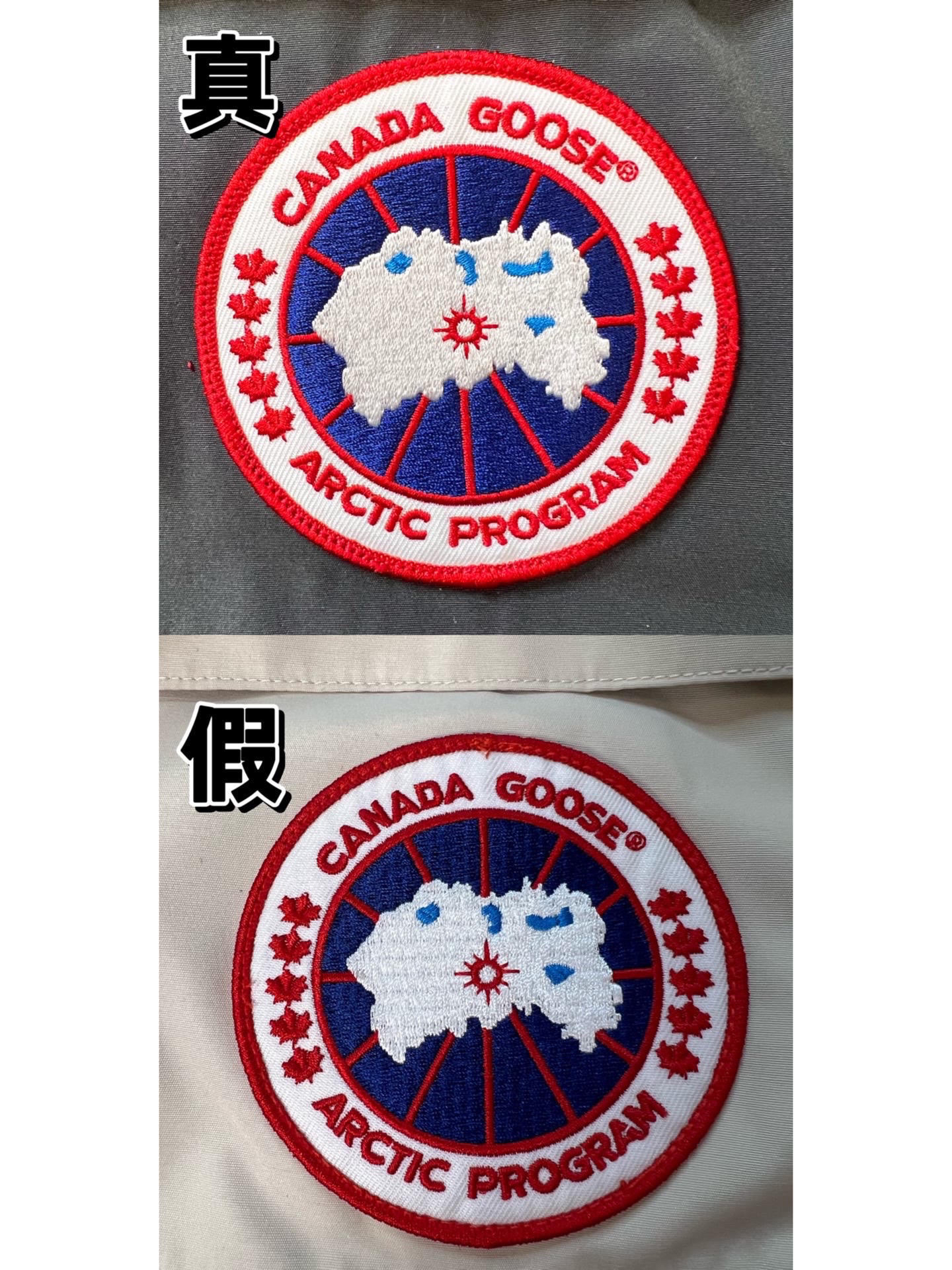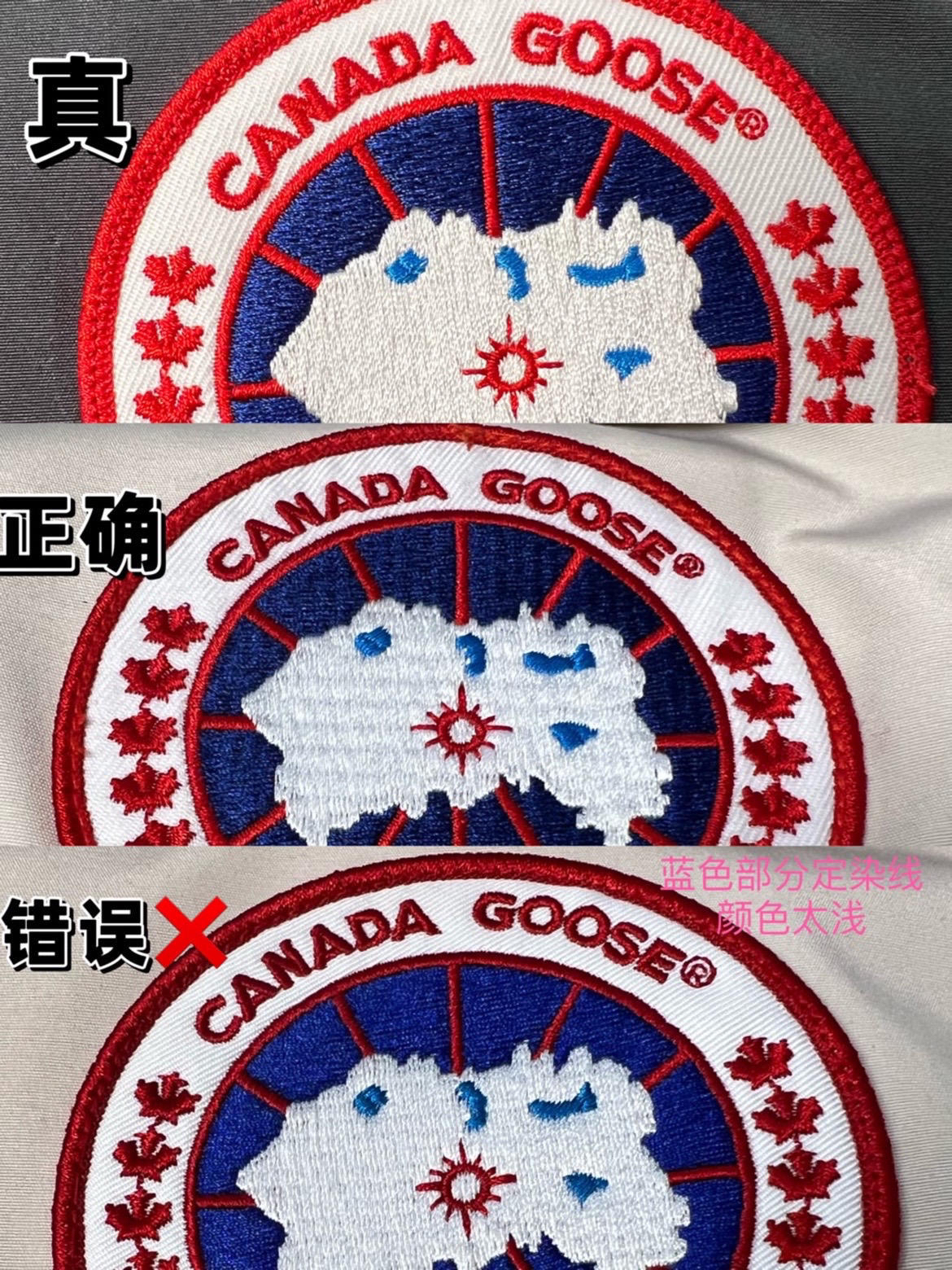 随着冬天已至气温骤降,薯薯们也纷纷开始准备自己的冬日装备了吧,我在这也贴❤地为薯薯们献上加拿大鹅的基本鉴定方法。内容不多但是还是挺简单有效的 先看刺绣 加拿大鹅logo的相当复杂,市场上很难做到它的程度,所 以从刺绣大logo部分很容易看出差距。 CanadaGoose的ogo刺绣部分纹理质地细密;枫叶刺绣边缘清晰,枫叶没有明显连针。 Xlogo刺绣部分纹理质地稀疏粗糙;枫叶刺绣精细度差, 有连针...