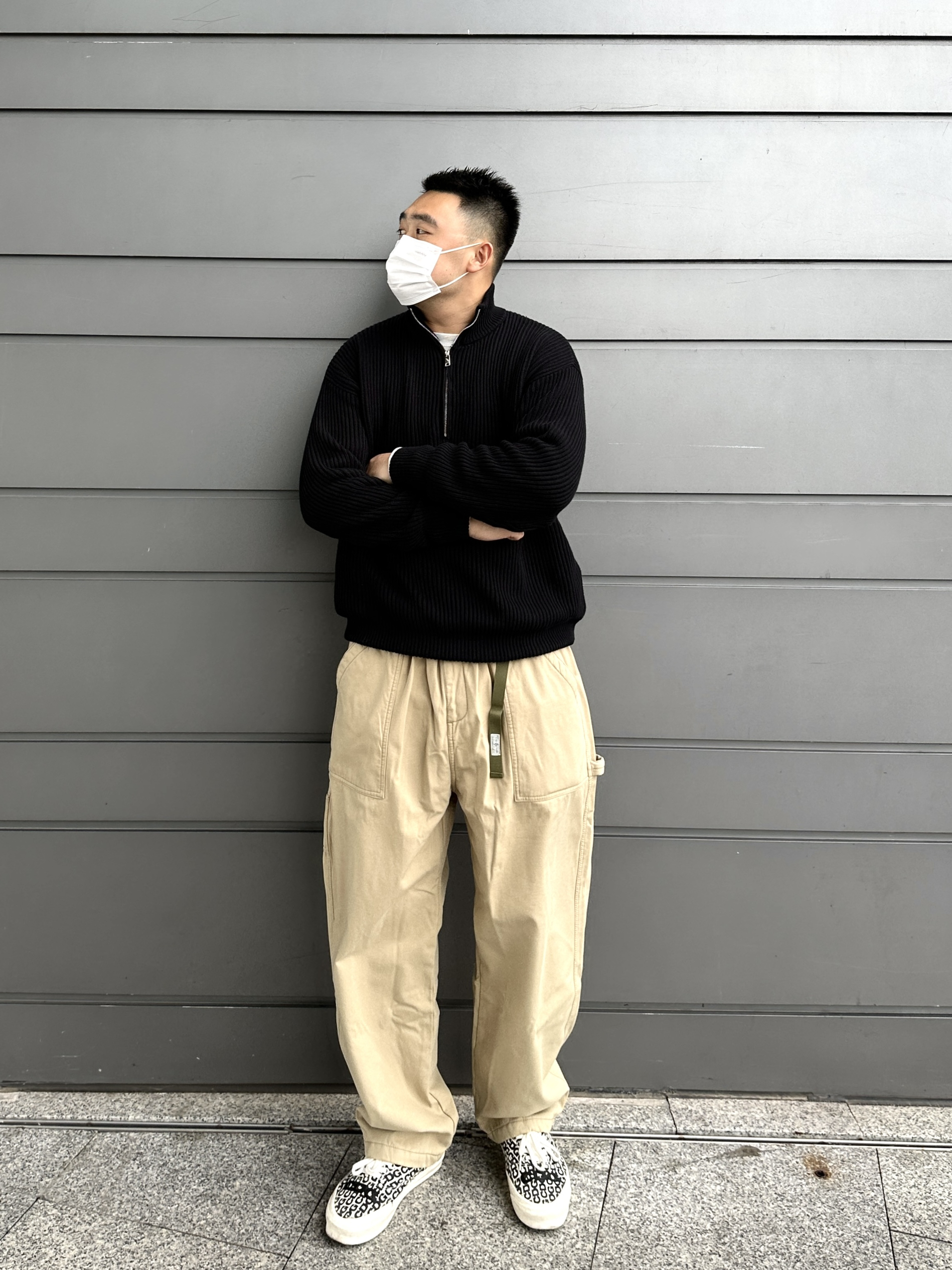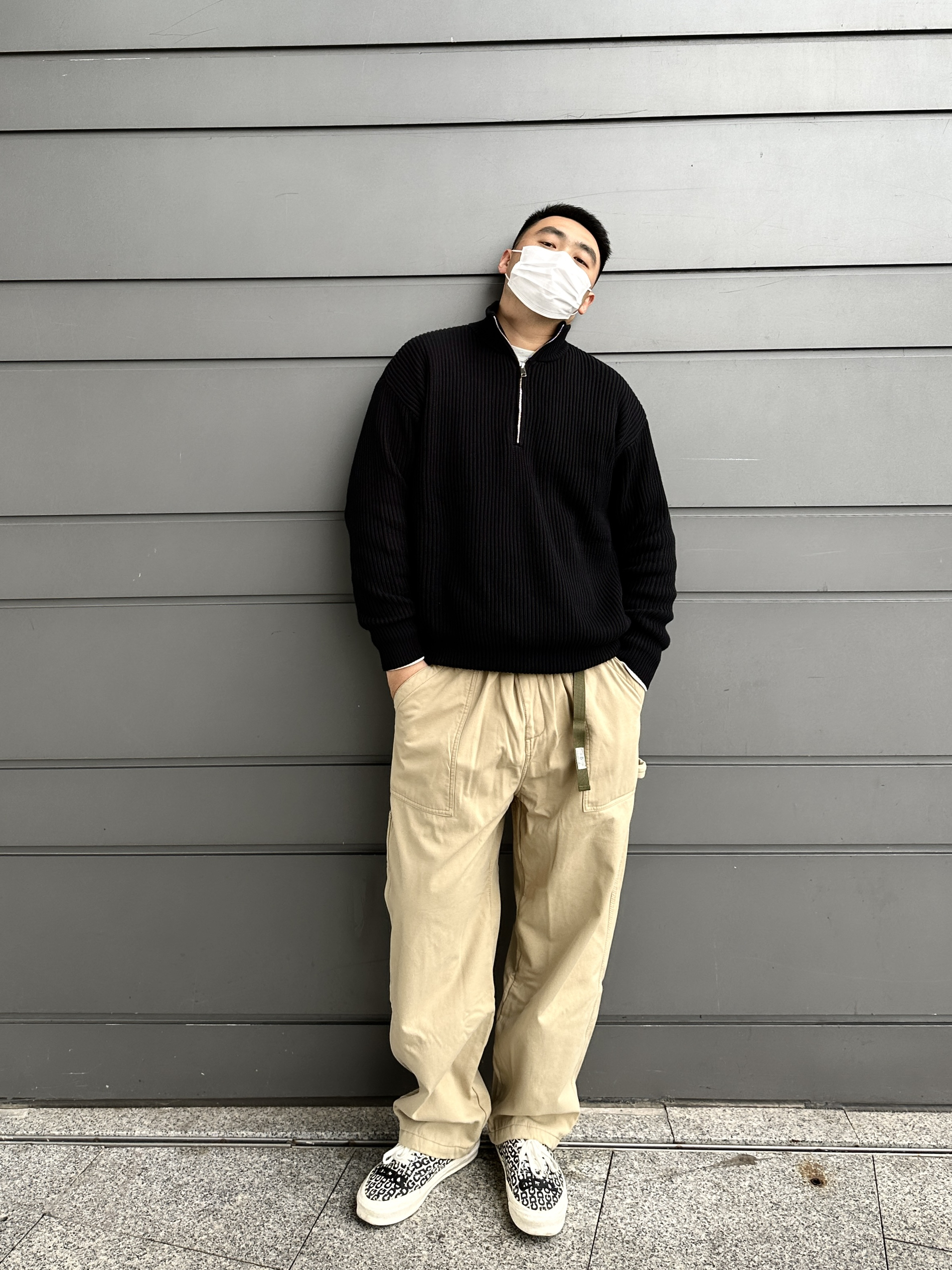 一件黑色半拉链针织毛衣简约时尚 搭配一条卡其色的工装长裤 经典的大地配色适合秋冬 👟:vans&cdg 身高|体重:180|85kg