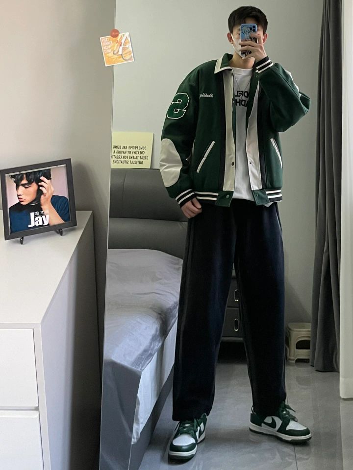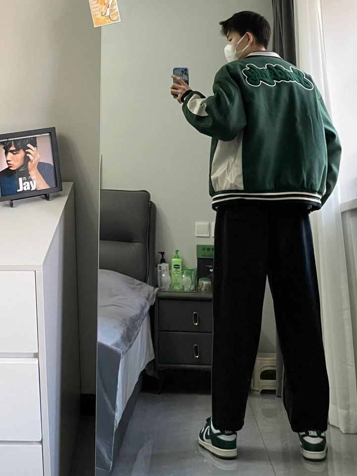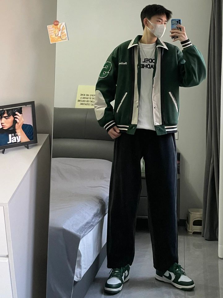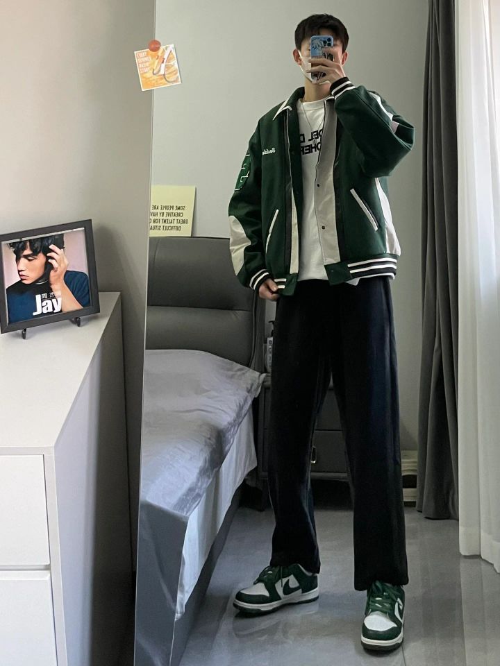 🟢今天分享一款美式复古的棒球服外套 很厚实 ⚫️版型也很好的一件棒球服 学院风十足 🟢绿色棒球服里面搭配一件白T永远都不会出错 ⚫️廓形的外套加上黑色卫裤 立体感很强