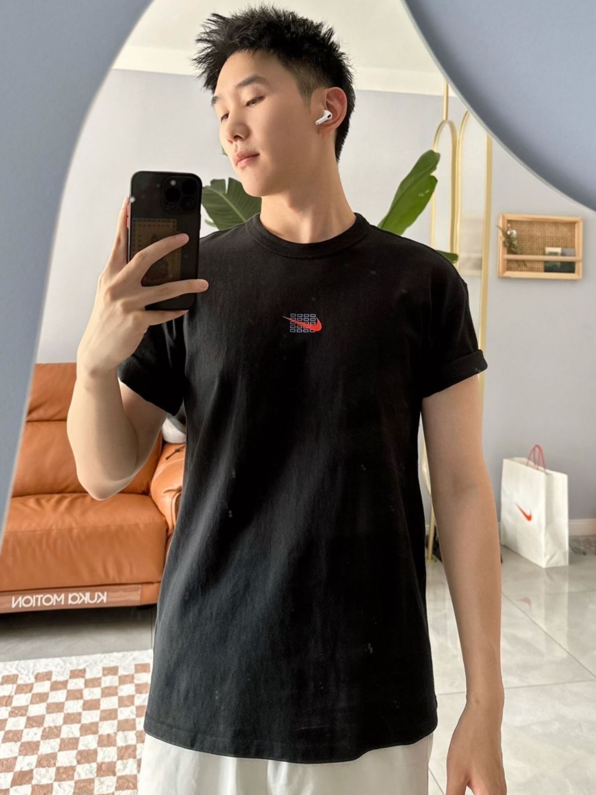 我的多巴胺穿搭 衣服如果是偏长软塌版型的真的可以试一下这样调整 如果衣服太长了可以向内wo进去 短袖T恤袖子因为下摆会外扩(参考喇叭裤裤腿) 所以向上折两折 我发现会显得男生直角肩肩膀没有那么溜肩窄肩了 整体比例都有了调整,黑色白色短袖丁恤都适用,真香! 图源网络侵删