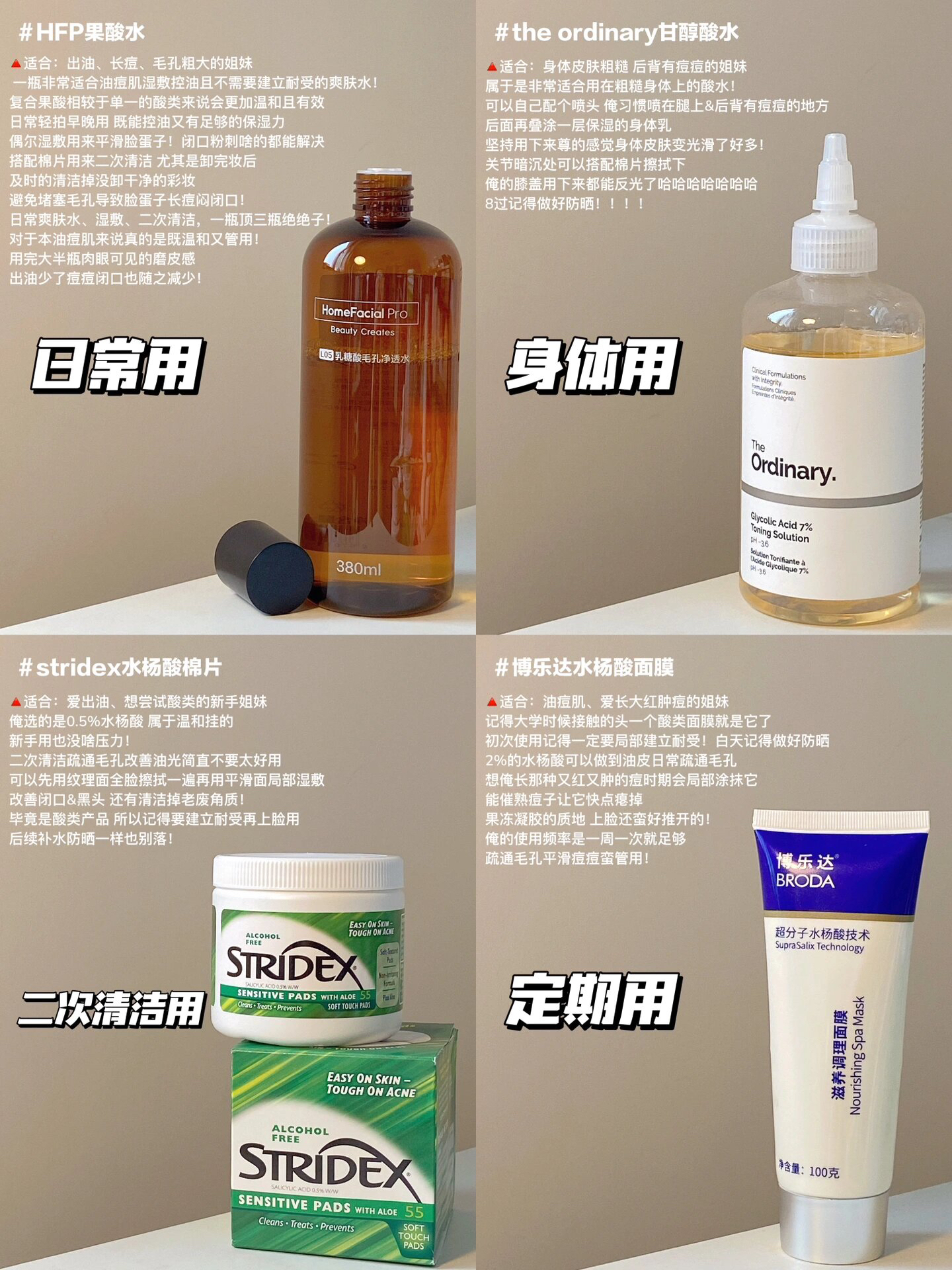 不知道选啥酸类产品的看过来!一些俺的日常酸类产品!从头到脚都能用得上! hfp果酸水-日常用 博乐达水杨酸面膜-定期用 stridex水杨酸棉片-二次清洁用 the ordinary30%果酸精华-身体用 Ps:用酸之后白天需要注意防晒 及时做好补水&修护的准备!