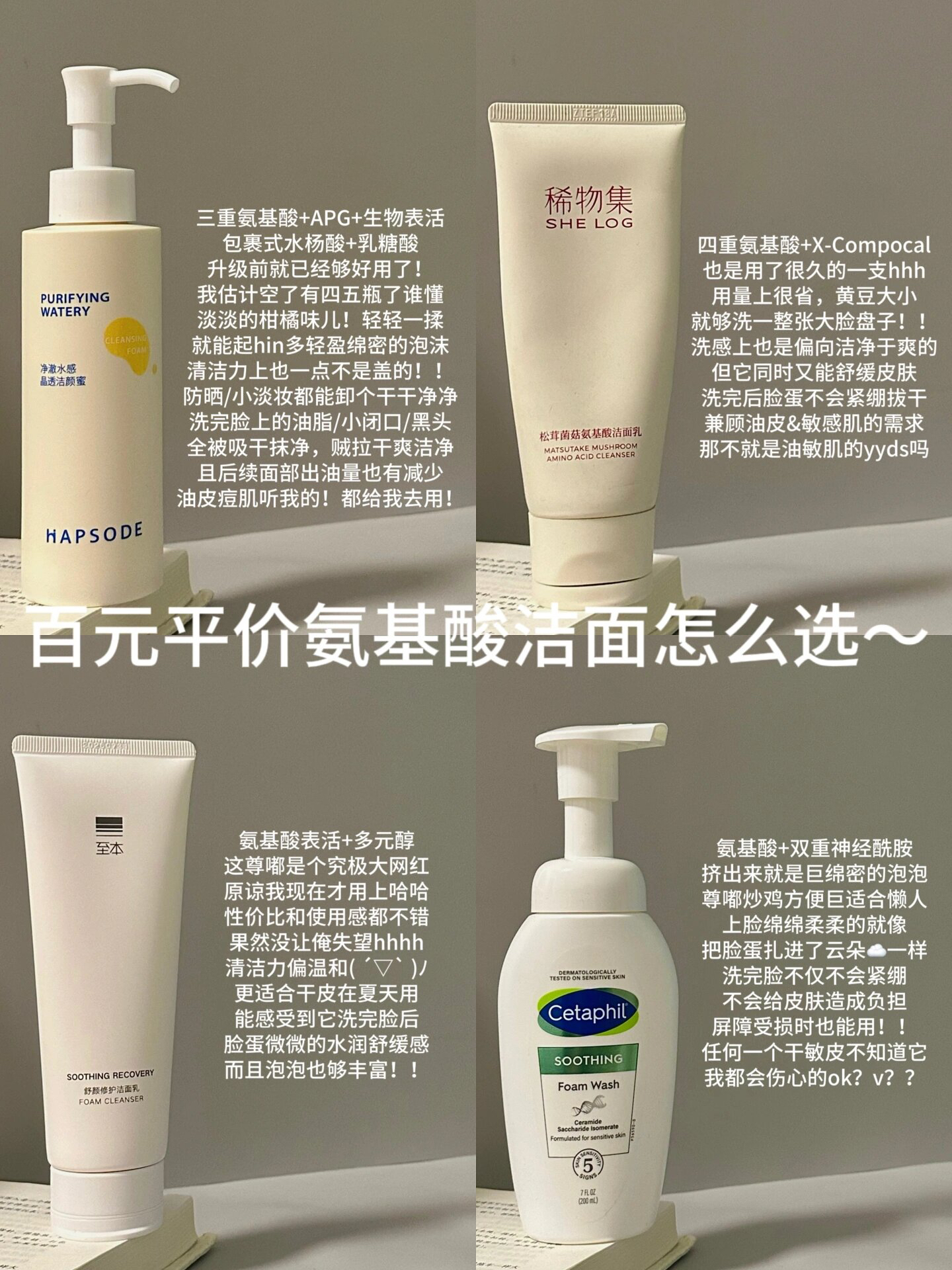 本篇笔记关联了Hapsode/悦芙媞 氨基酸晶透水感洁颜蜜 清爽去油面部清洁洗卸合一油皮敏皮 【2.0】油皮专研、SHE LOG/稀物集 松茸菌菇氨基酸泡沫洗面奶 清洁去油保湿 维稳修护、至本 舒颜修护洁面乳 温和清洁绵密易冲洗 【5.0】保湿等商品,为用户提供真实的使用体验和购买参考。