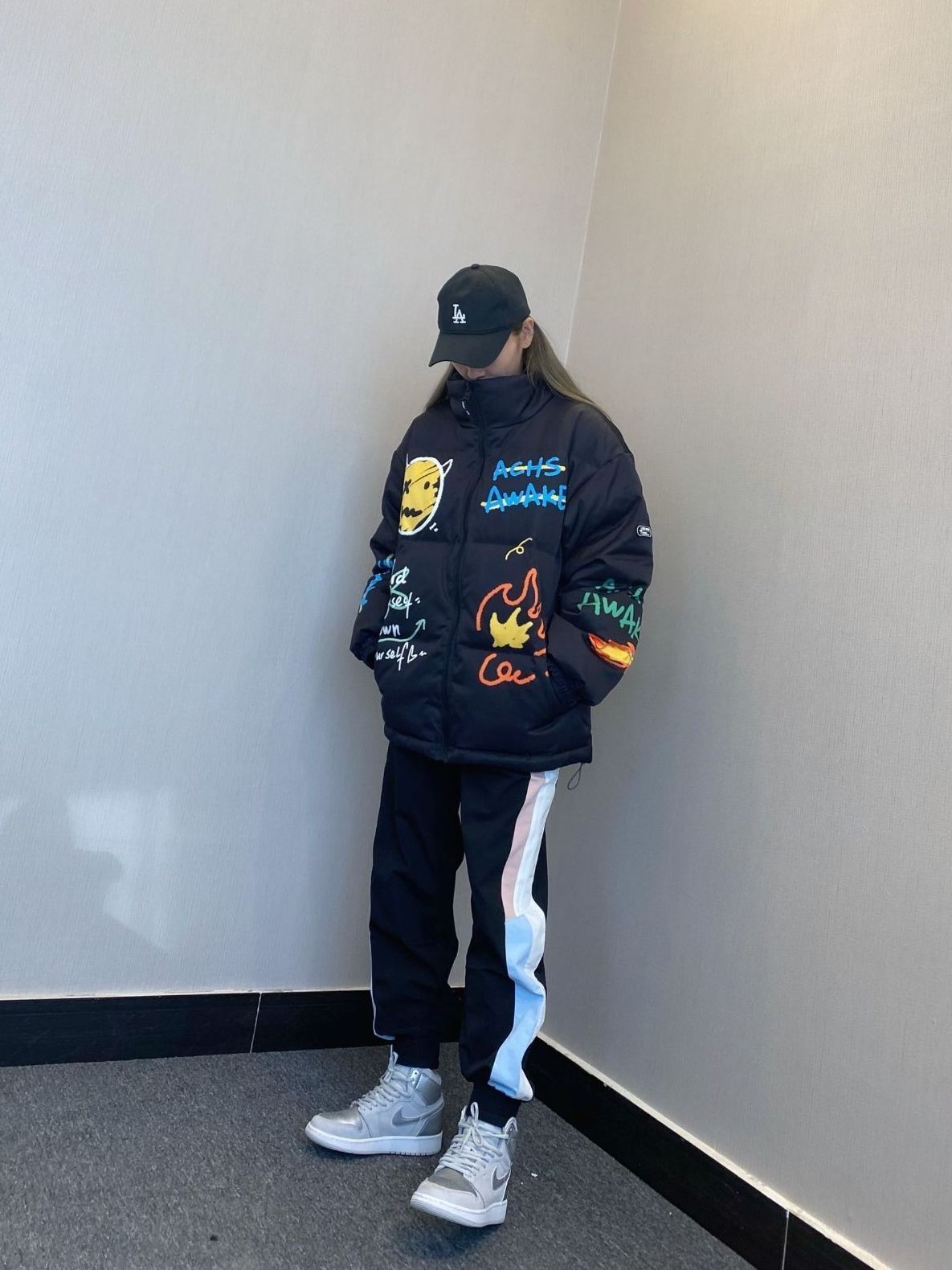 穿搭主题 涂鸦元素由街头艺术发展而来,已经成为穿搭类的一种时尚态度 涂鸦棉服在保暖的同时又会带来一些艺术感 👔:ACHS AWAKE 👖:BT 👟:灰银 穿搭心得 上身选择涂鸦的棉服,考虑到涂鸦元素强烈的画感 所以下身选择一条简单大方的休闲裤 图源网络侵删
