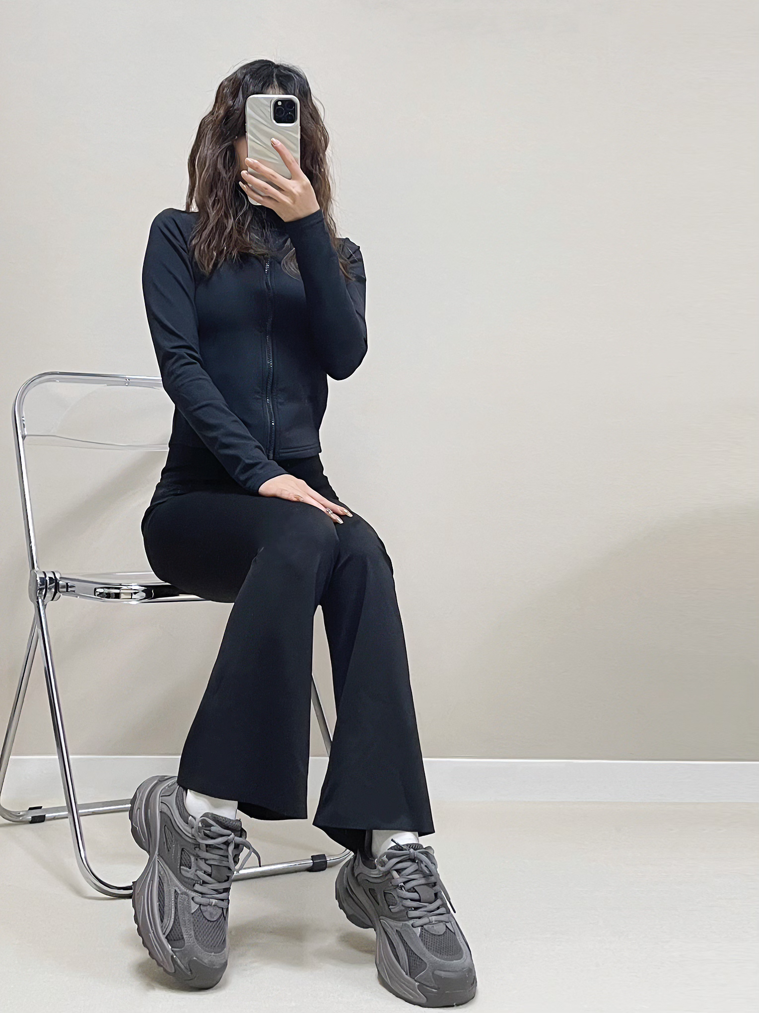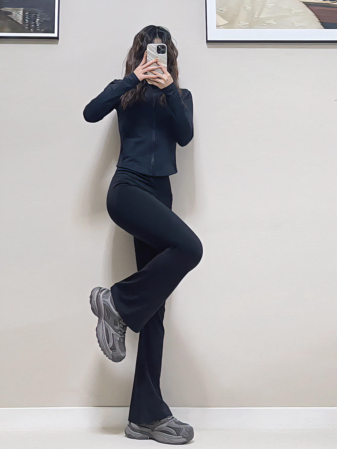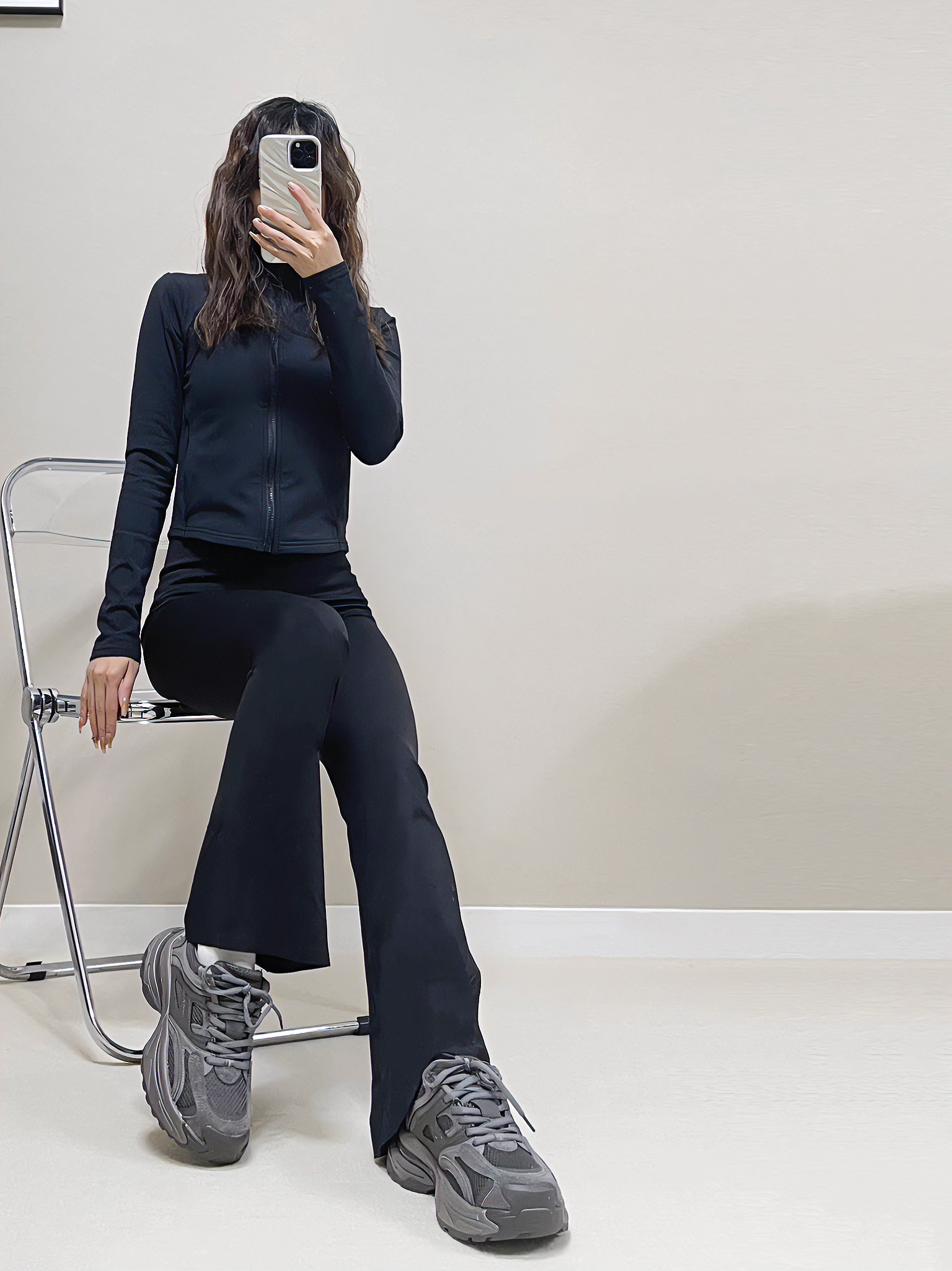 今日份黑色运动上衣+黑色瑜伽裤+灰色老爹鞋👟 黑色薄绒款的运动外套,又保暖又有型,搭配黑色瑜伽喇叭裤,显高又显瘦🫧🫧 下面搭配一双灰色的老爹鞋,上脚敲酷的🦶关键还增高 hhh,跟高4.5cm,本小个子超爱••舒服又高级✨✨