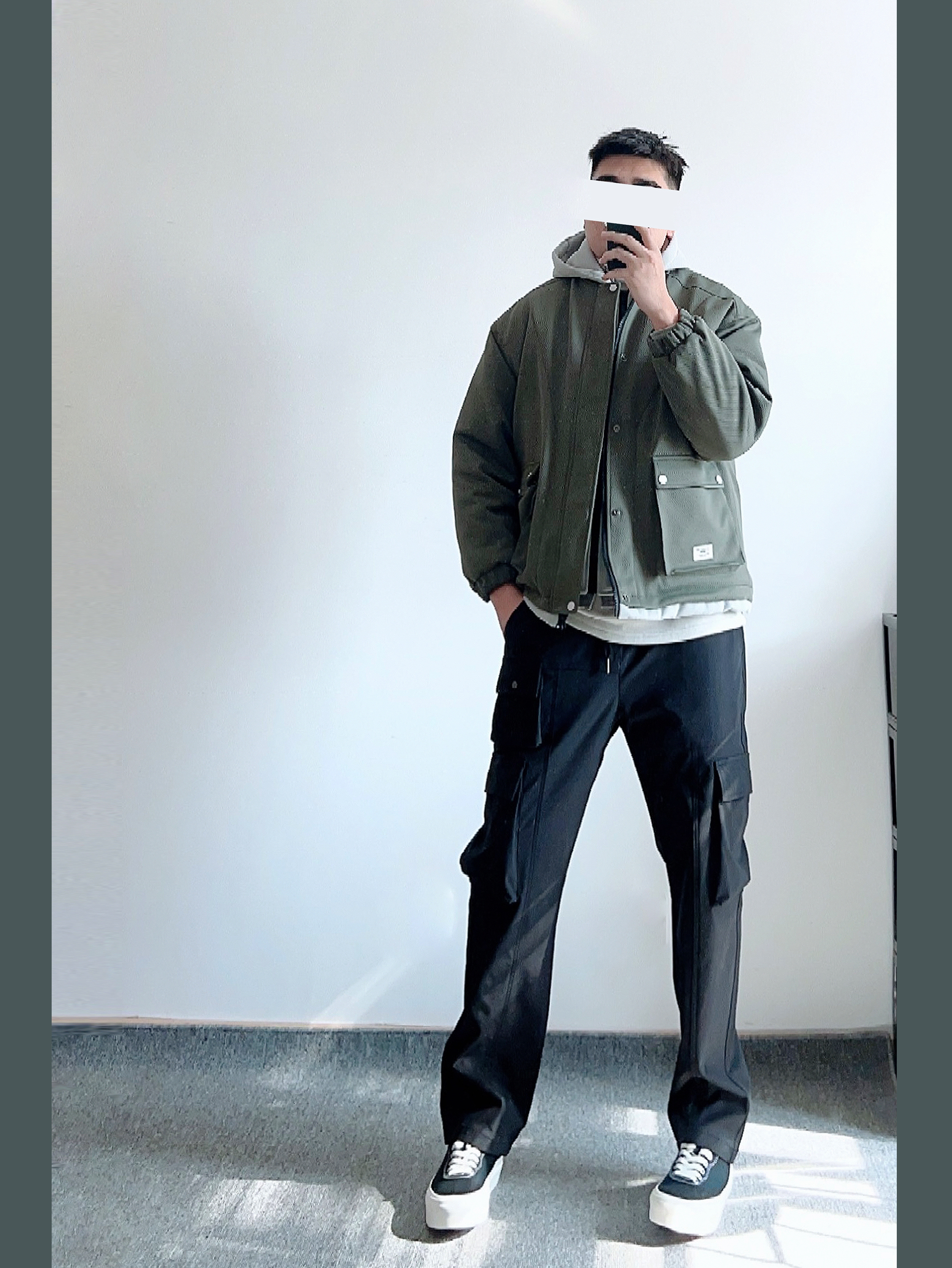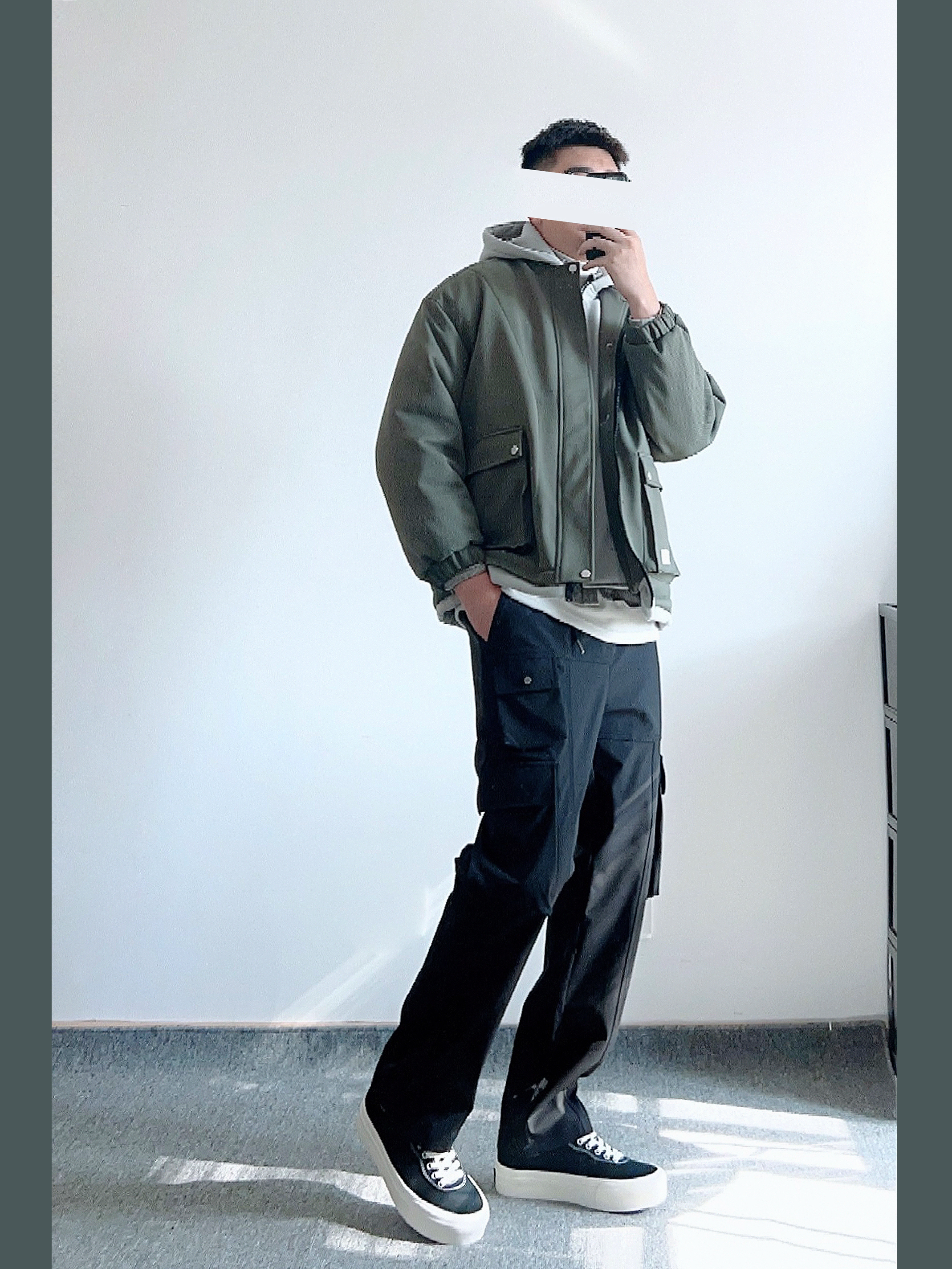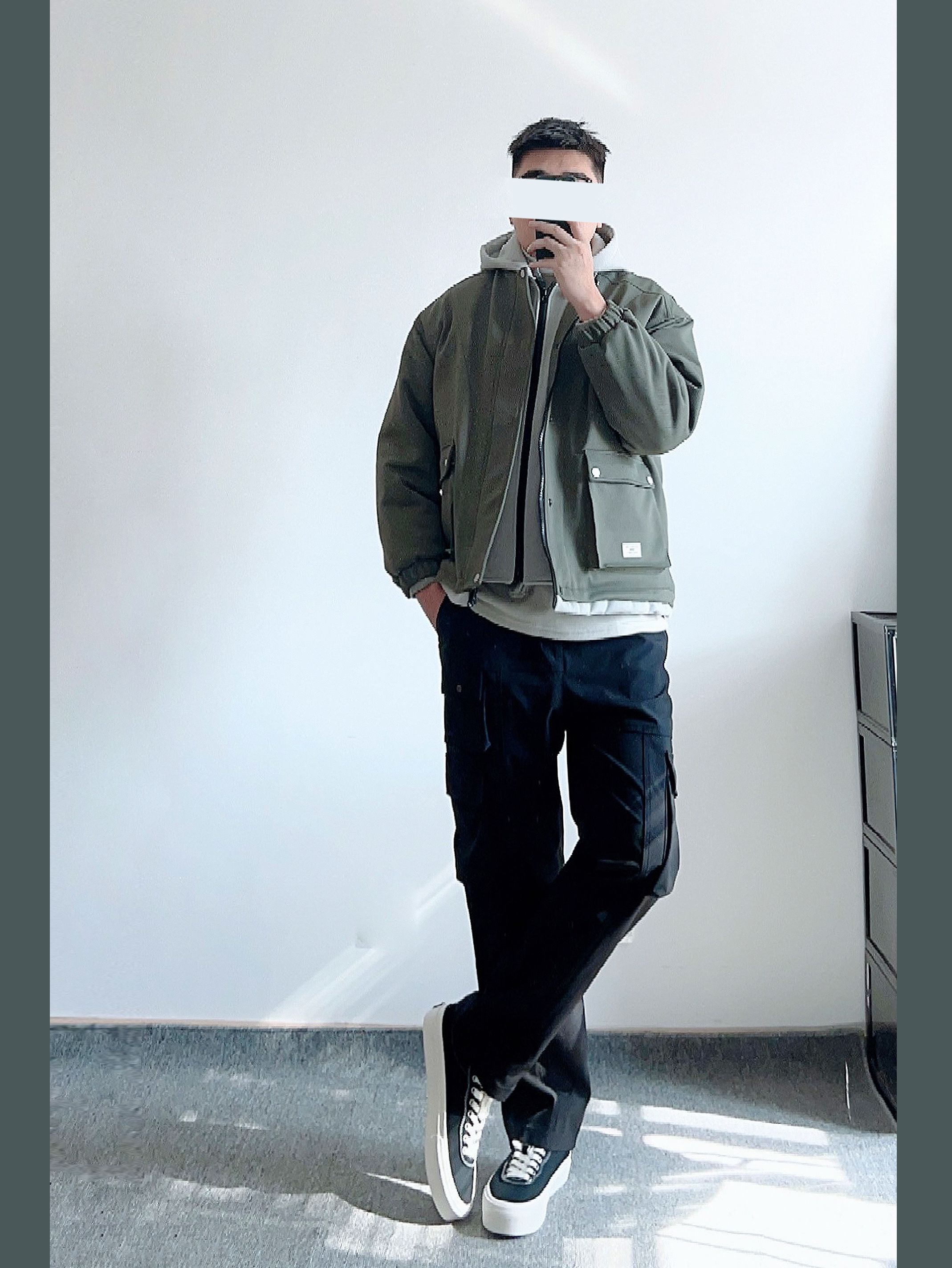 军绿色连帽棉服、假两件设计 增加层次感的同时又保暖! 搭配黑色机能工装裤、版型nice 自带增高效果、搭配帆布鞋 简约耐看的工装风!最适合男生穿搭~ ——