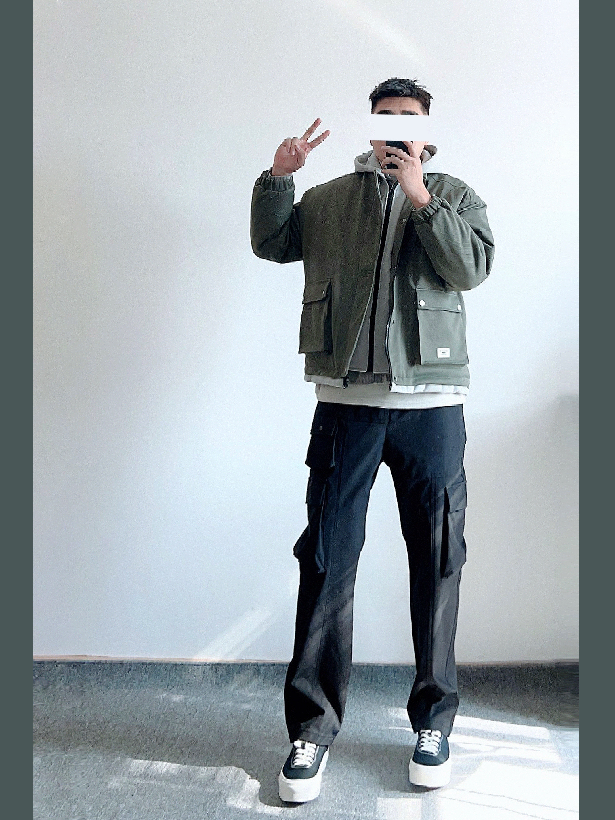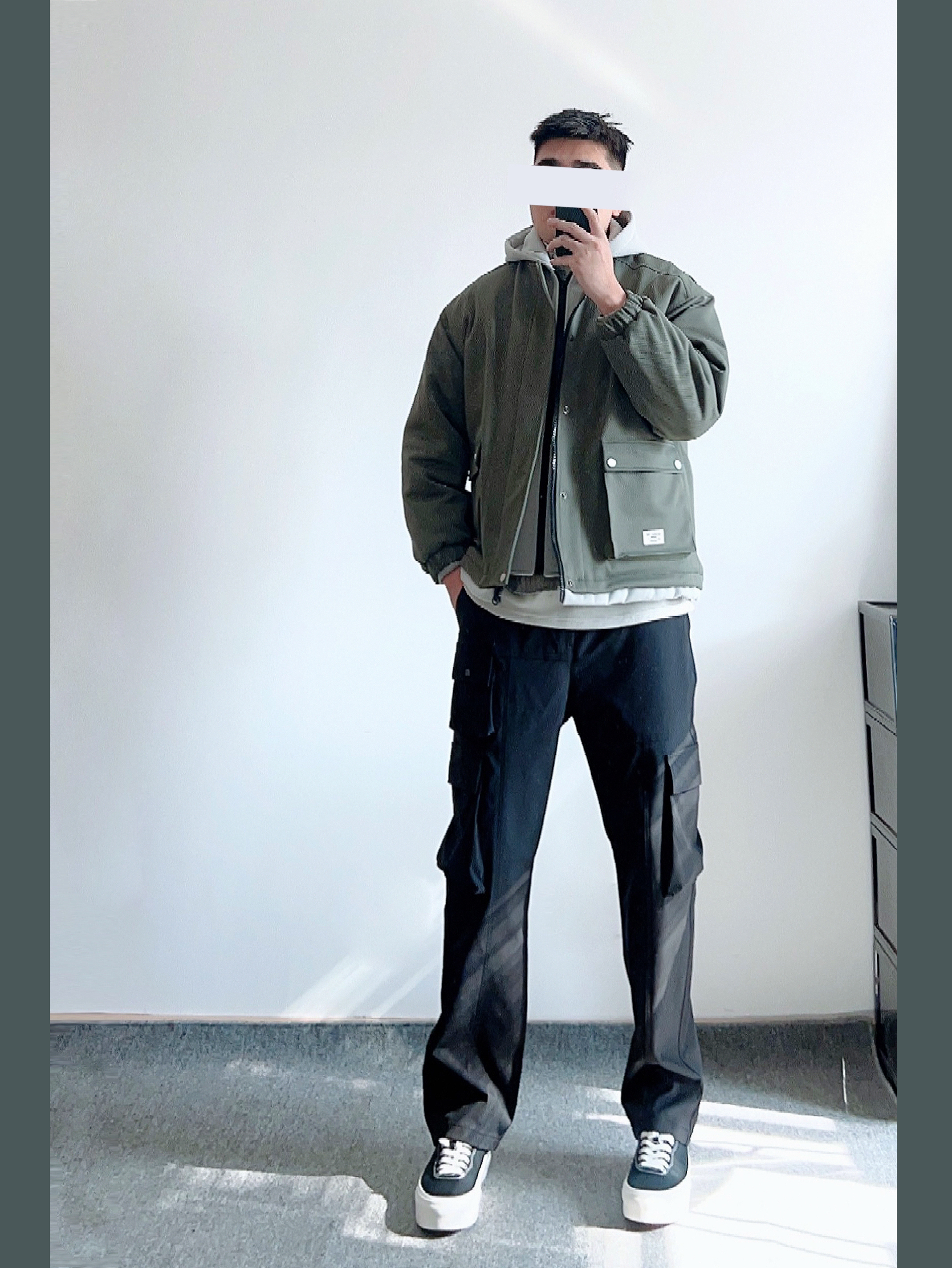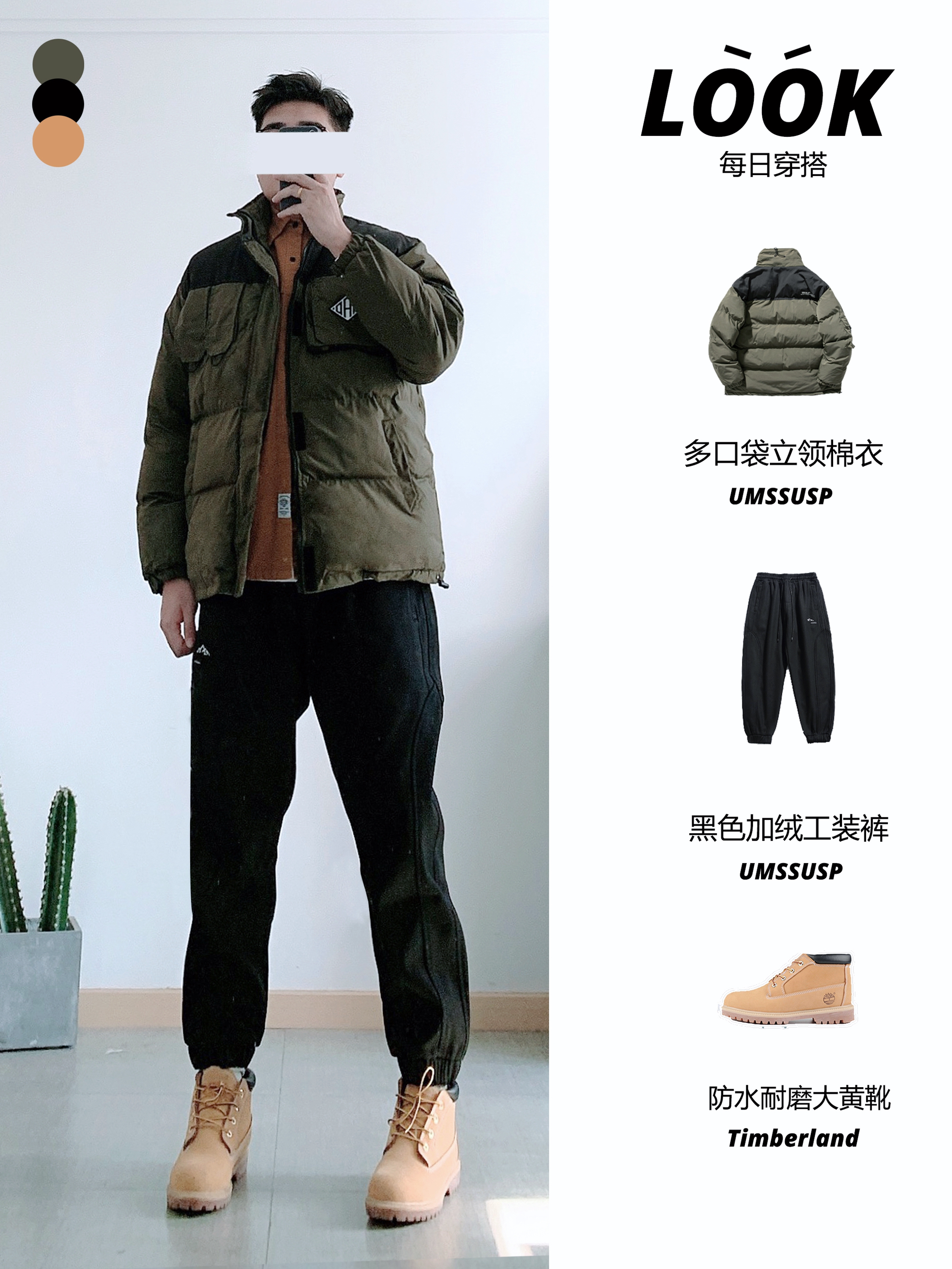 军绿色连帽棉服、假两件设计 增加层次感的同时又保暖! 搭配黑色机能工装裤、版型nice 自带增高效果、搭配帆布鞋 简约耐看的工装风!最适合男生穿搭~ ——