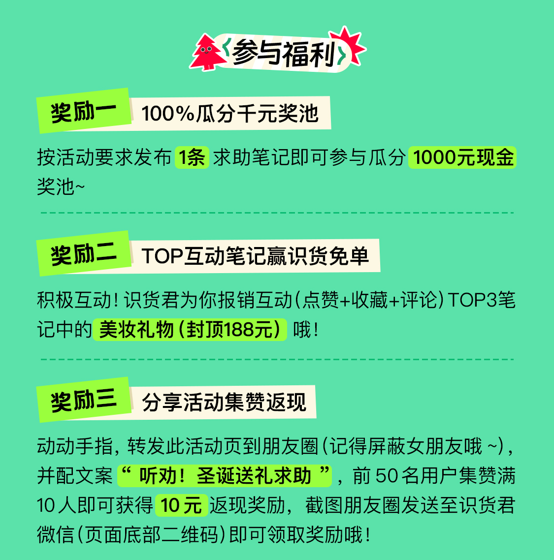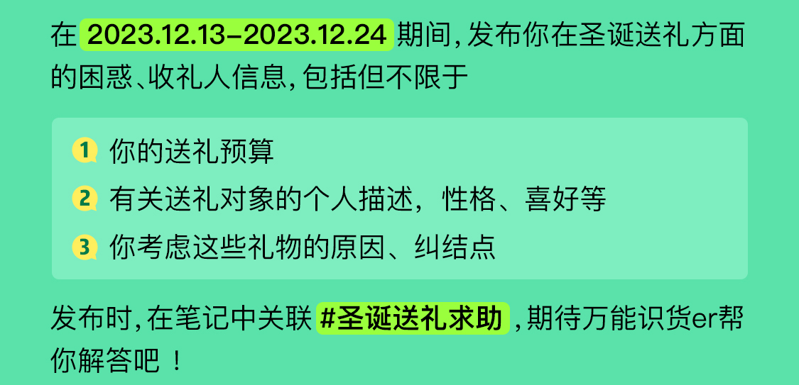能不能追到crush,就看你们了 【参与方式】 在2023.12.13-2023.12.24期间, 发布你在圣诞送礼方面的困惑、收礼人信息,包括但不限于 1.你的送礼预算 2.有关送礼对象的个人描述,性格、喜好等 3.你考虑这些礼物的原因、纠结点··· 发布时,在笔记中关联话题#圣诞送礼求助,期待万能识货er帮你解答 【参与福利】 1.100%瓜分千元奖池 按活动要求发布1...