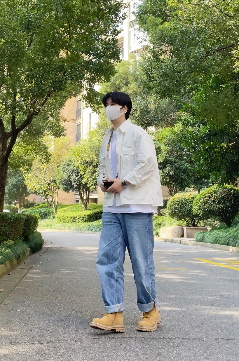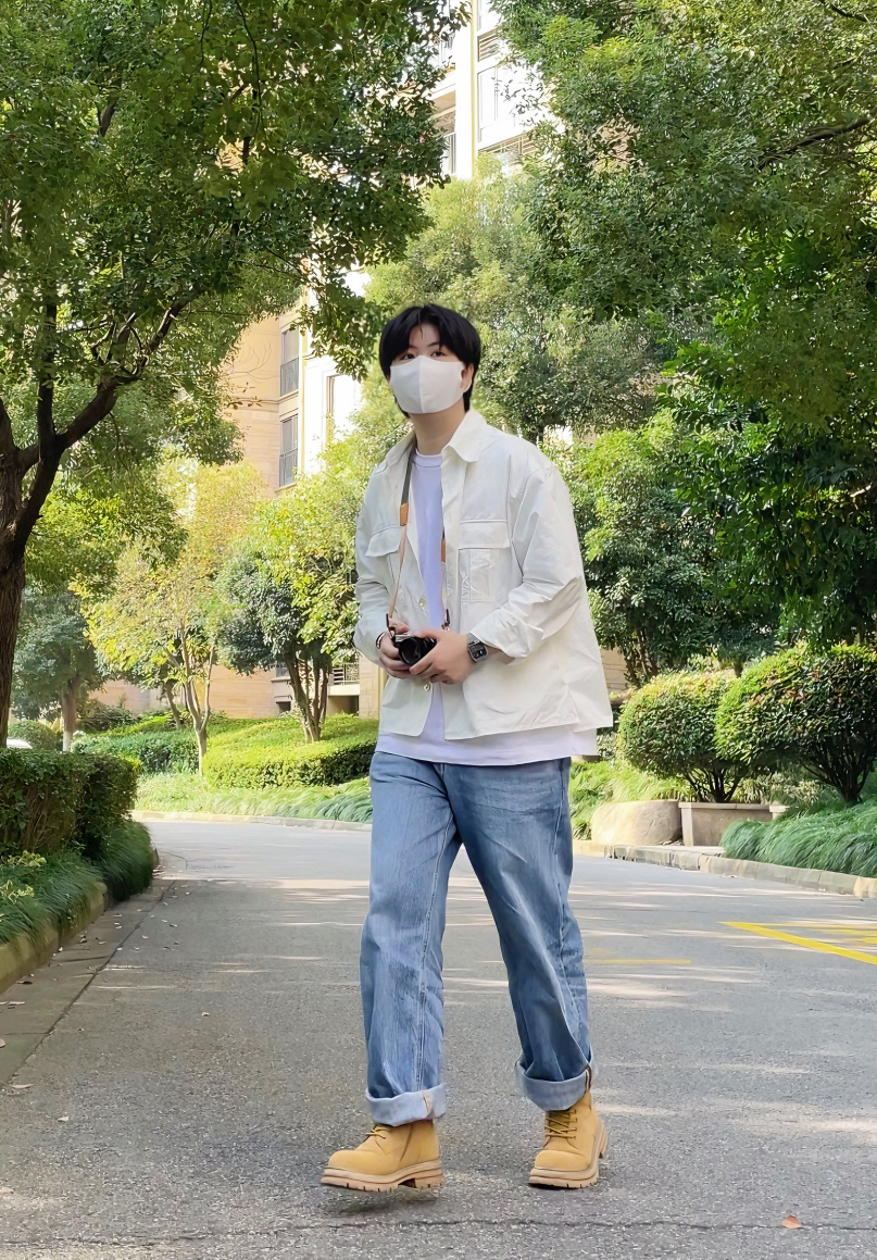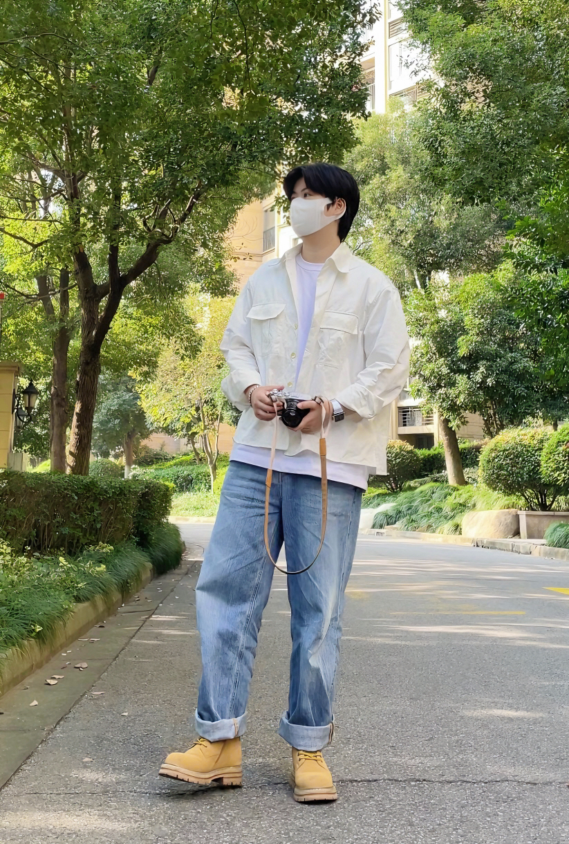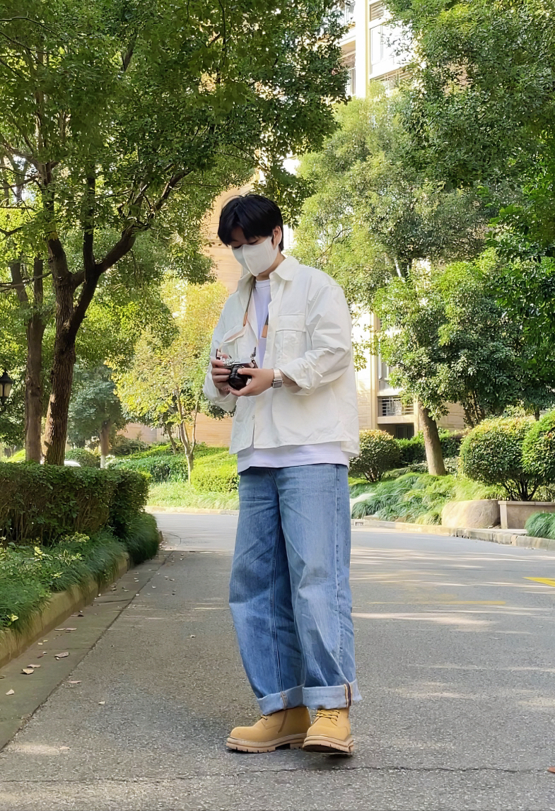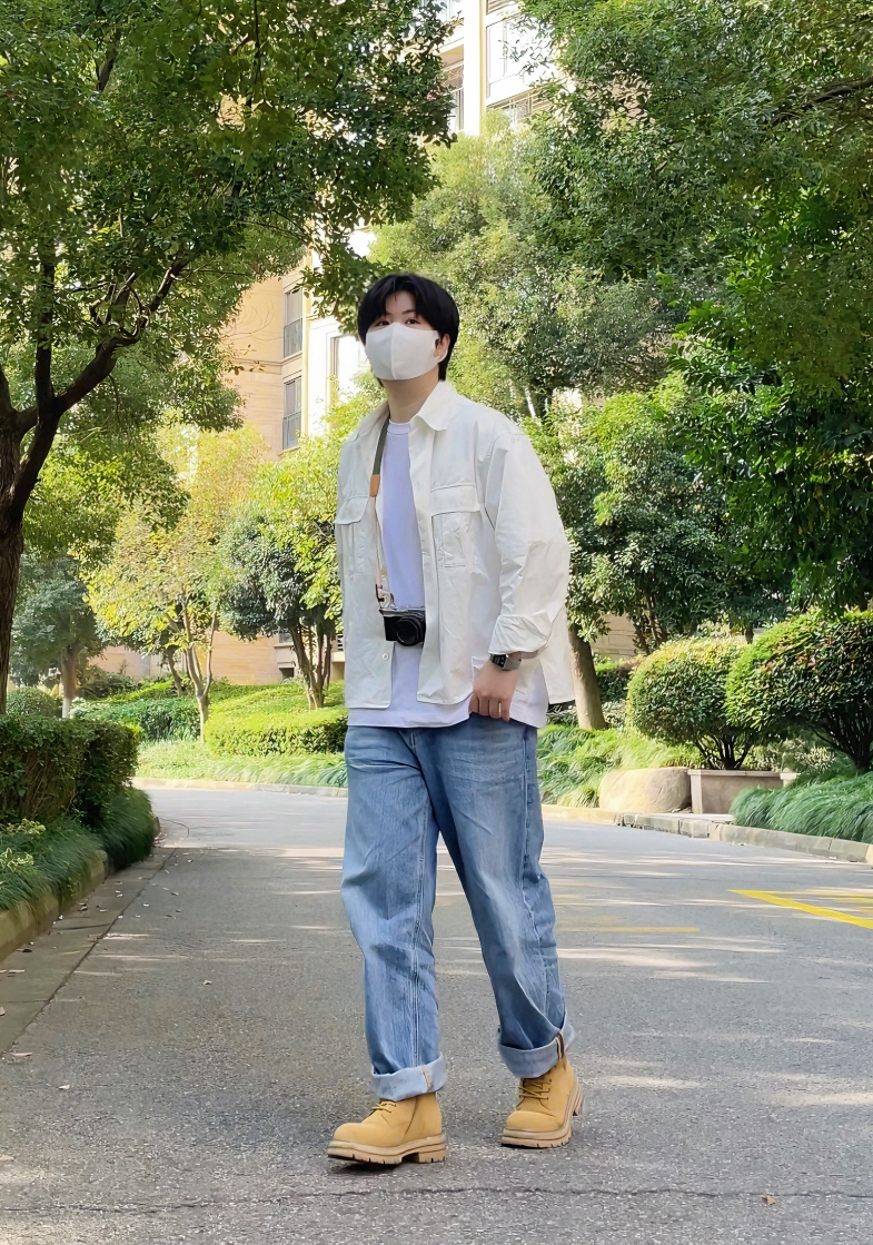 牛仔裤和大黄靴的搭配不用多说真的很绝 简简单单的搭配一件白衬衫 阳光少年感就出来了 衬衫的质感比较挺阔 作为内搭和外套都可以 —————————————— 白色衬衫 内搭白色T恤 浅蓝直筒牛仔裤 大黄靴