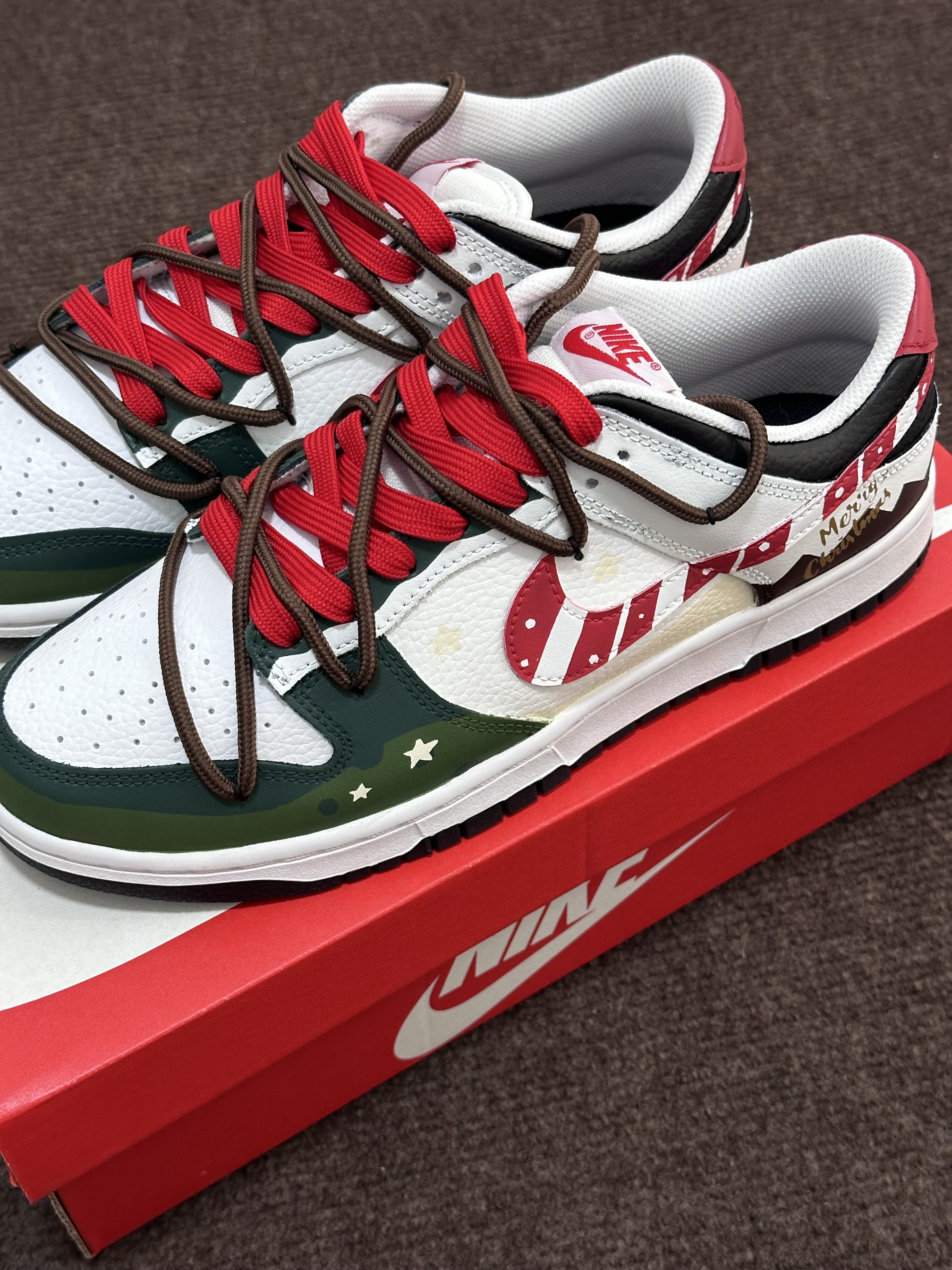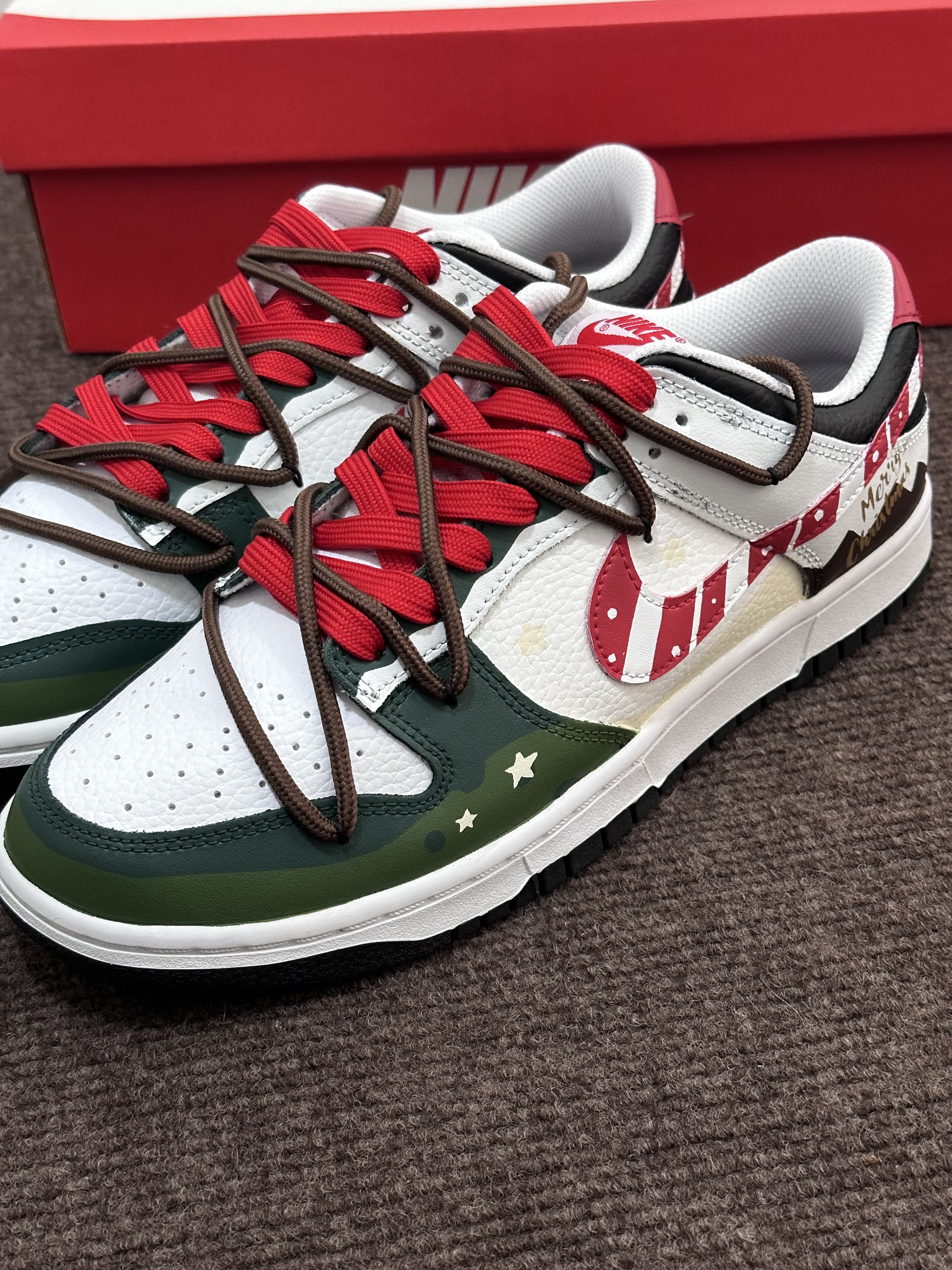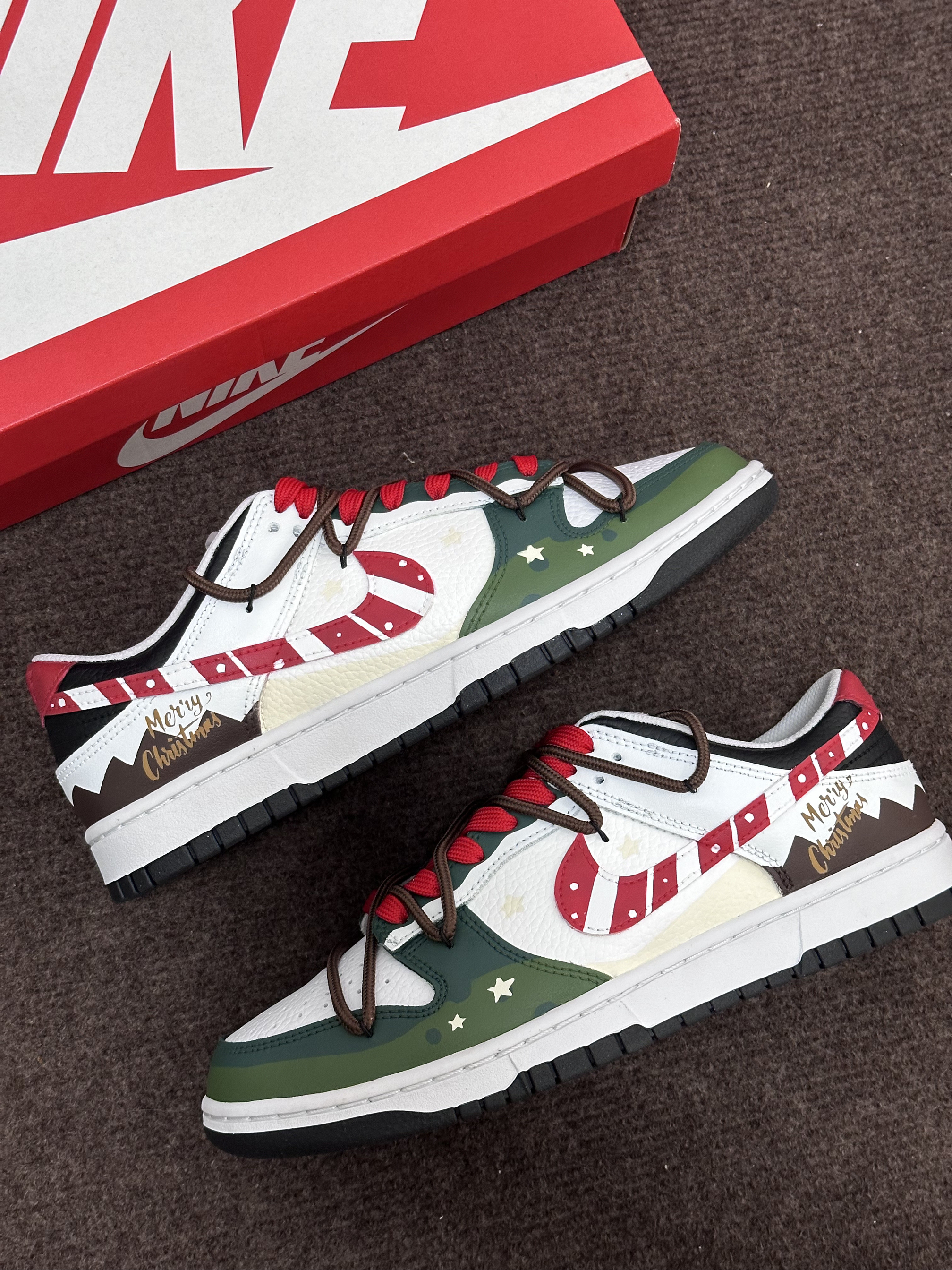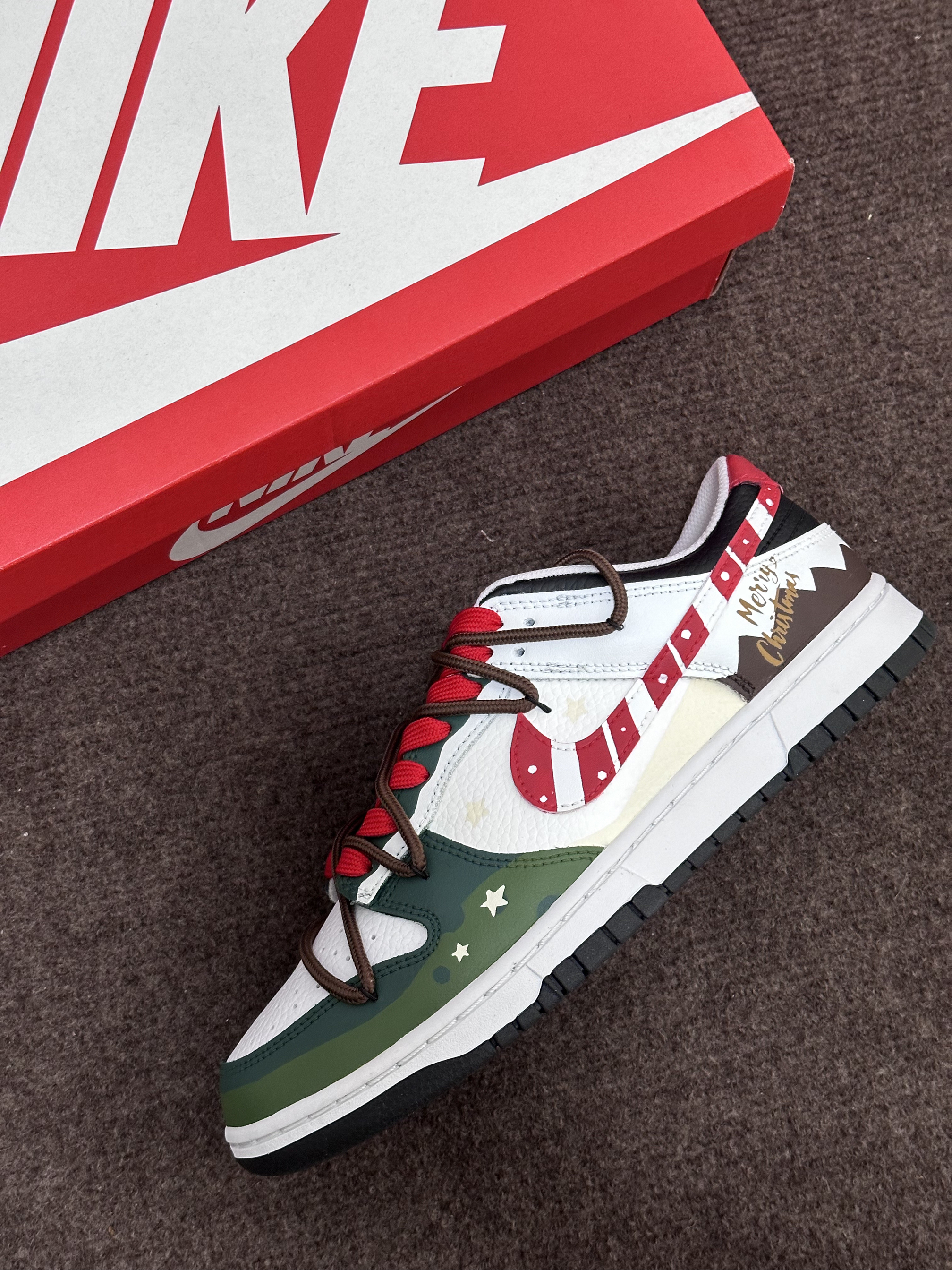 圣诞节🎄很快就要到啦‼️ 今天给大家分享一双很适合作为礼物的定制板鞋 Nike Dunk Low『雪顶可可』圣诞限定 红绿黑 整双鞋由白色/绿色/红色/黑色等搭配 鞋面选用了易于打理的皮革材质 鞋头的透气孔设计保证了较好的透气性 鞋身则加入了许多圣诞节🎄的涂鸦元素设计 比如星星⭐️/MERRY CHRISTMAS/圣诞长袜等 鞋带方面使用了棕色+红色的解构双鞋带配置 整体来说这是一双兼具颜值和设计...