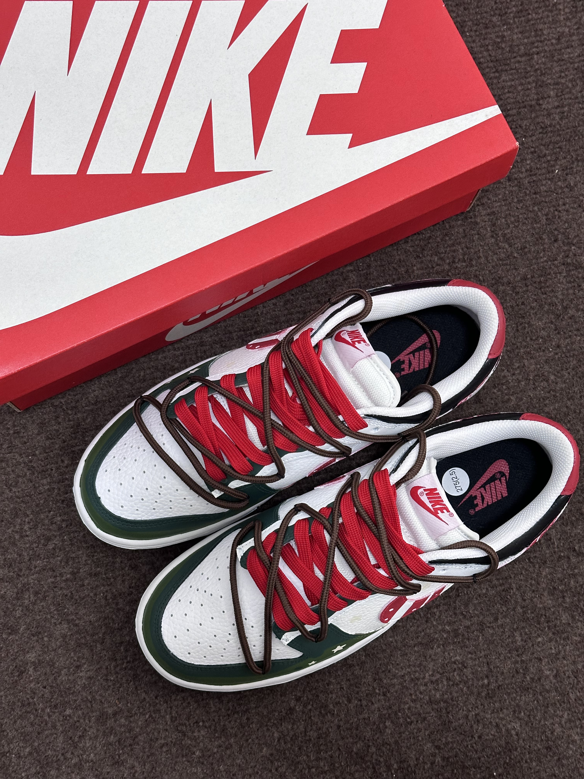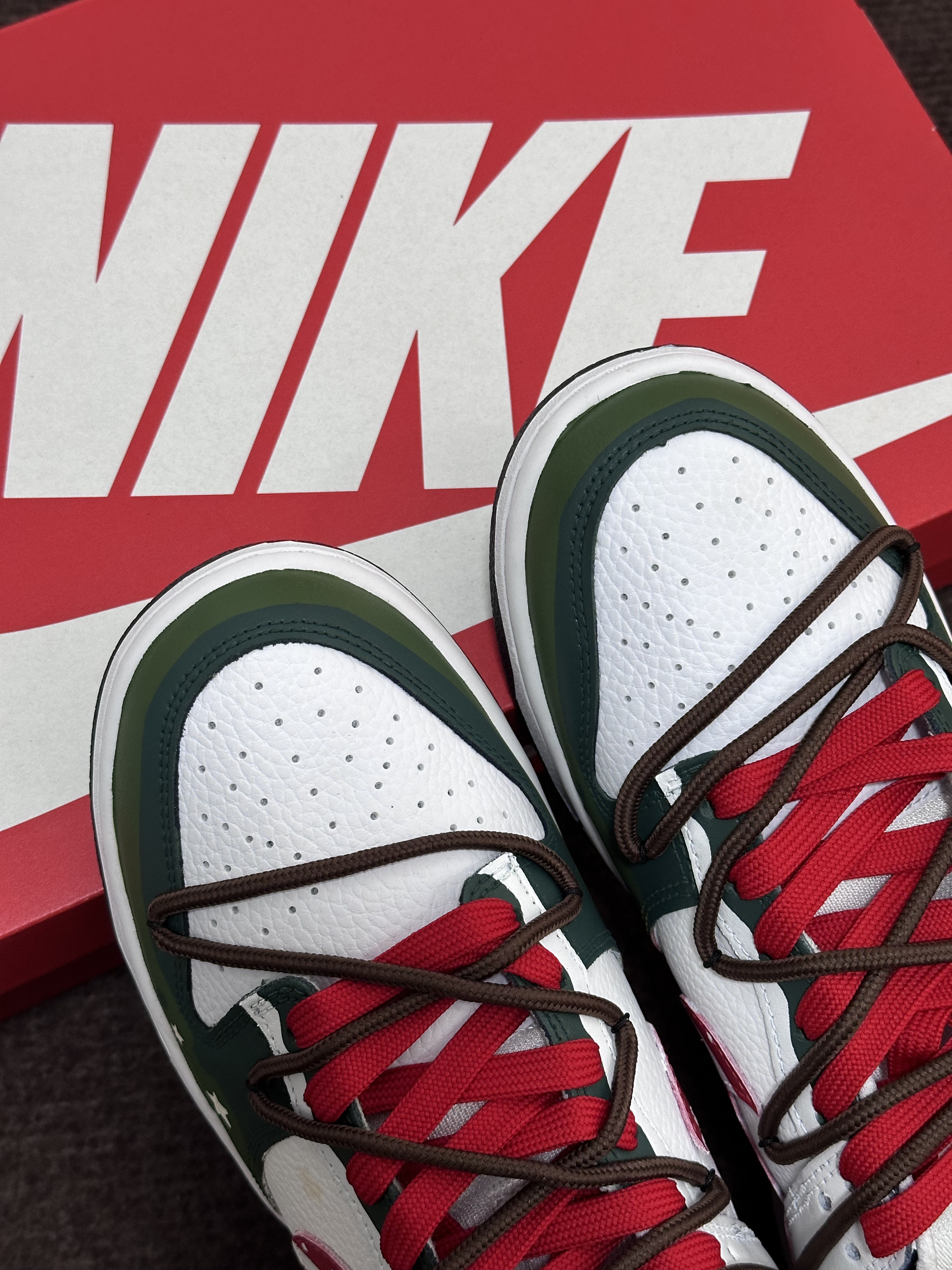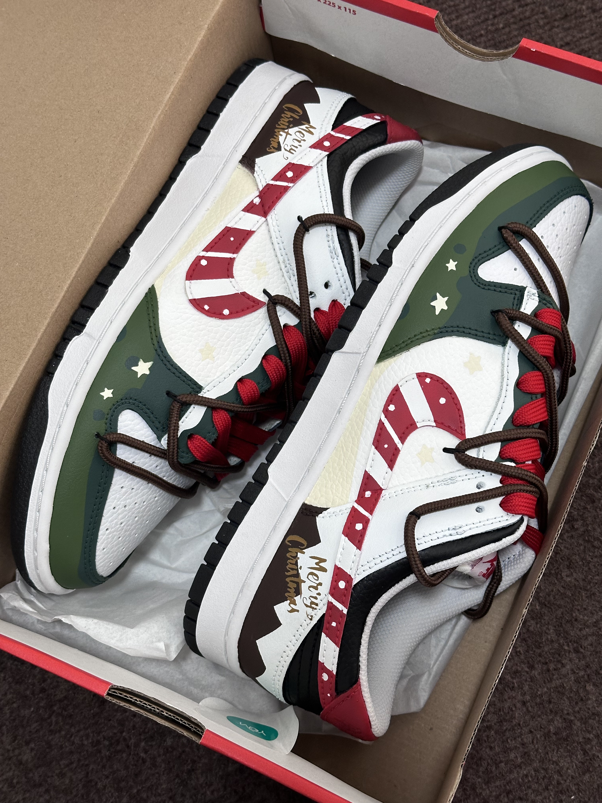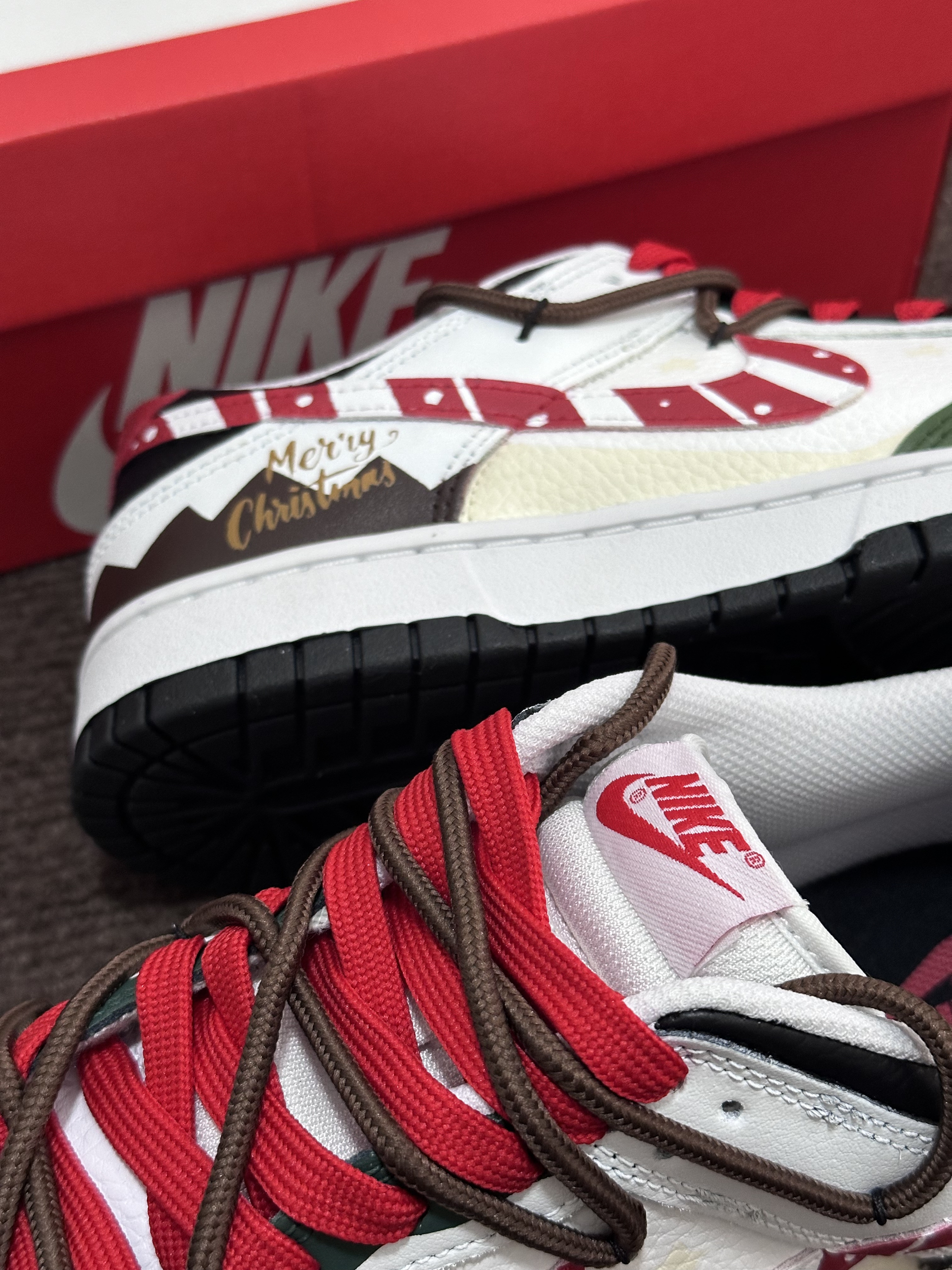 圣诞节🎄很快就要到啦‼️ 今天给大家分享一双很适合作为礼物的定制板鞋 Nike Dunk Low『雪顶可可』圣诞限定 红绿黑 整双鞋由白色/绿色/红色/黑色等搭配 鞋面选用了易于打理的皮革材质 鞋头的透气孔设计保证了较好的透气性 鞋身则加入了许多圣诞节🎄的涂鸦元素设计 比如星星⭐️/MERRY CHRISTMAS/圣诞长袜等 鞋带方面使用了棕色+红色的解构双鞋带配置 整体来说这是一双兼具颜值和设计...