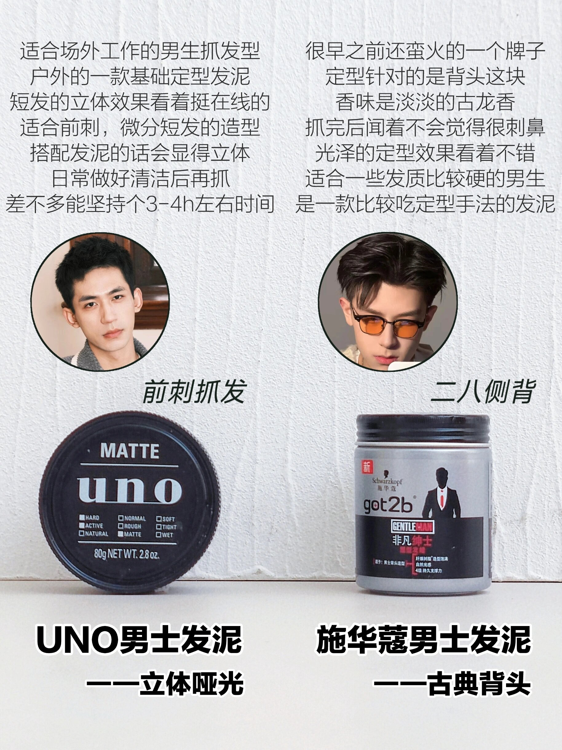 本篇笔记关联了【男士专用】施华蔻 Got2b非凡绅士光感塑形发泥 定型清香发蜡 4级持久支撑力发蜡、【男士专用】SYOSS/丝蕴 激强塑型哑光发蜡 85ml、【男士专用】Uno 资生堂男士定型发泥 黑色-哑光立体等商品,为用户提供真实的使用体验和购买参考。