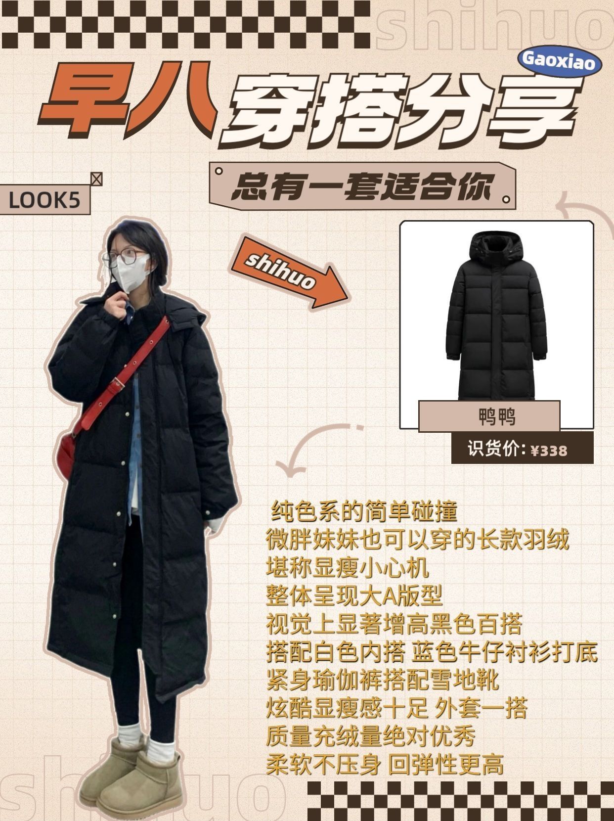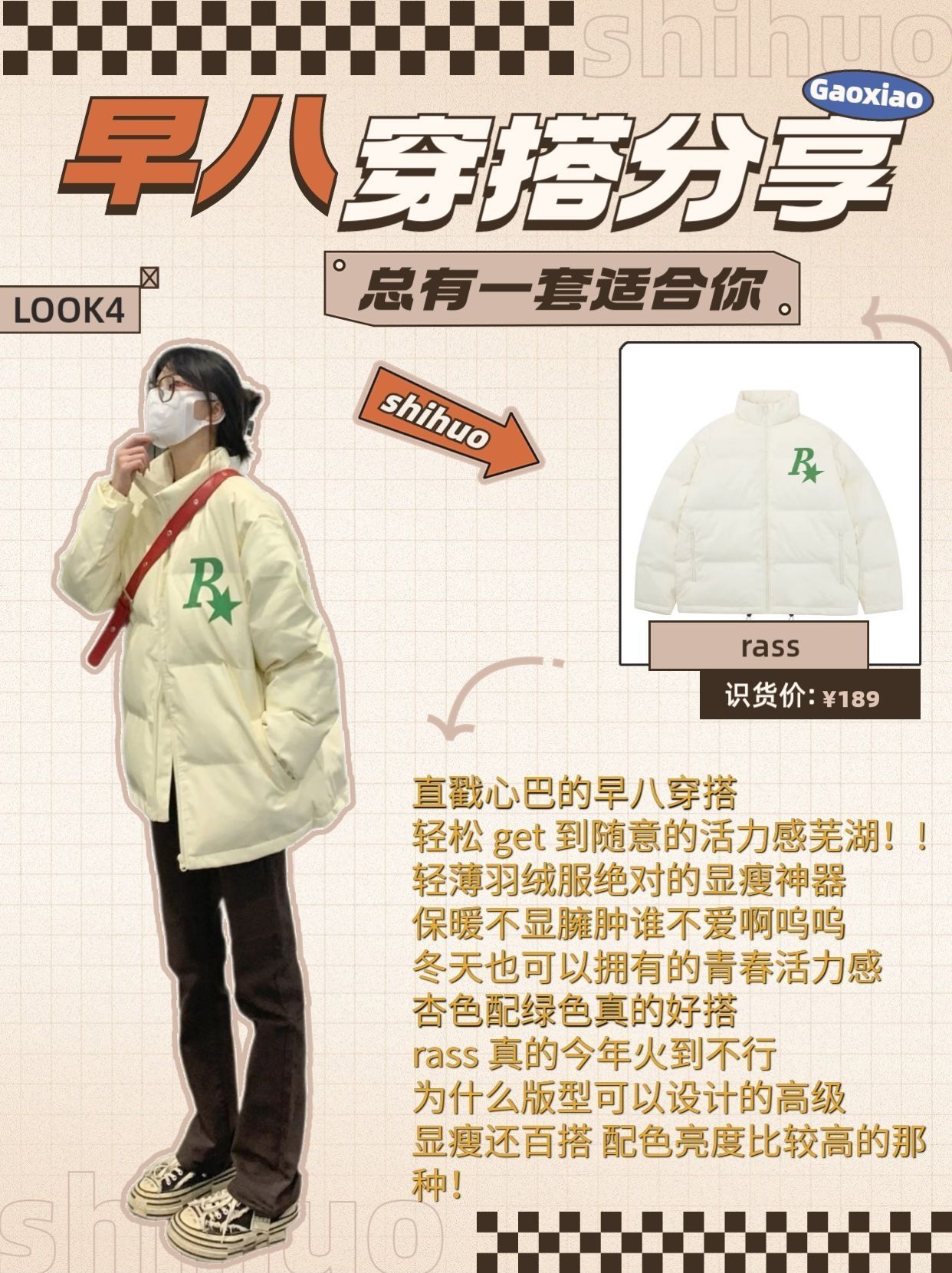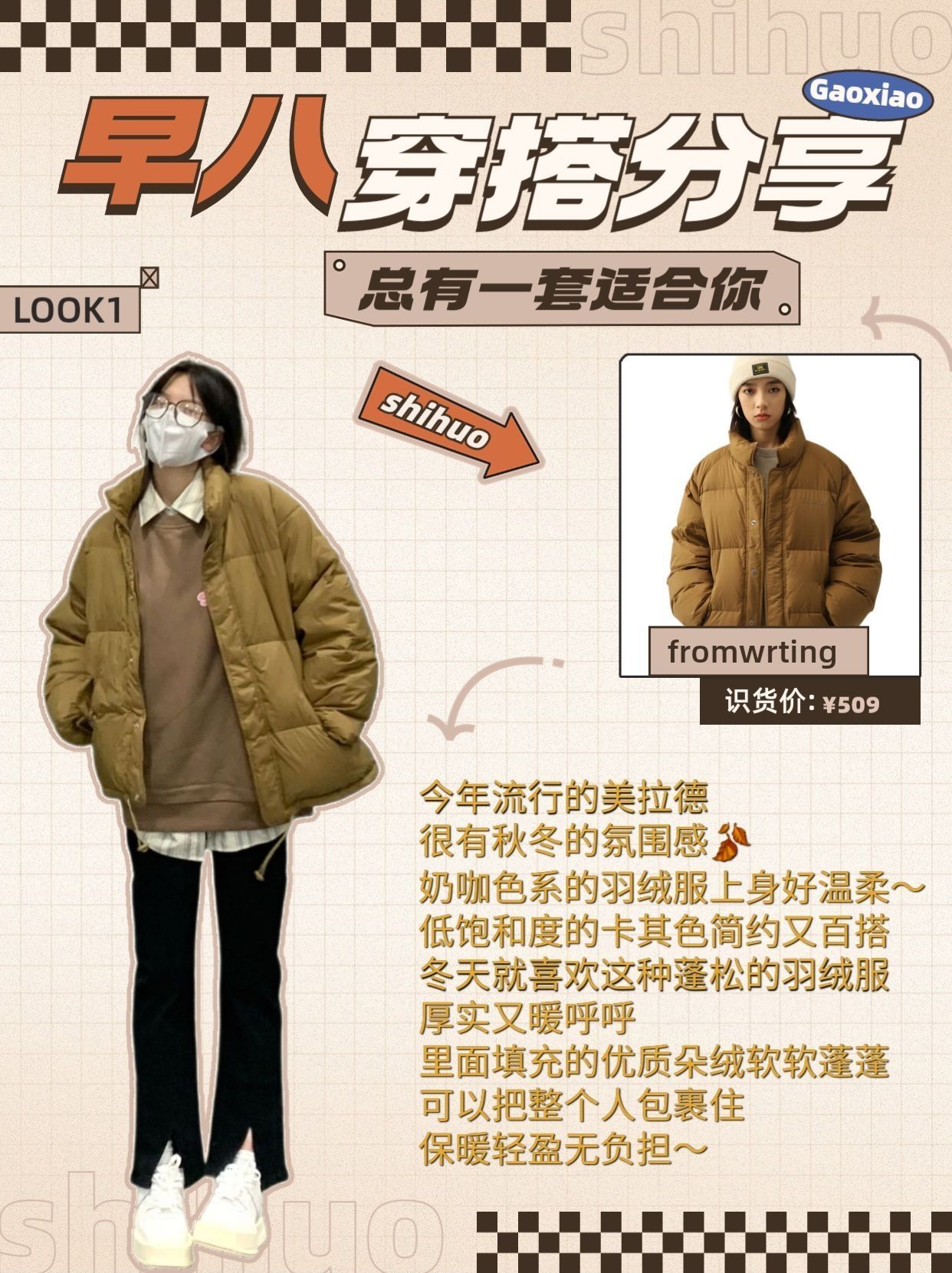 不出错学生党快速出门羽绒服穿搭分享技巧 冲着模特图激情下单到手才发现不适合自己? 网上的热门搭配就是穿不对感觉? 明明对照着博主穿搭,怎么总差了点味道!! 按照不同的羽绒服风格来搭配,才是最好的风格! 本期服装搭配技巧从头细节到脚,各种热门羽绒服都给你安排的明明白白~ LOOK1: 品牌:fromwrting(货号:Y2467) 今年流行的美拉德 很有秋冬的氛围感🍂奶咖色系的羽绒服上身好温柔~低饱...