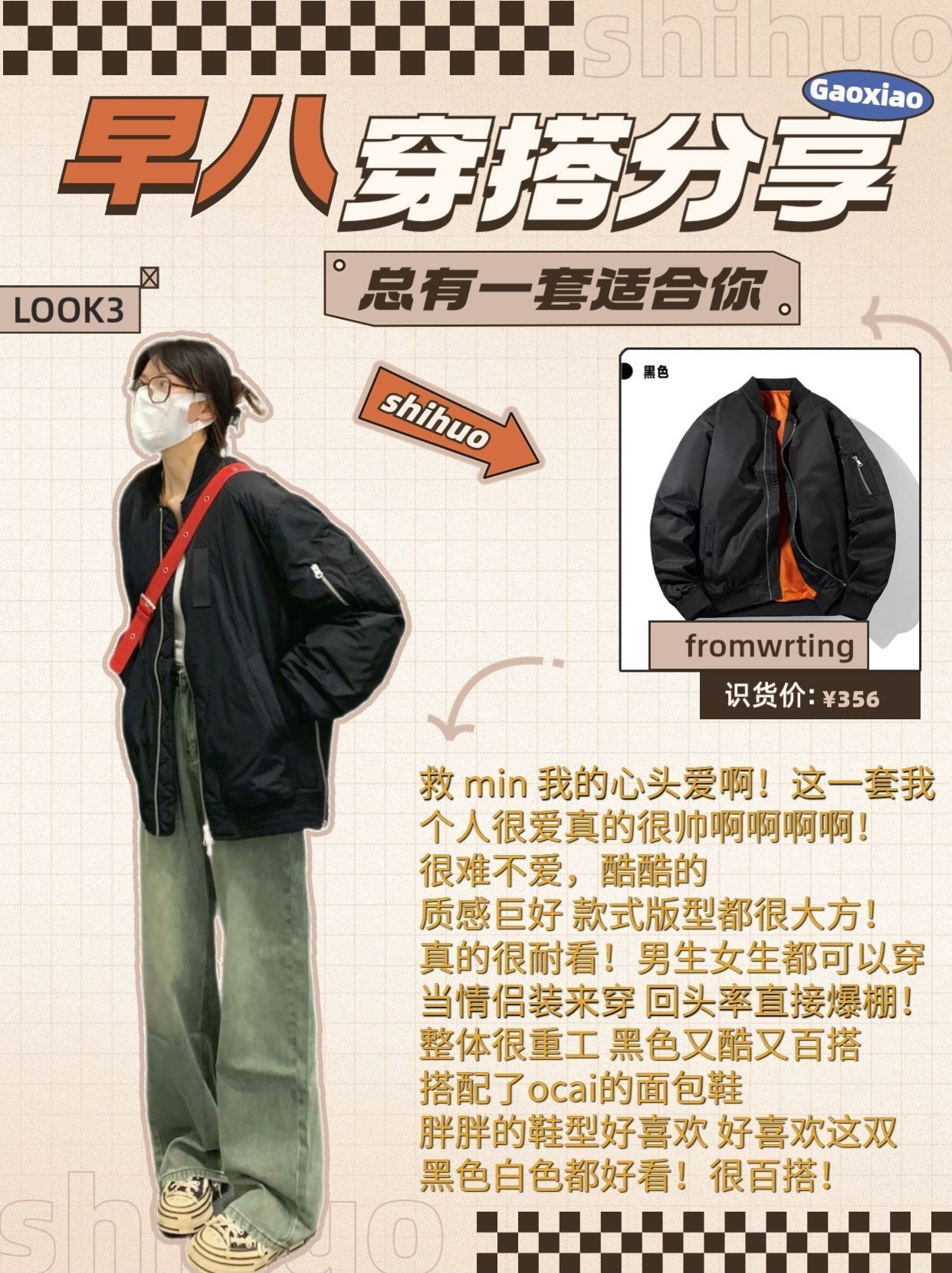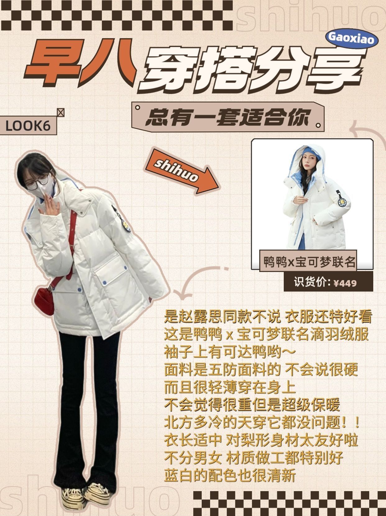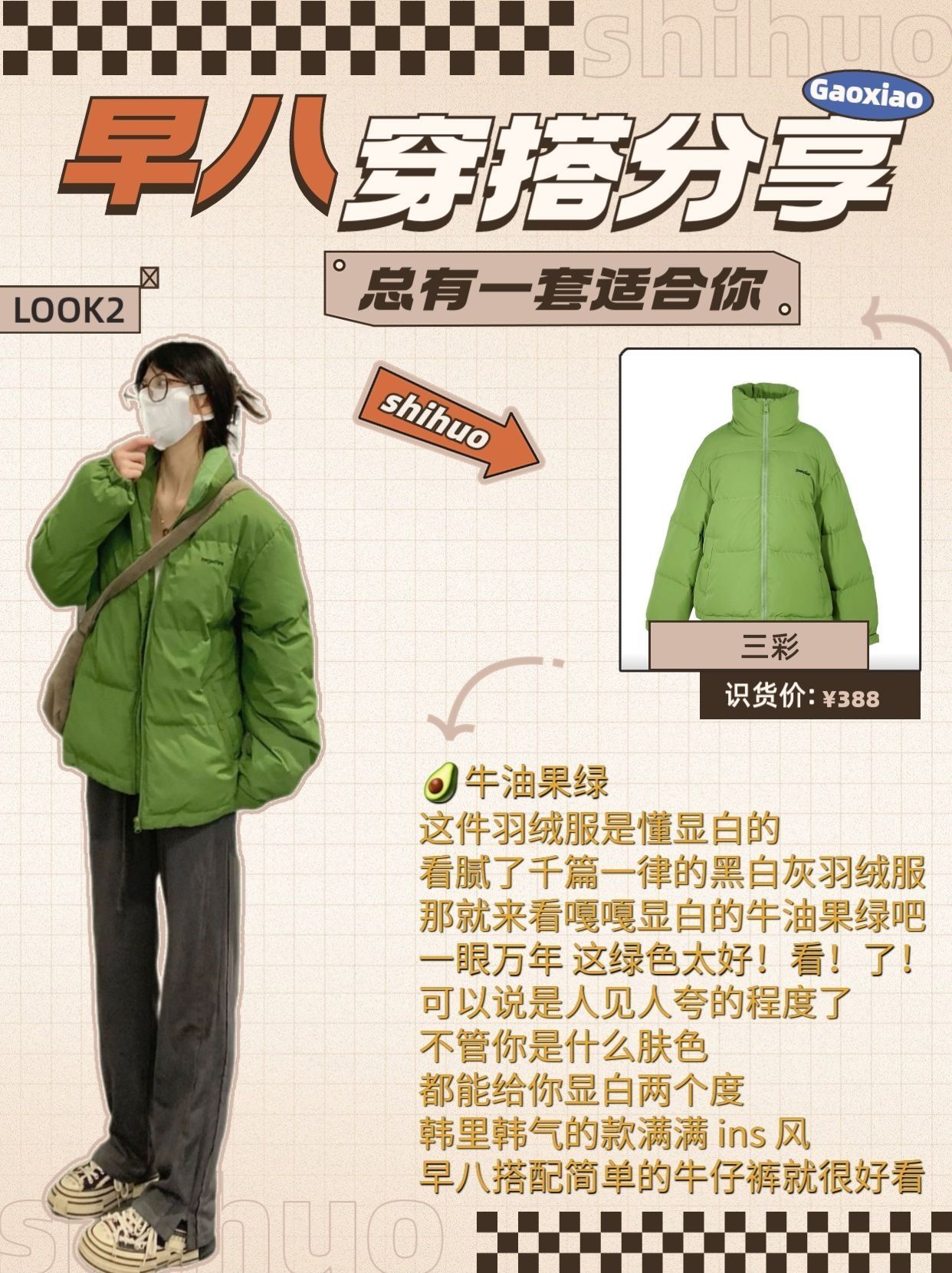 不出错学生党快速出门羽绒服穿搭分享技巧 冲着模特图激情下单到手才发现不适合自己? 网上的热门搭配就是穿不对感觉? 明明对照着博主穿搭,怎么总差了点味道!! 按照不同的羽绒服风格来搭配,才是最好的风格! 本期服装搭配技巧从头细节到脚,各种热门羽绒服都给你安排的明明白白~ LOOK1: 品牌:fromwrting(货号:Y2467) 今年流行的美拉德 很有秋冬的氛围感🍂奶咖色系的羽绒服上身好温柔~低饱...