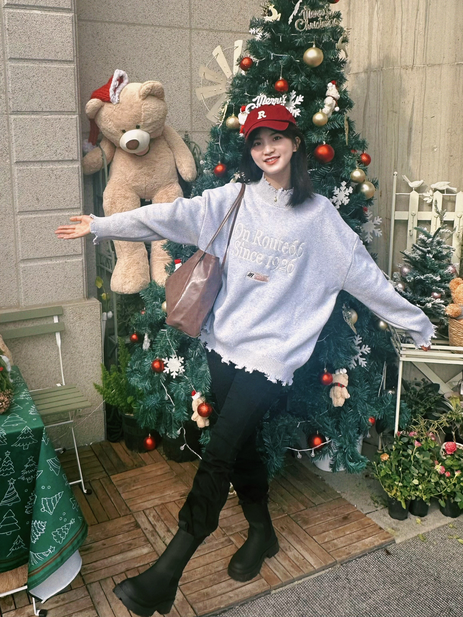 hii这里是大双啊👧 今日穿搭分享👔 灰色毛衣➕黑色喇叭裤➕黑色靴子 韩系氛围感这一套整个拿捏了! 灰色百搭毛衣搭配黑色喇叭裤, 通勤也可以这么穿哦~ 圣诞红用红色帽子来搭配, 整一个圣诞氛围感就来啦! 黑色靴子也很好看ins感就来咯, 黑色经典永不过时呢! 如果你也喜欢今天的穿搭, 那就安排啦~
