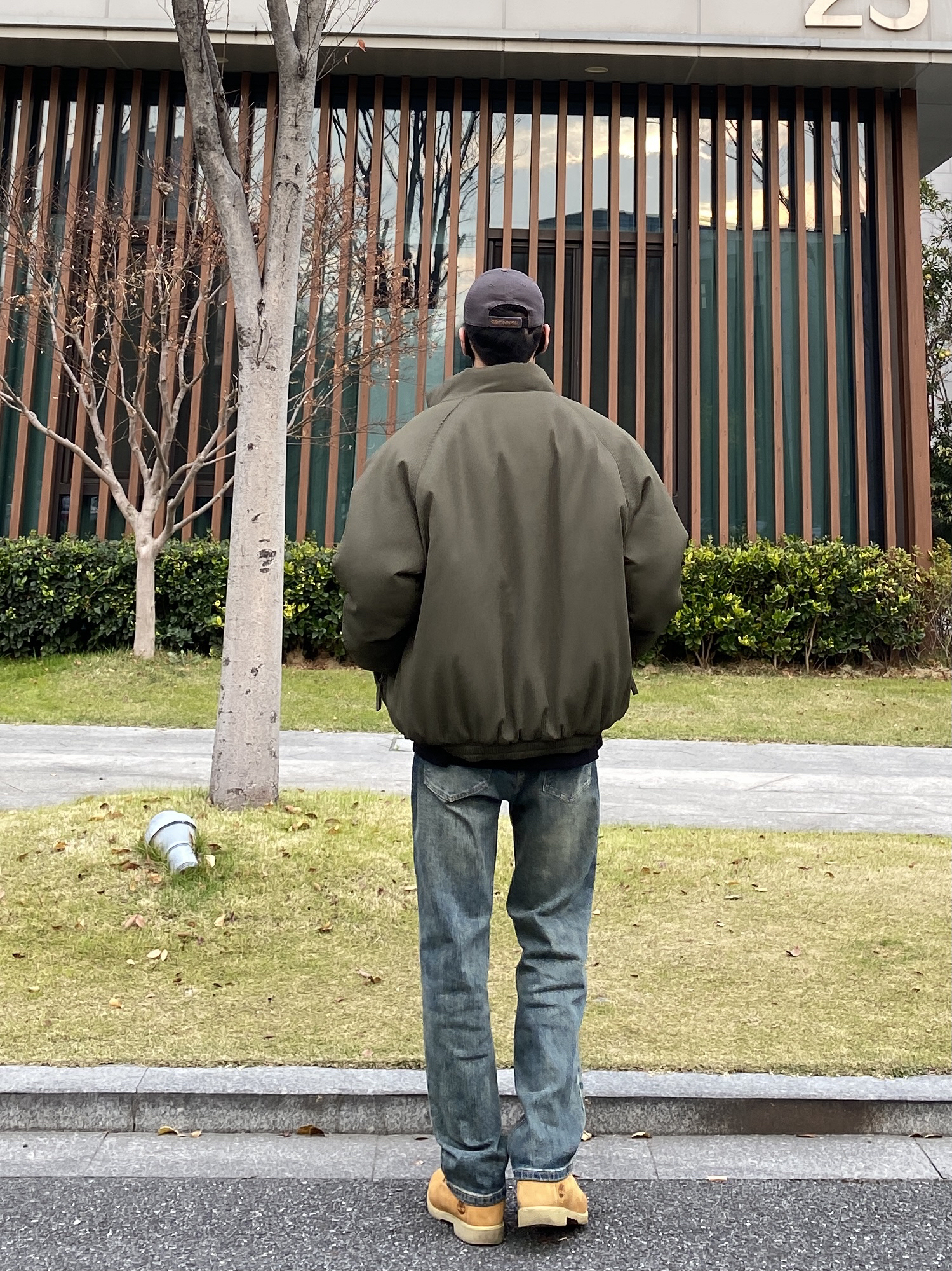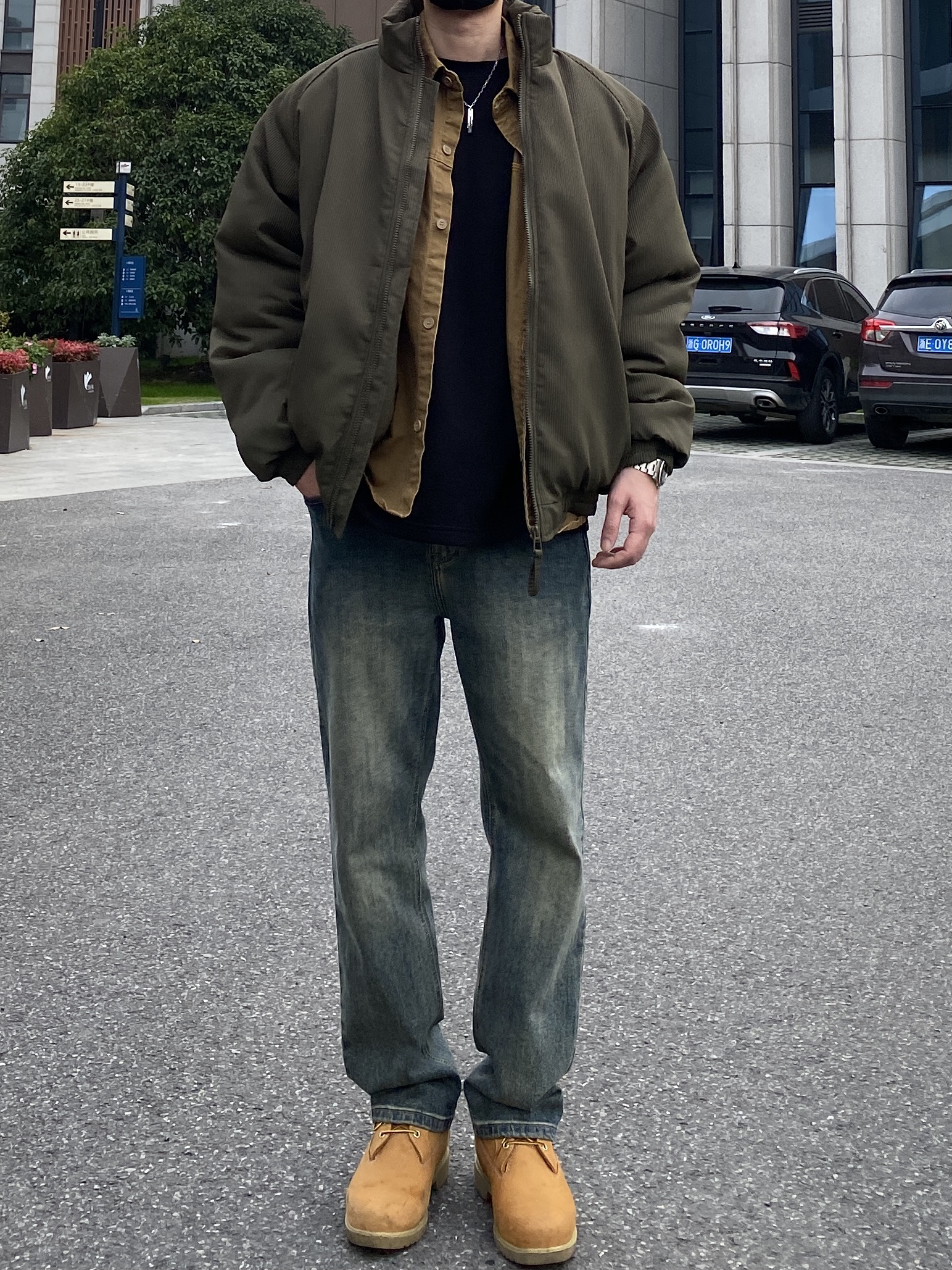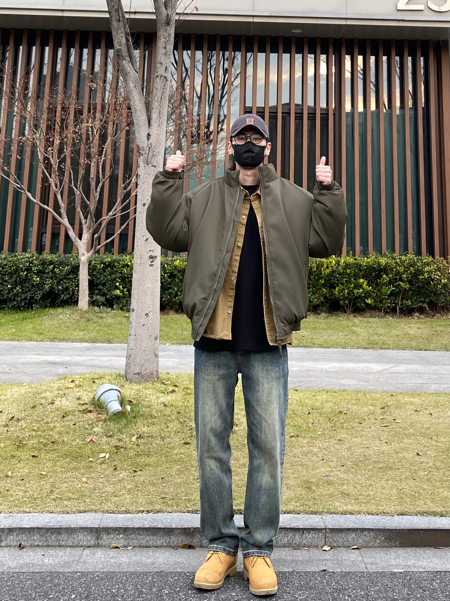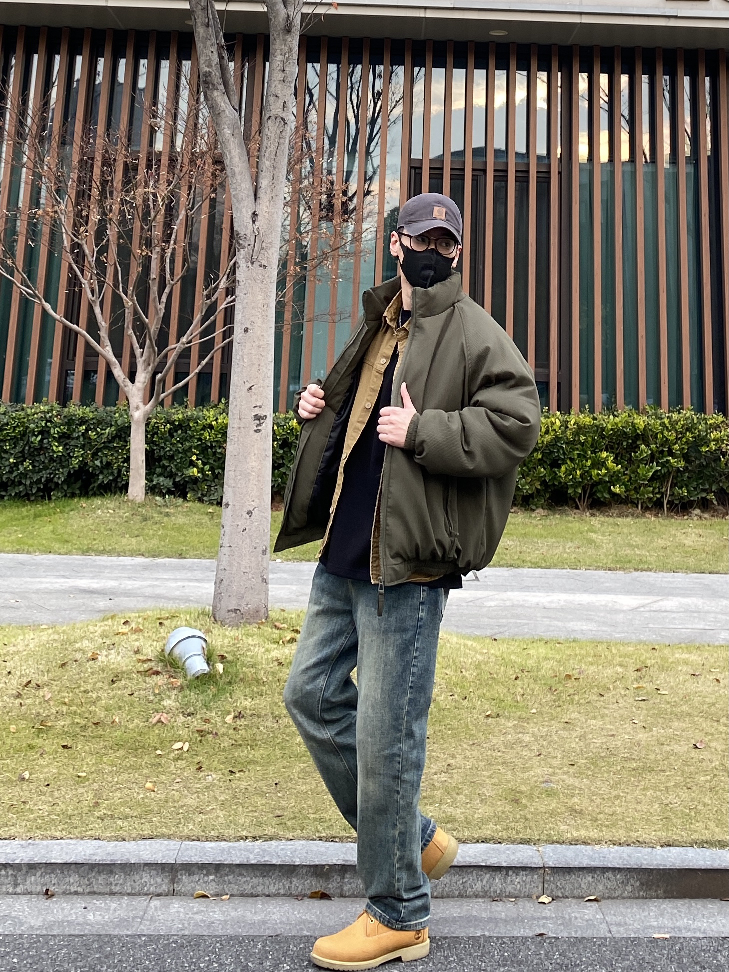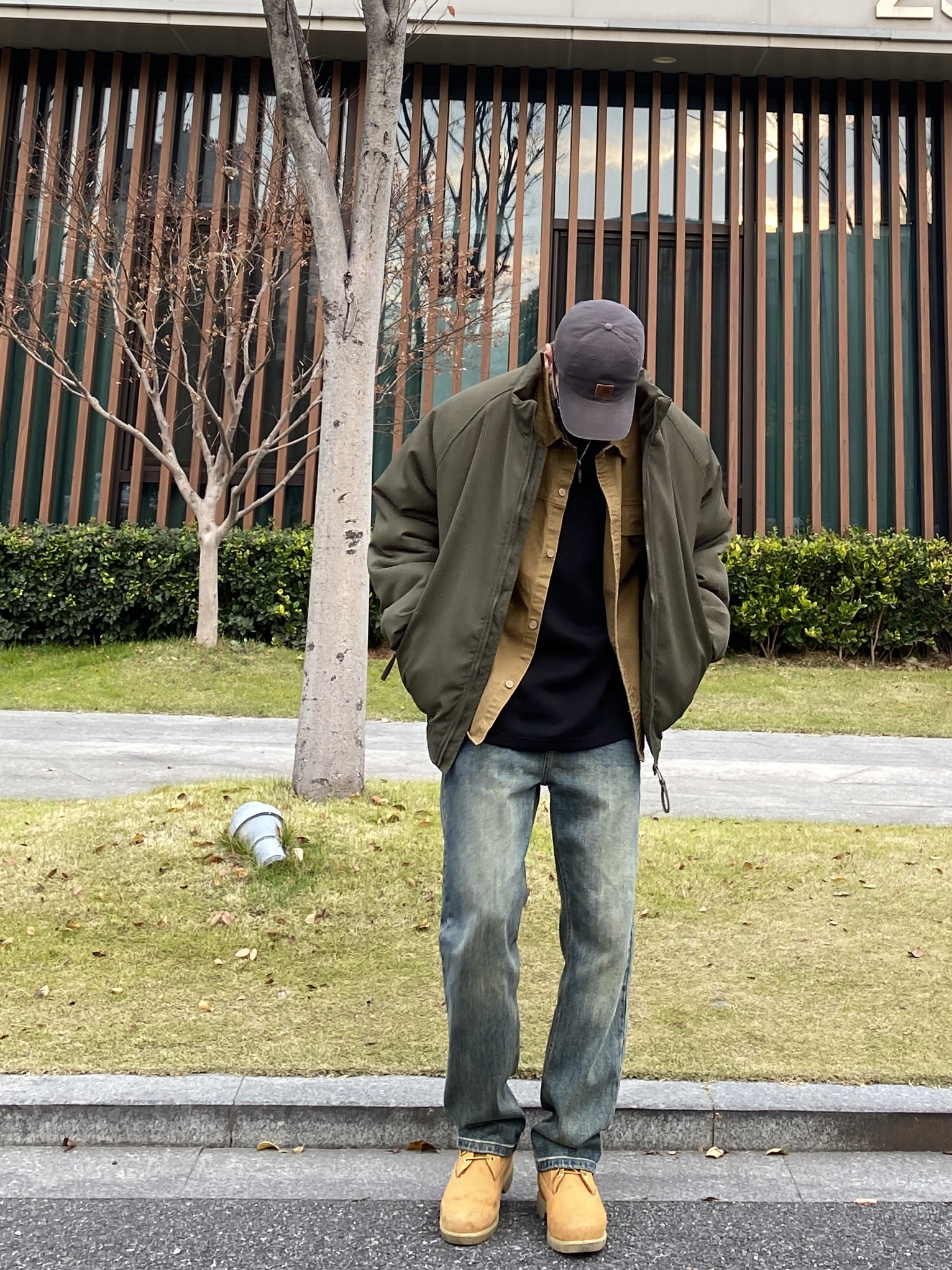 今天这套先用卡其色做旧工装衬衫做叠穿,裤子选择不挑腿型的水洗直筒牛仔裤,鞋子上脚经典百搭的timberland工装靴,接着套上军绿色宽松阔版插肩袖立领棉服夹克,最后戴一顶深灰色做旧棒球帽,OK,出门看看搭配效果吧! - 今日穿搭 衣服裤子:NICE LILI 鞋子:timberland