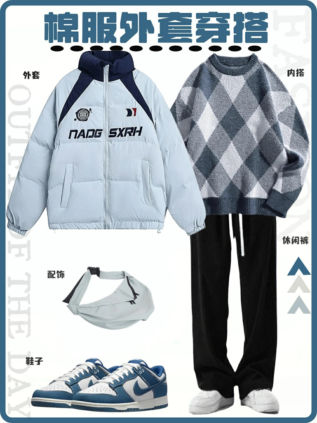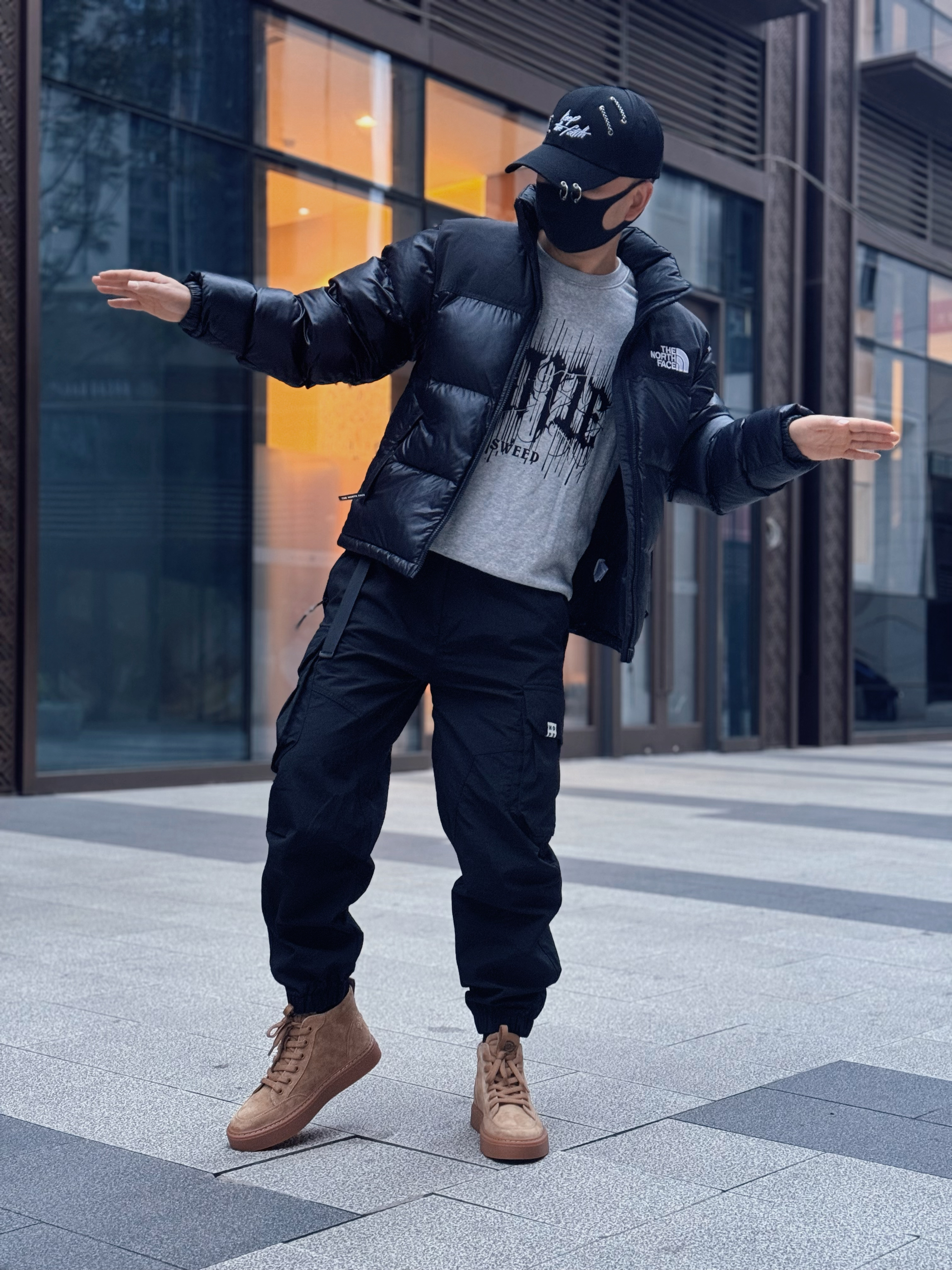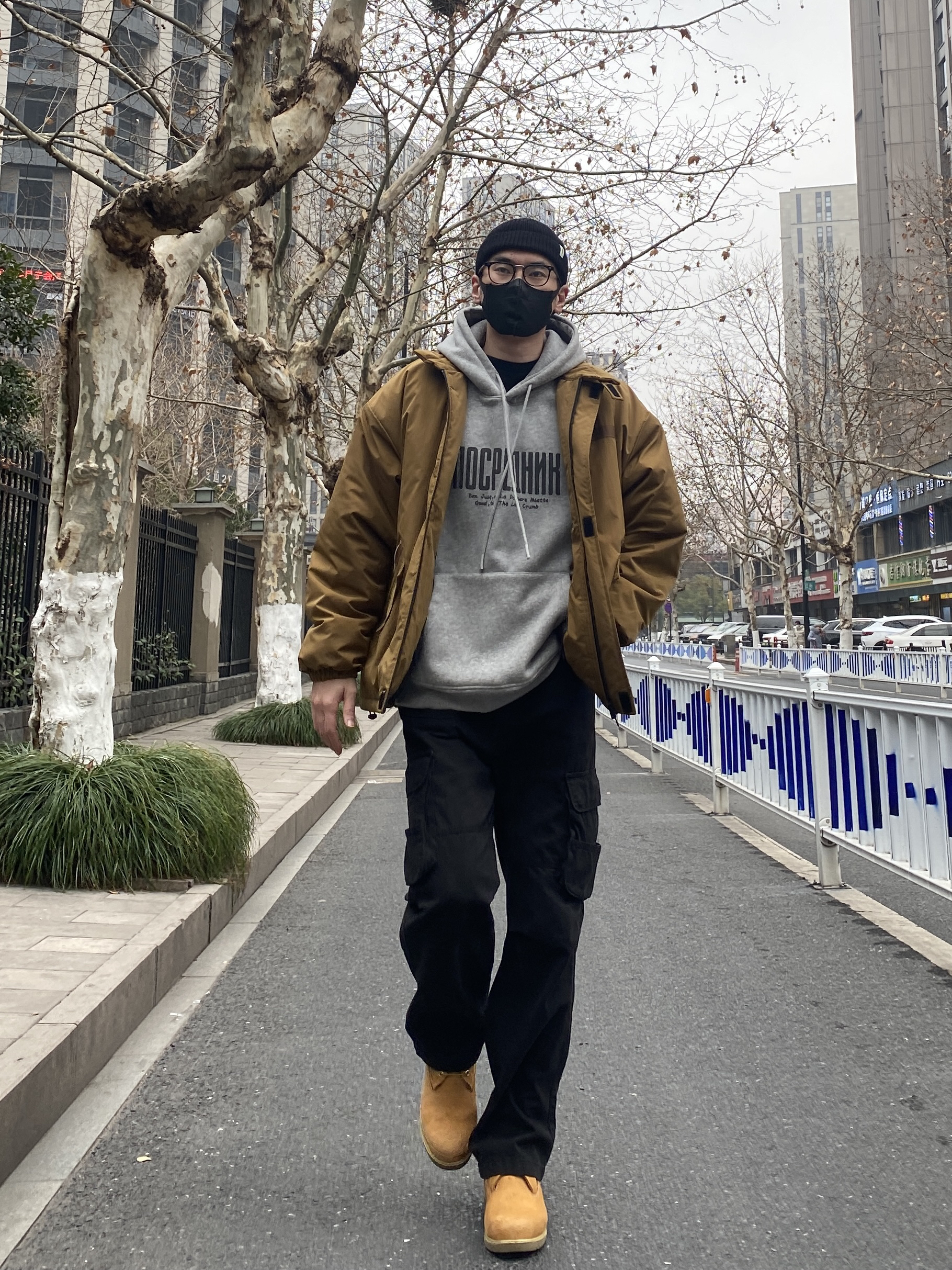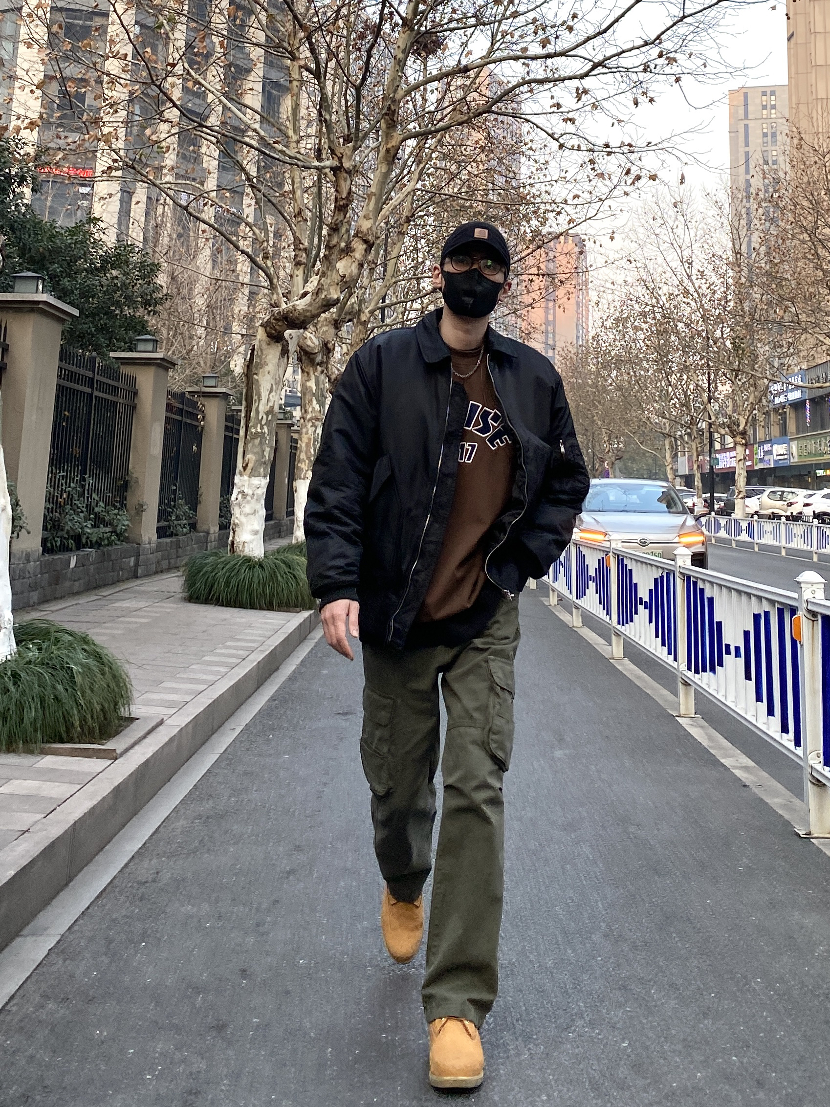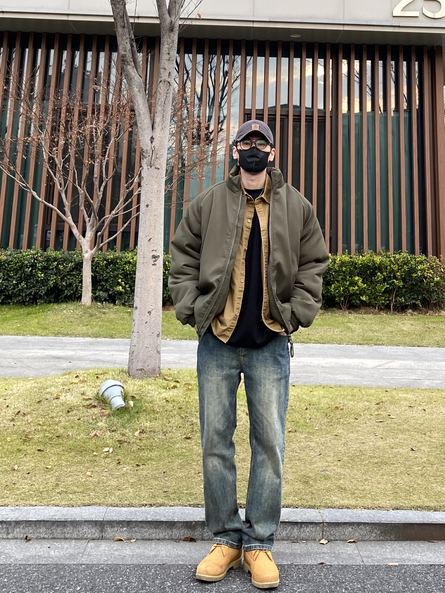 今天这套先用卡其色做旧工装衬衫做叠穿,裤子选择不挑腿型的水洗直筒牛仔裤,鞋子上脚经典百搭的timberland工装靴,接着套上军绿色宽松阔版插肩袖立领棉服夹克,最后戴一顶深灰色做旧棒球帽,OK,出门看看搭配效果吧! - 今日穿搭 衣服裤子:NICE LILI 鞋子:timberland