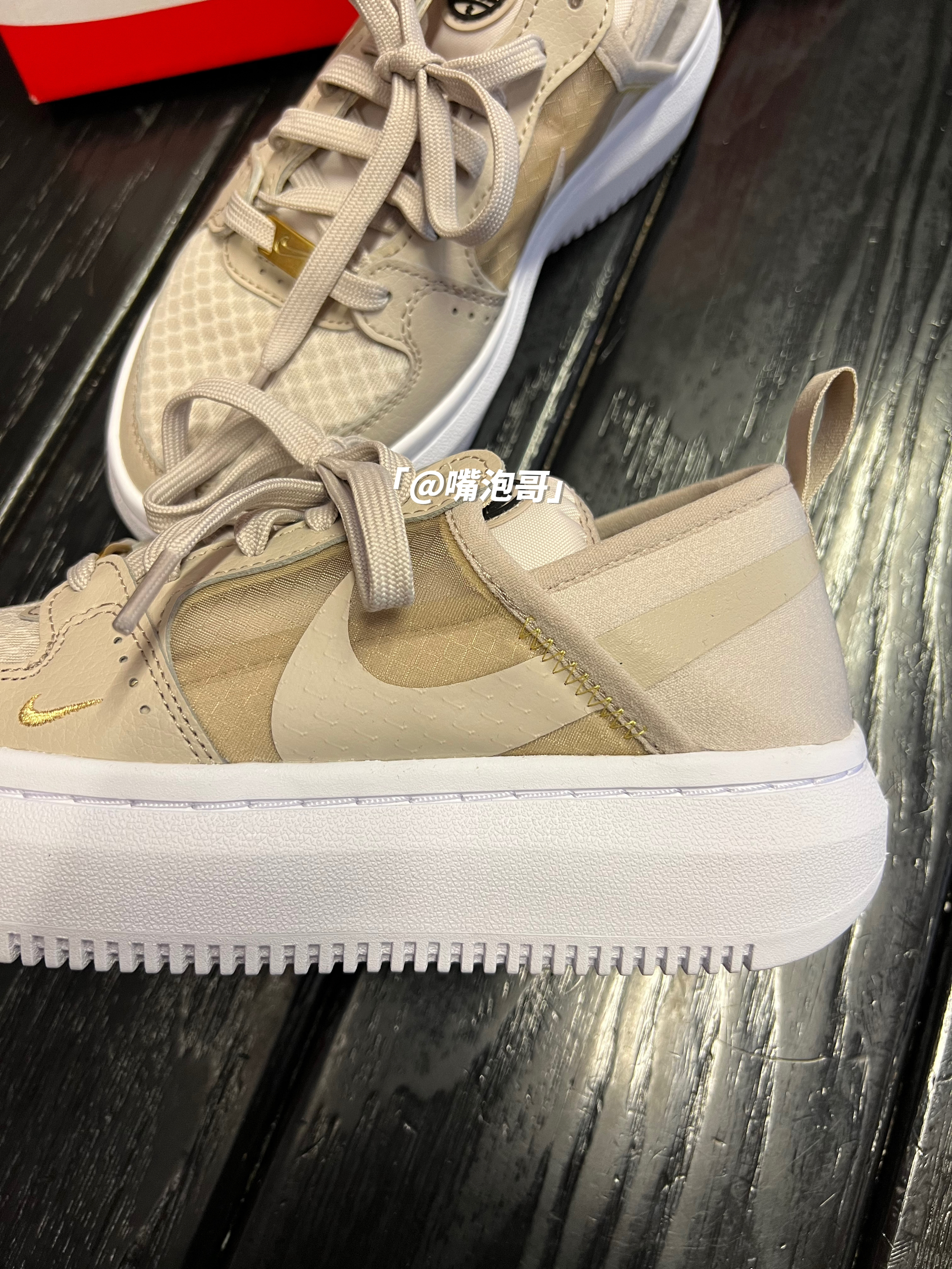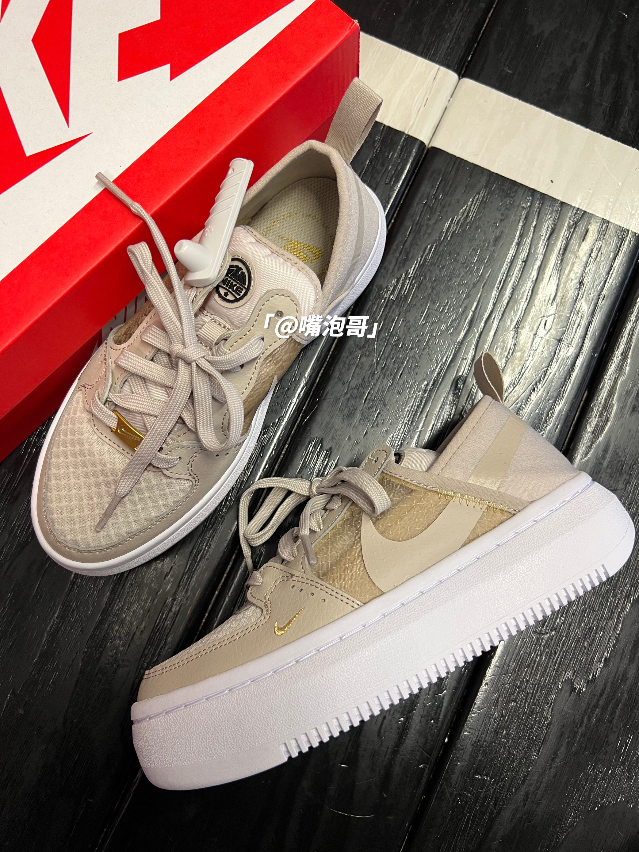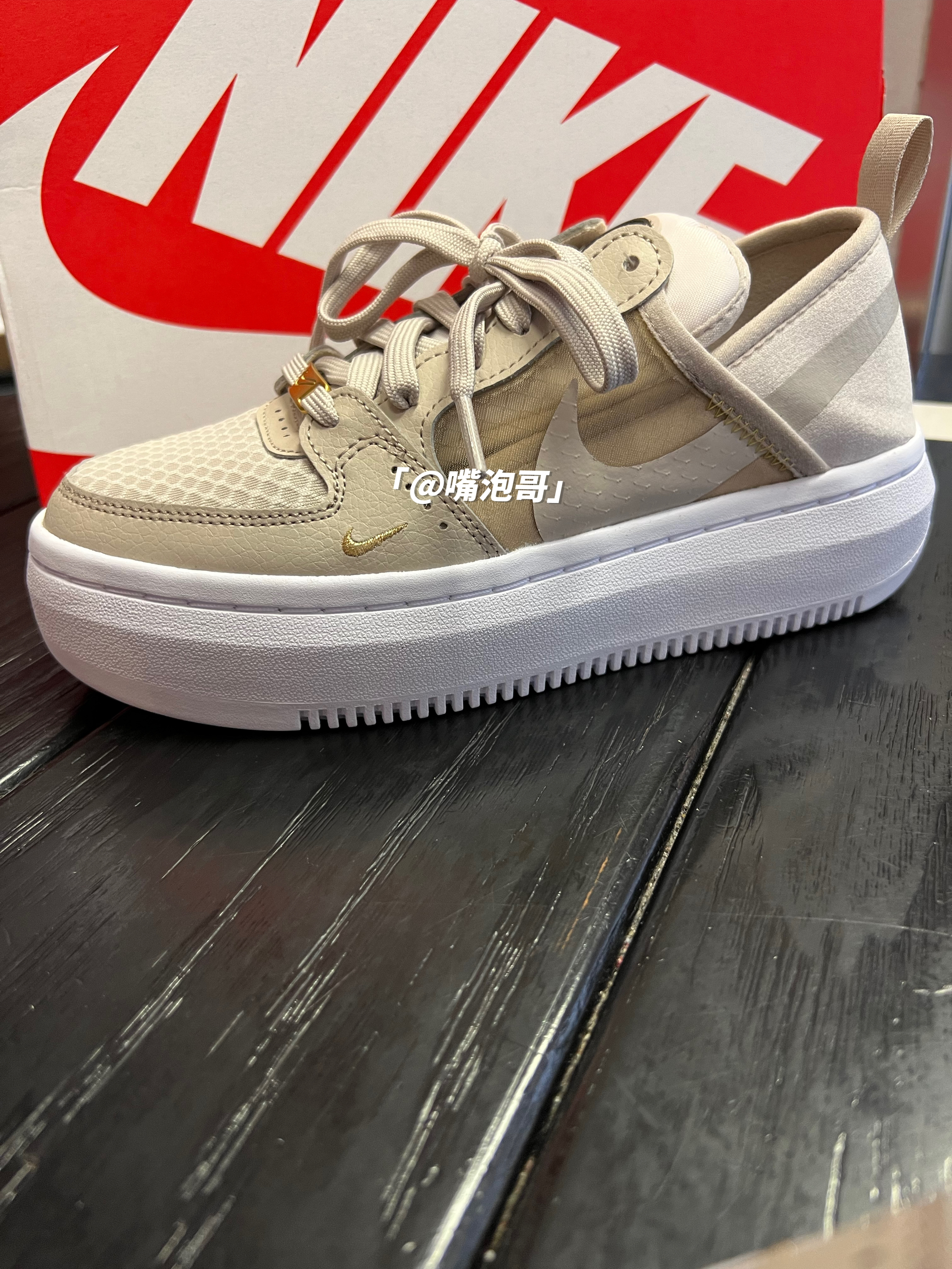 👟:Court Vision Alta 浅褐色 简介: 鞋款是使用Court Vision 鞋型进行设计创作,其中大底进行了加厚设计,使鞋款具备5公分左右的增高效果,并且鞋面运用了大量透气性网眼布材料,使鞋款更适合夏日的穿搭。 细节: 鞋面选用了复合织物与复合皮革拼接而成,鞋头面选用了透气性更好的复合网眼布材料制作,鞋身两侧也是叠加了半透明复合蝉翼材料,并融合swoosh印花图案,减轻...