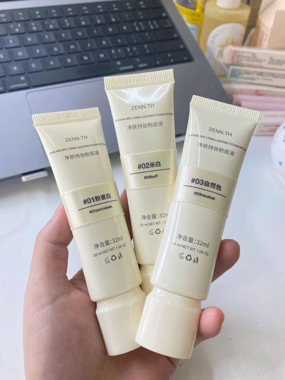 zennth粉底液,我买的是02色号,对我来说偏白了,更适合偏粉的皮肤 真的看了很多测评才去买的,都说持妆好,也服帖,可以跟大牌粉底媲美了,我来说说我的使用感受 1质地:粉质不算细腻,流动性弱,延展性还行,但是好的很快,要注意上妆手法 2上妆效果:是比较雾面粉妆效,遮瑕力中上属于偏厚重的粉底液,后期和皮肤融合得很好(也不知道是不是掉光了)我用的量比较少,但是夏天出汗会冒白色,非常致命!持妆效果:油...