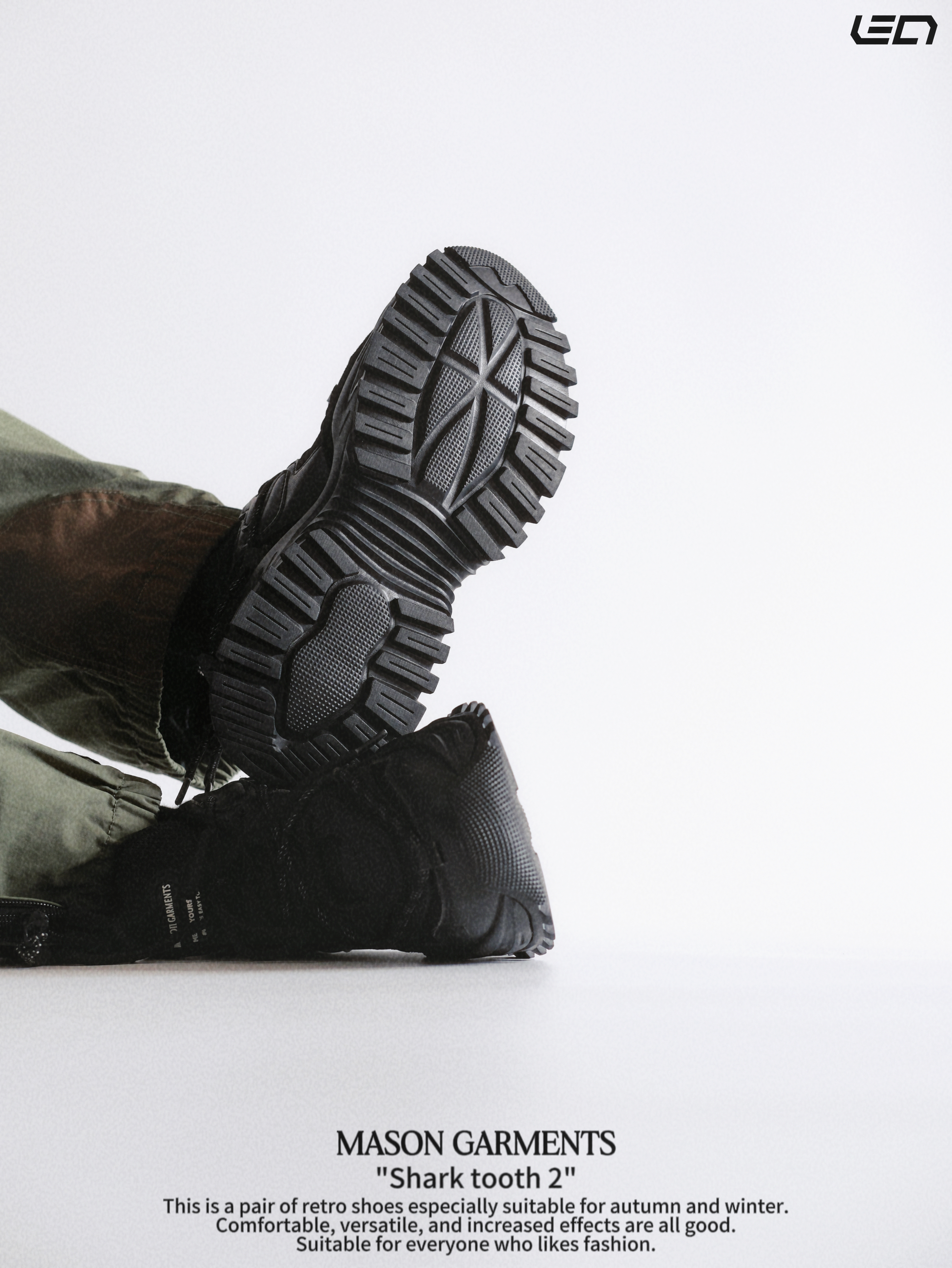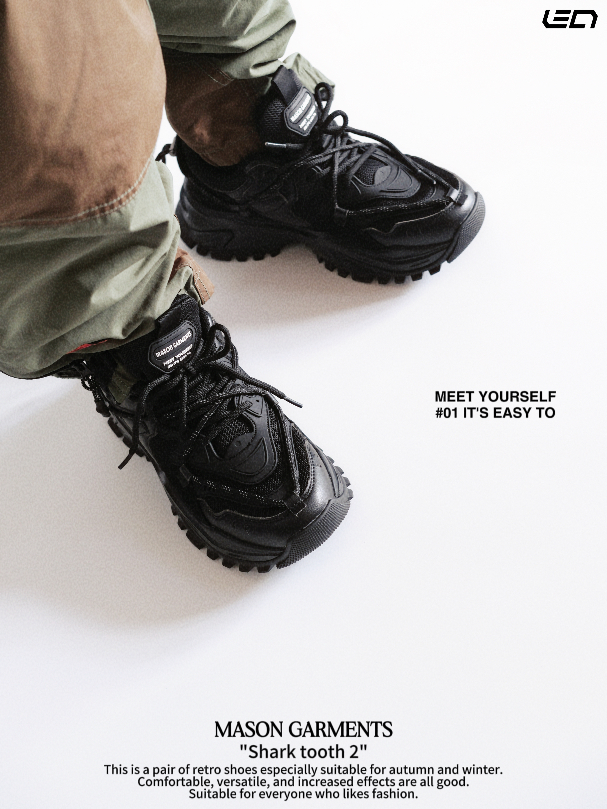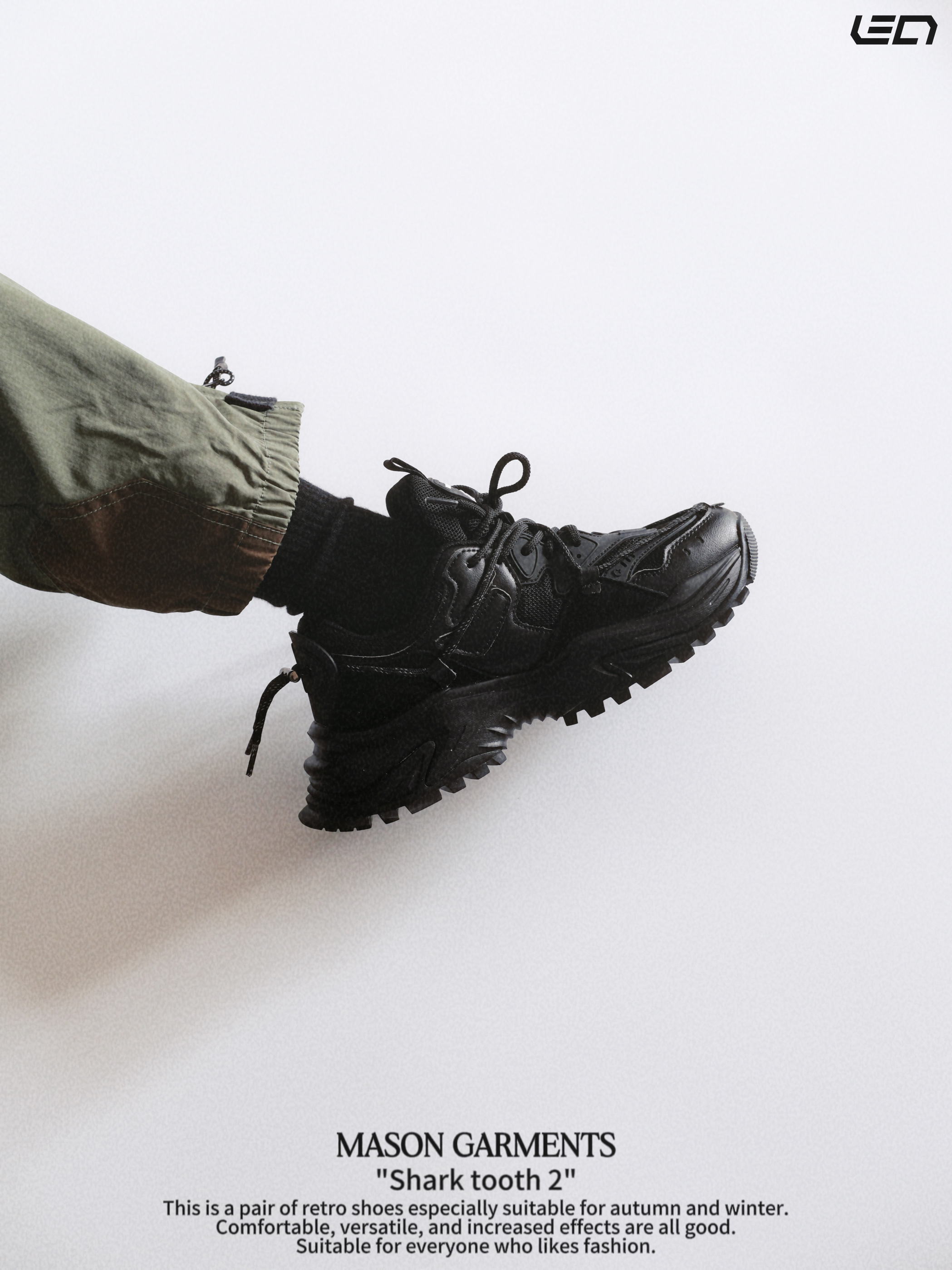 - 对于现在的潮流穿搭趋势来说“老爹鞋”一直都是非常百搭的存在👌🏻既可以很潮流也可以复古,总的来说吧,就是好搭配,冬季更是简单高效的存在👌🏻 - masongarments的这双“鲨齿2号”鞋面鞋身以翻毛皮以及皮革打造,主打一个质感吧👌🏻配色是纯黑色的很耐脏,而且百搭,解构风的鞋面设计搭配上厚底增高的设计👌🏻搭配各种风格的裤装都挺适配。 -