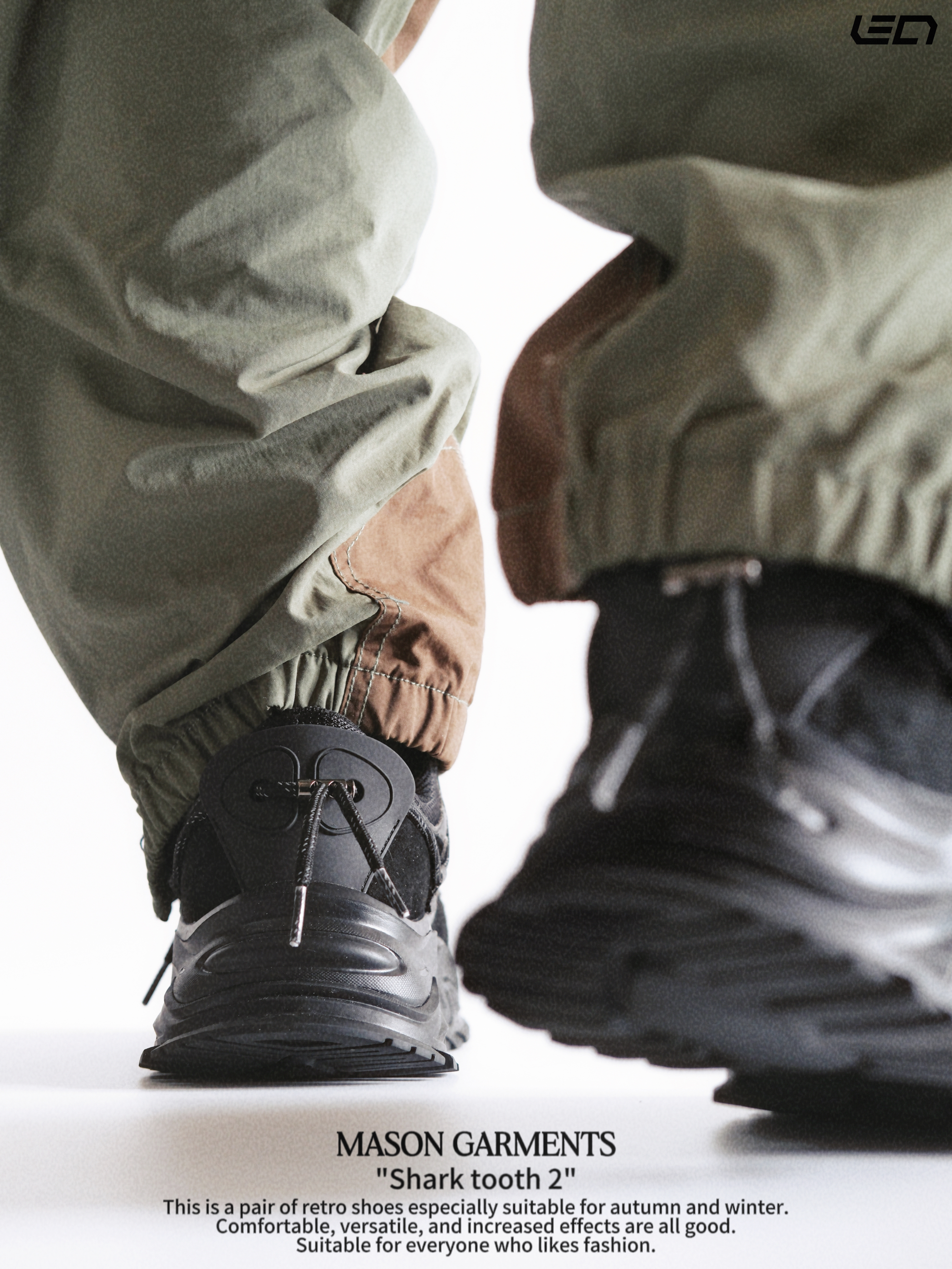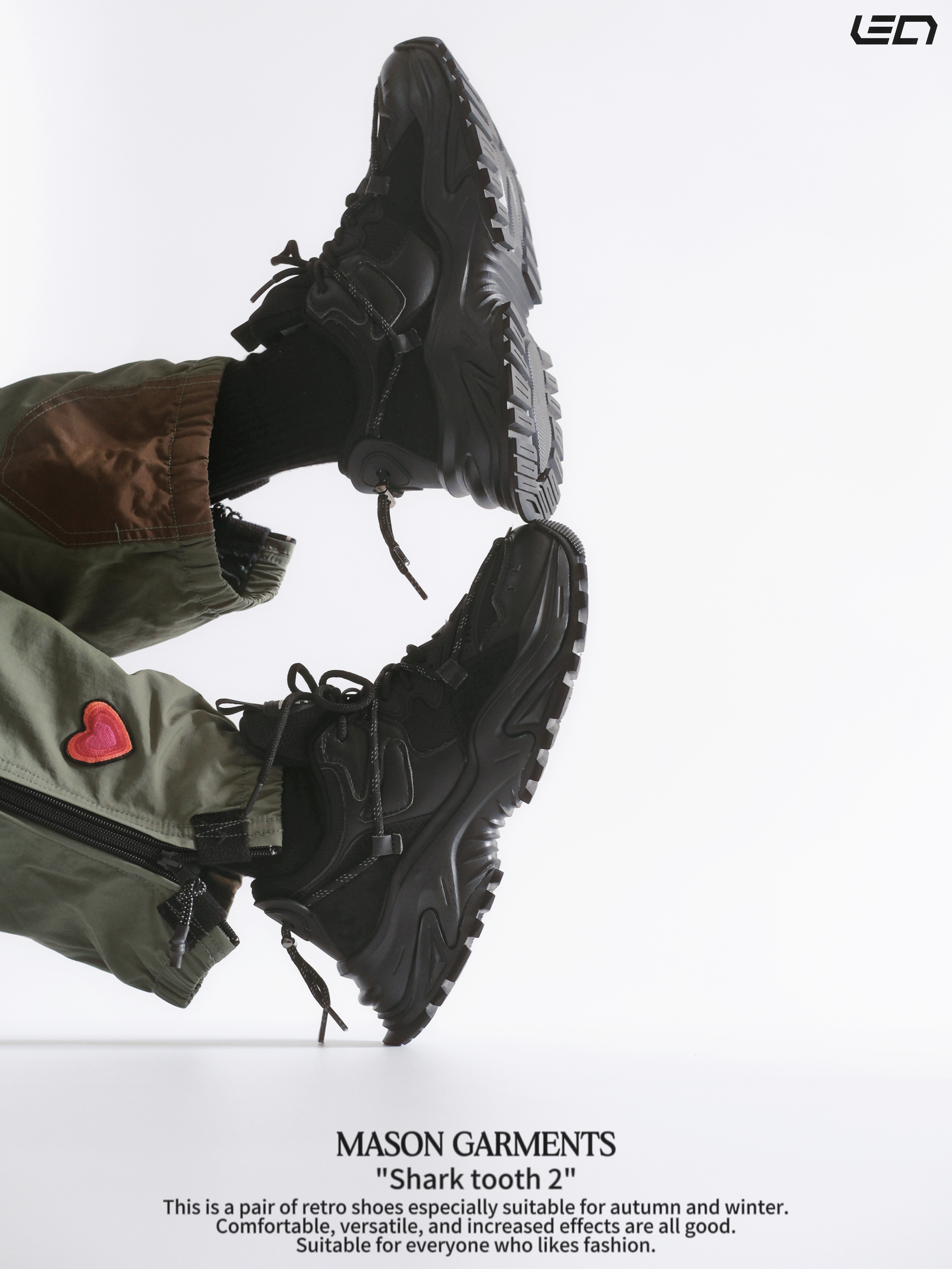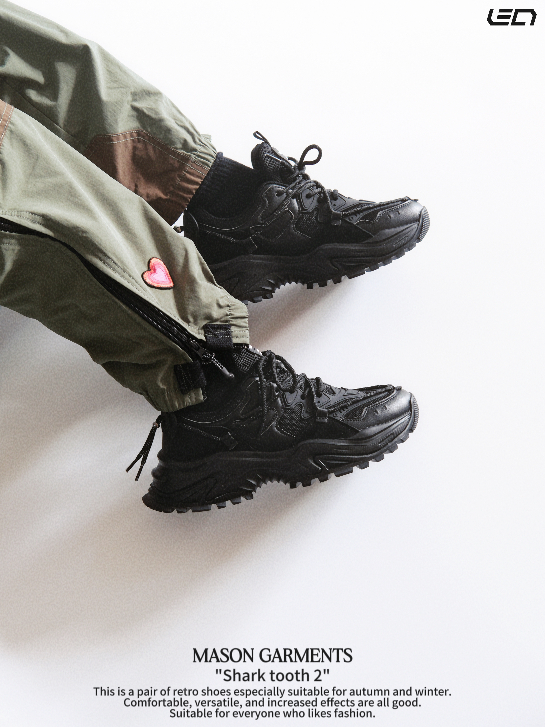 - 对于现在的潮流穿搭趋势来说“老爹鞋”一直都是非常百搭的存在👌🏻既可以很潮流也可以复古,总的来说吧,就是好搭配,冬季更是简单高效的存在👌🏻 - masongarments的这双“鲨齿2号”鞋面鞋身以翻毛皮以及皮革打造,主打一个质感吧👌🏻配色是纯黑色的很耐脏,而且百搭,解构风的鞋面设计搭配上厚底增高的设计👌🏻搭配各种风格的裤装都挺适配。 -
