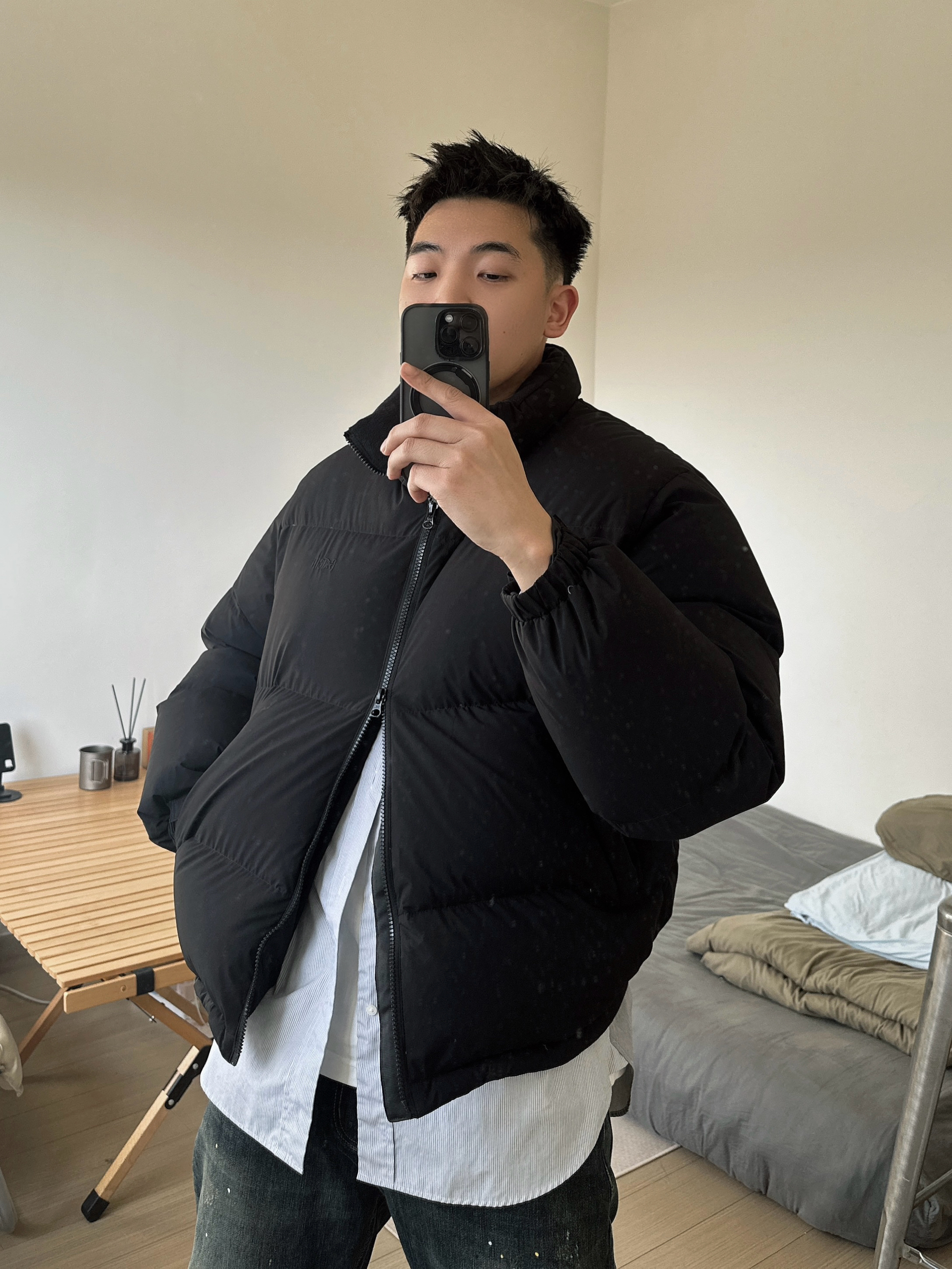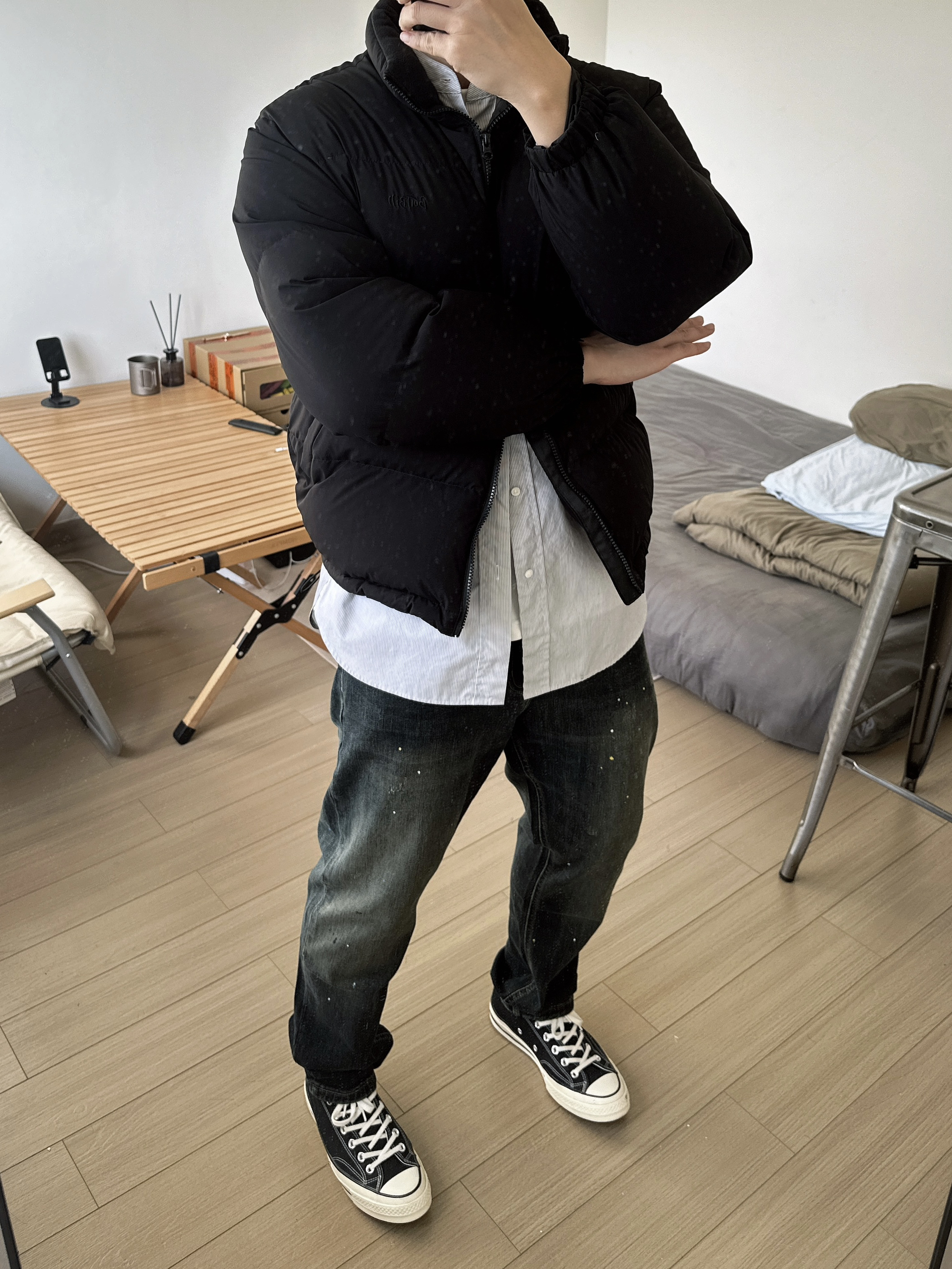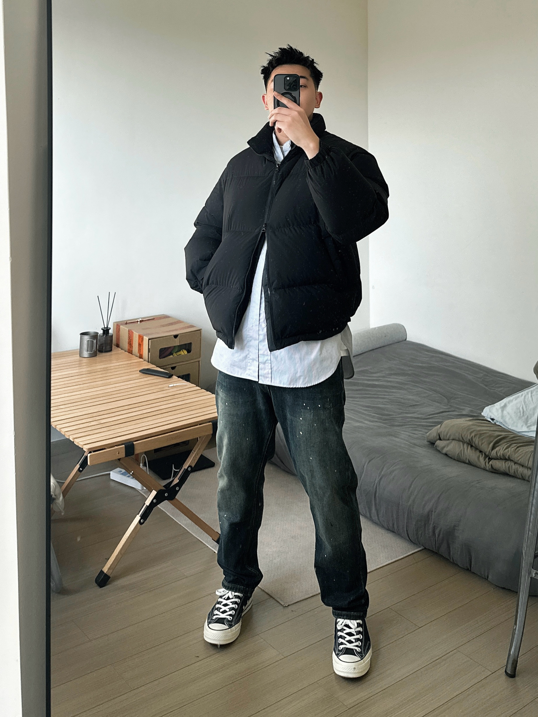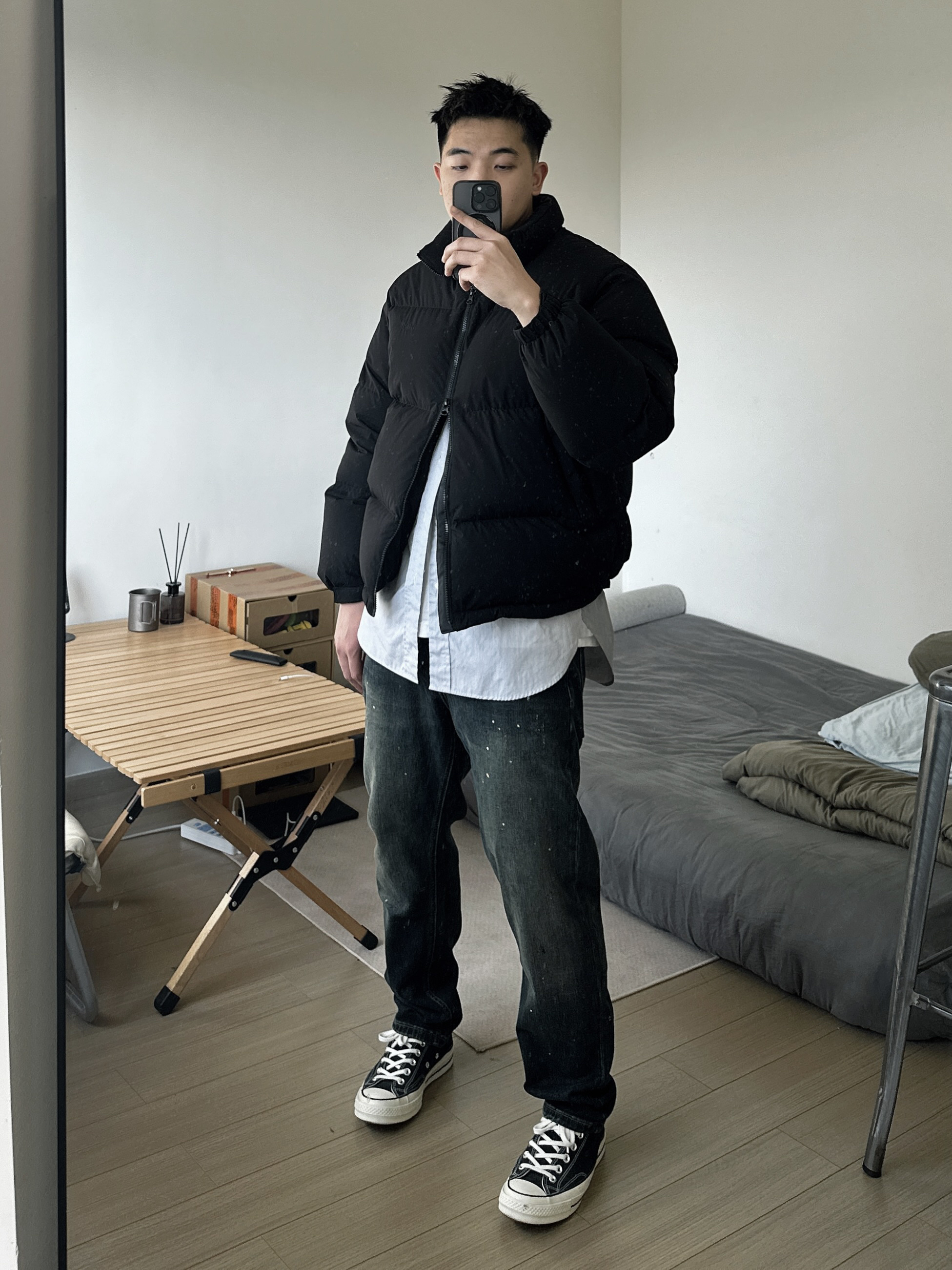 入冬少不了一件皮实耐穿的羽绒服。 在广东羽绒服的使用场景不多,挑简约百搭款还是比较有性价比,黑色系也比较耐脏。版型有设计小巧思,前短后长,侧面有廓形。 裤子选择了一条泼墨牛仔裤,版型比较合身。搭配我的黑色帆布鞋,很经典的一套搭配!
