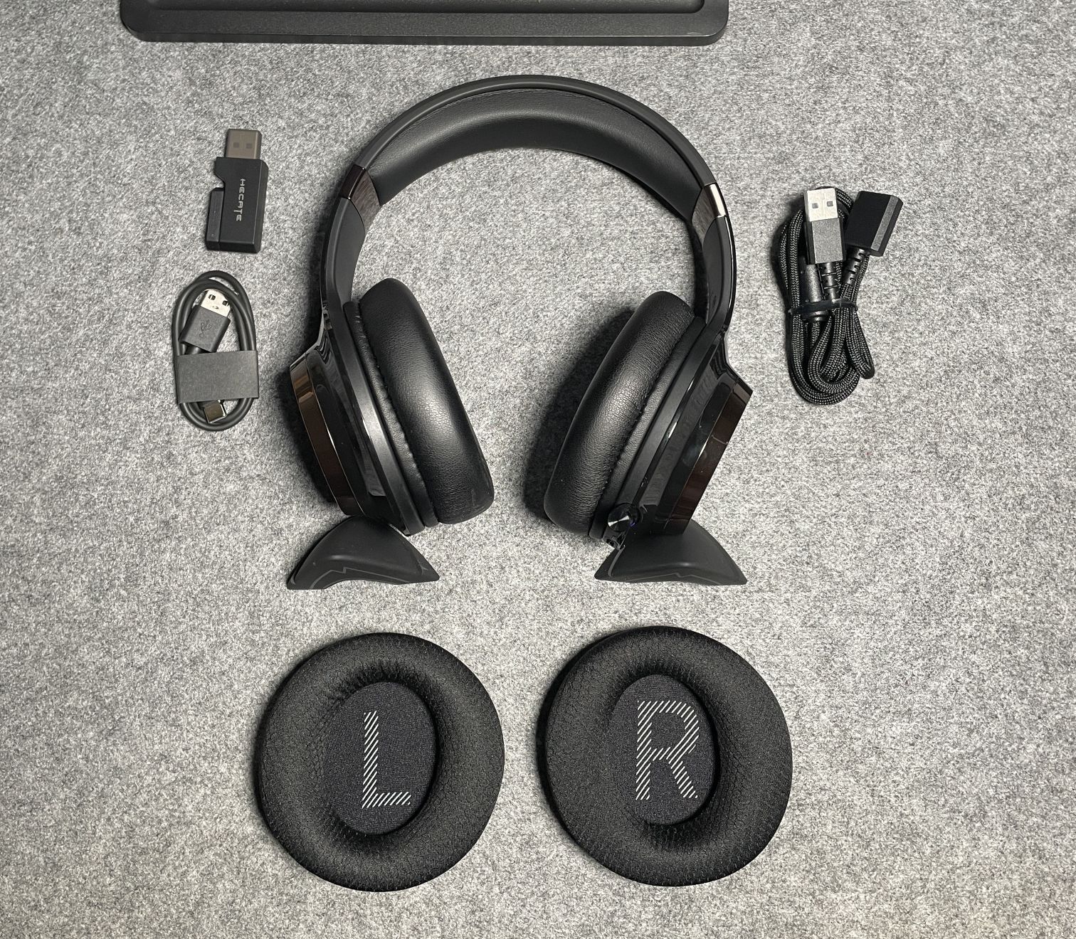 拿到耳机的第一时间就不禁感慨,这耳机的包装盒是真的大,同时质感也很好,很适合作为礼盒送给朋友,有一说一,送漫步者G6 Pro 给朋友真的是太酷了,满满的机械风格。配件部分也很齐全,除了耳机、2.4GHz接收器、充电线之外,还有延长线、另外赠送的一对耳套、猫耳、说明书保修卡,以及品牌卡和技术卡片。