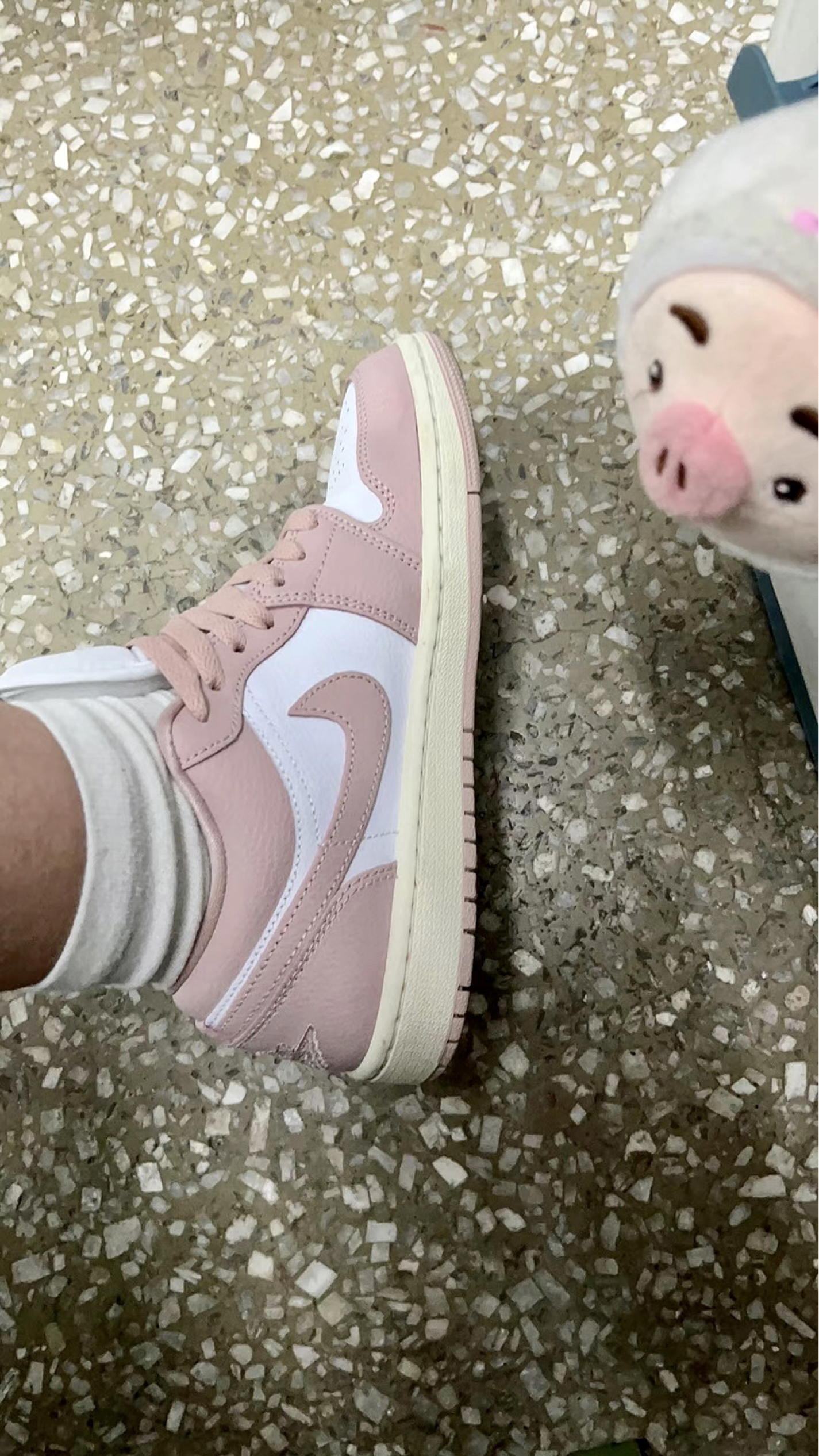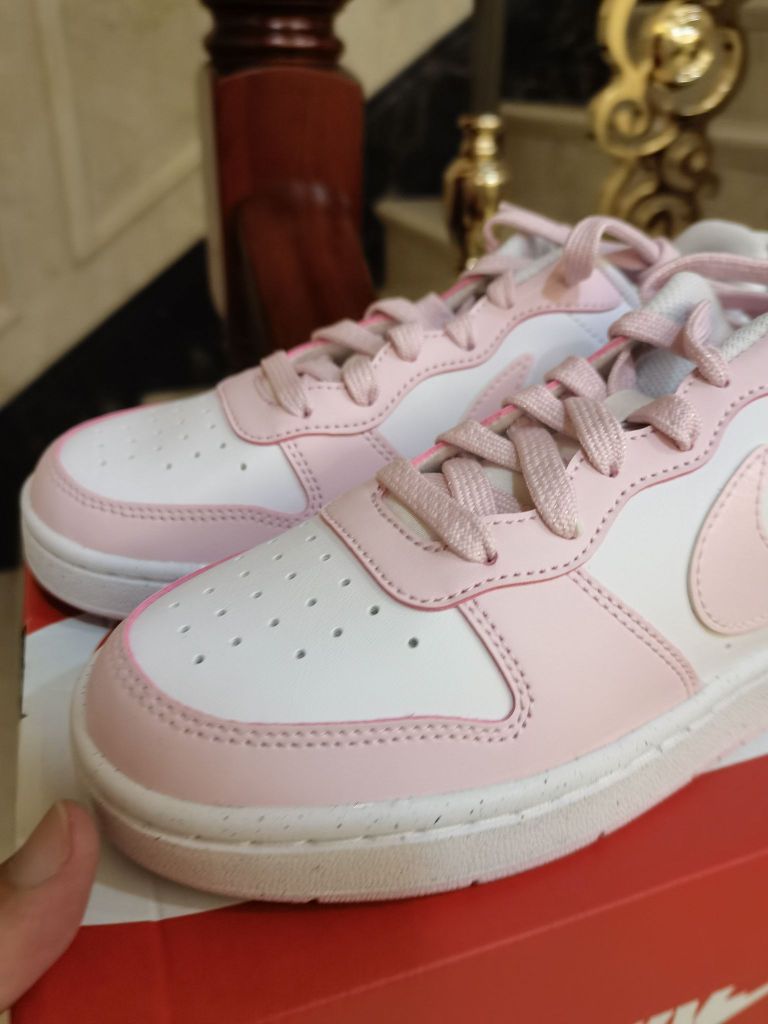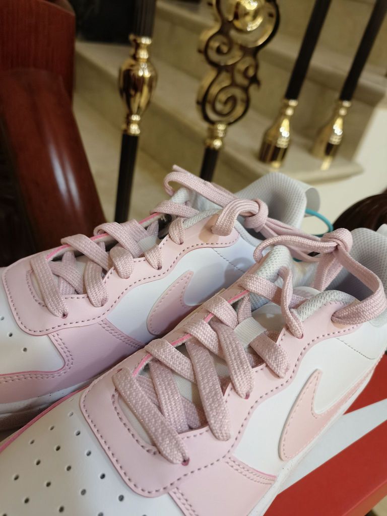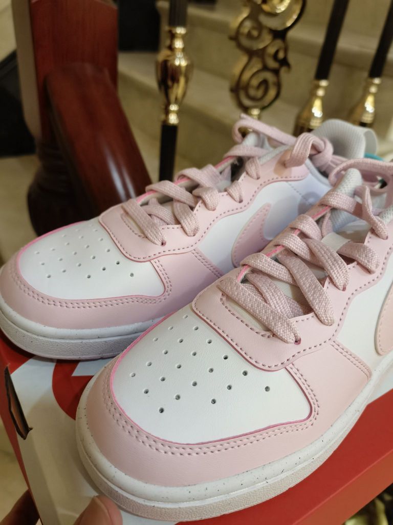 nike court粉白色配色 真的是小仙女的一款配色 颜色非常好看并且百搭 皮料方面也是很好打理的哦 搭配牛仔裤和休闲裤也都是不错的 脚感方面就比较一般 性价比还是非常高的哦 非常值得入手