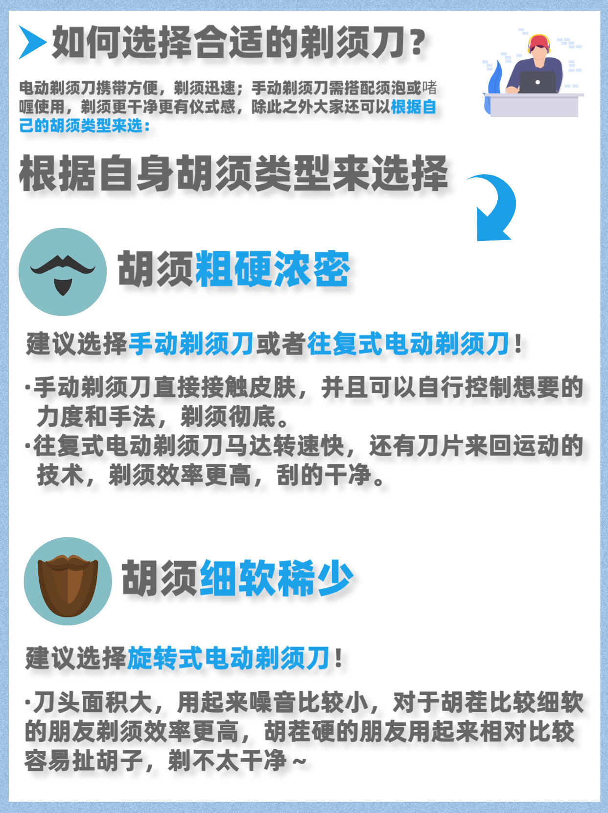 再过一段时间就要到圣诞节了,跨年夜也接踵而至,那最近有朋友问我男生礼物该怎么送?我个人认为剃须刀是一个首选项,今天就给大家分享一期剃须刀保姆级挑选攻略~ - 如何挑选合适的剃须刀? 图一:电动剃须刀和手动剃须刀的特点 图二:如何根据自身胡须类型来选择? - 然后是我自用的两款剃须刀:吉列极光刀(手动)以及博朗五系(电动)。对于很多像我一样胡茬比较硬的男生,多数时候是一把电动+一把手动搭...