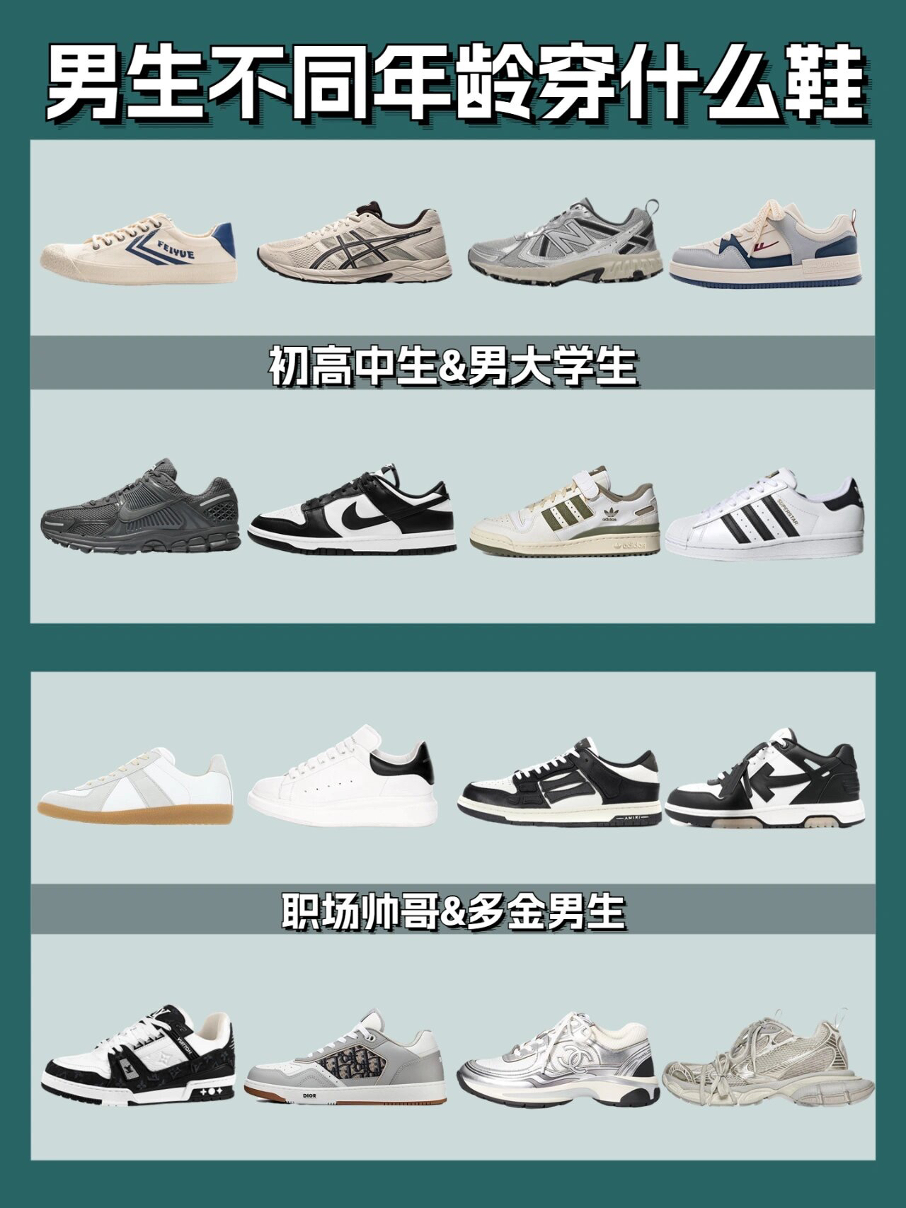 在穿搭造型中,鞋子起着画龙点睛的效果,同时也体现了穿着者的时尚品味。 因此,如何挑选一双合适的鞋子,就成了必修之课✅ 1️⃣对于很多初高中生来说,帆布鞋可能是你坠常穿的鞋? 比如匡威1970s,又或者飞跃回力这种性价比超高的硫化鞋~ 2️⃣步入大学后,大家有了更多的机会关注潮流,nike dunk呀adidas的yeezy呀也慢慢穿起来了~ 3️⃣再到毕业后,职场通勤必备的小白鞋也得准备起...