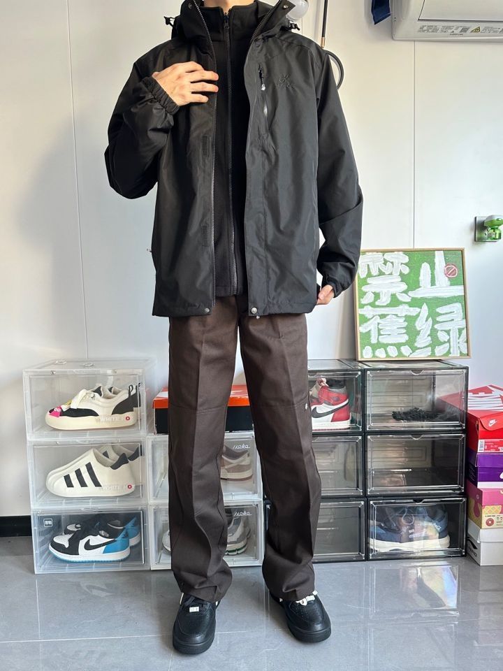 ✨户外出行必备的冲锋衣,怎么能少了黑色这一款!防风防水,抓绒可拆卸内胆三合一设计,帽子也可拆卸,面料厚实舒适柔软,真的太绝了!秋冬登山、户外活动再也不用担心风吹雨打了! ✨搭配上一条深棕色的工装裤,简直是酷到爆炸!这款宽松直筒版型的Dickies休闲长裤,不仅能展现个性,还能带来更好的舒适感。 ✨这套搭配真的是酷出新高度!黑色冲锋衣与深棕工装裤的组合,不仅给人一种硬朗帅气的感觉,还能展现出你的户外...