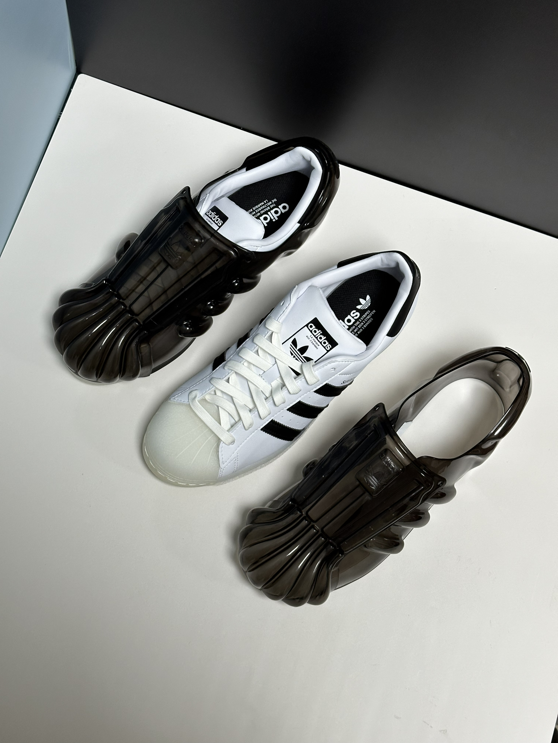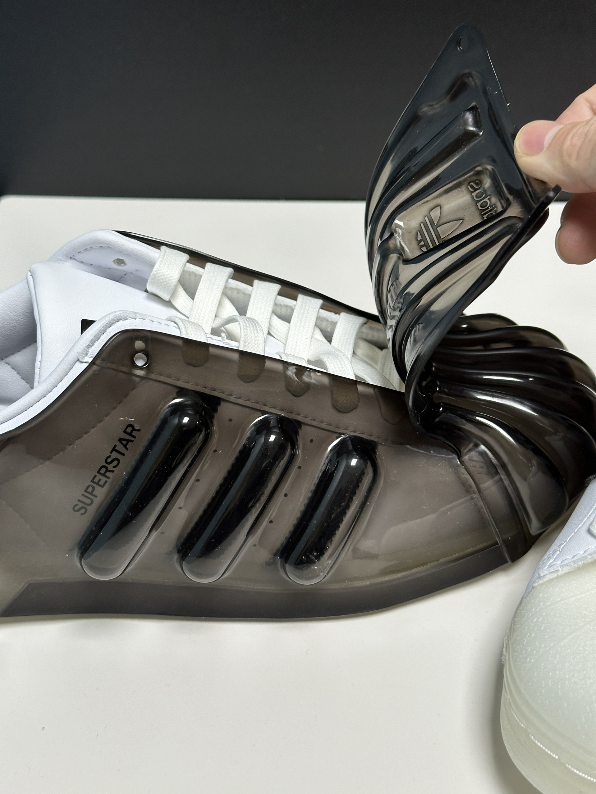 很早就在关注的一双贝壳头新款,透明膜外壳是亮点,不是完全贴合的外观,而是做了一些气泡感觉的膨胀感,其实以前贝壳头也有过膨胀外观的设计,之前那款是鞋头和鞋底的材料做了膨胀感鞋,有点像棉花糖的感觉,这双加了气泡外壳就更像泡泡糖的感觉。除了外壳以外,鞋头贝壳头和鞋底也用了果冻底设计,内衬用了皮革材质,质感很不错,规格很高