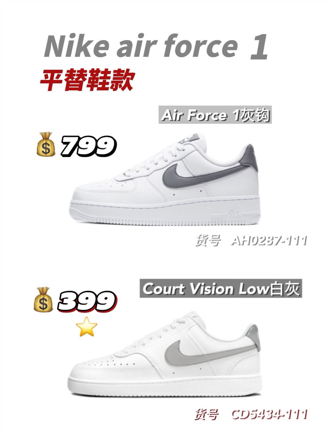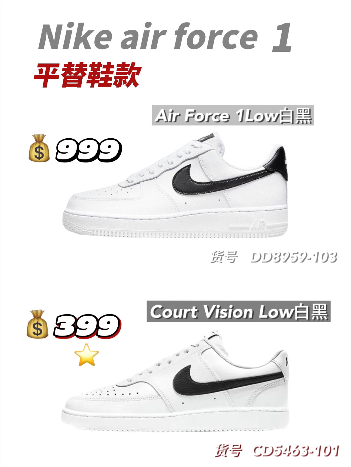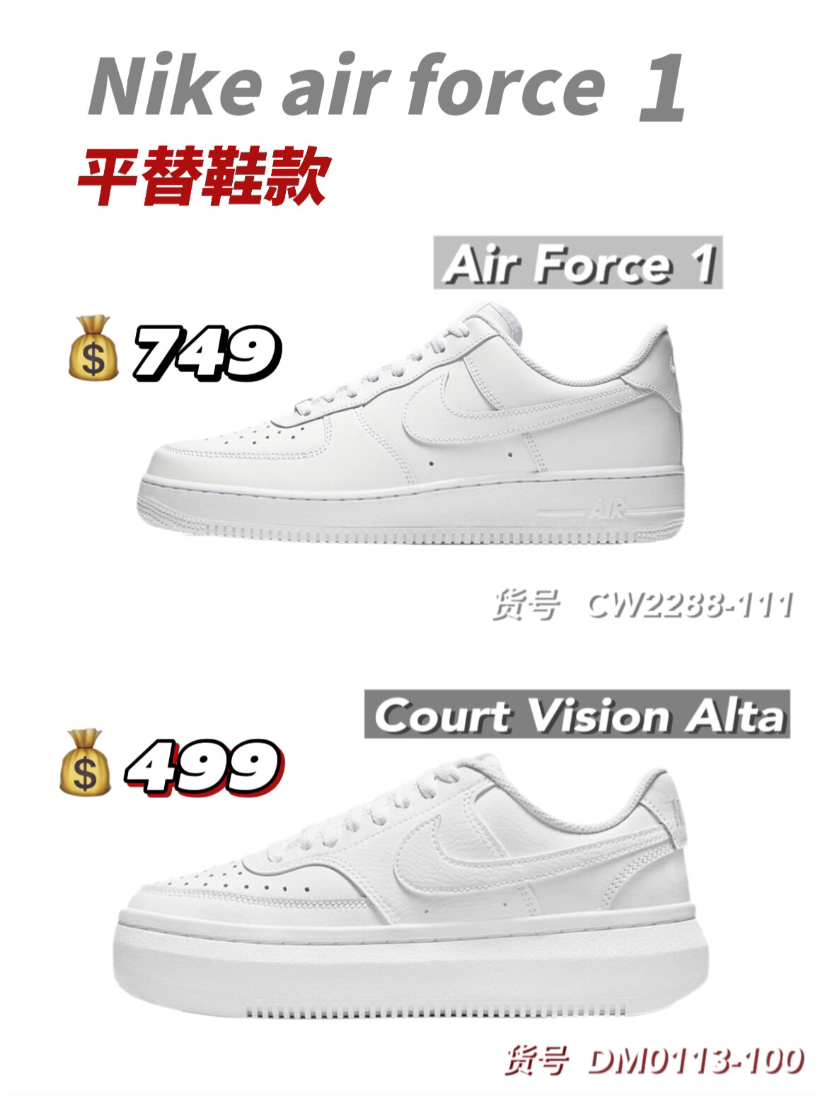铁打的营盘流水的兵,不变的鞋款换色的鞋。从aj到dunk,多少人为了--双鞋而奔波? 其实呀,咱就是说动动脑子动动手,咱们自己来搞搞平替不香吗?又不是没有那实力,今天来给大家整几双Nike air force1平替 🥝Nike Air Force 1"07白 货号:CW2288-111 749 Nike Court Vision Alta白 货号:DM0113-100 499 🥝Nik...