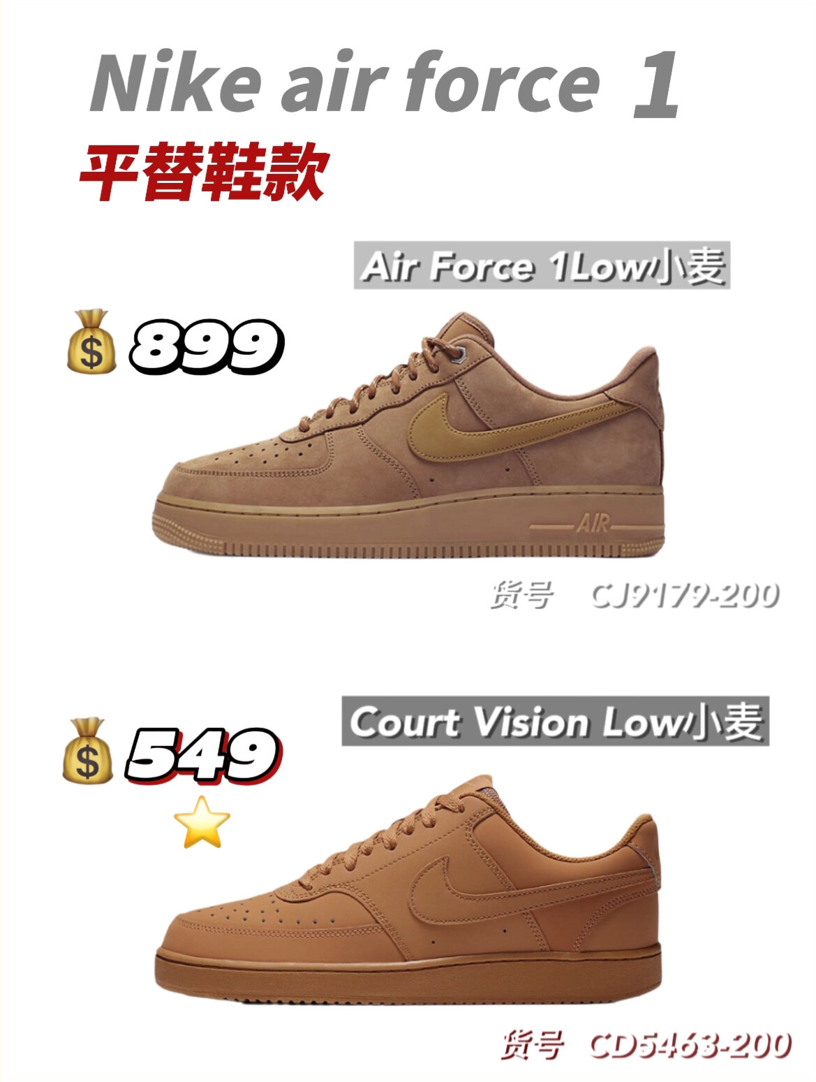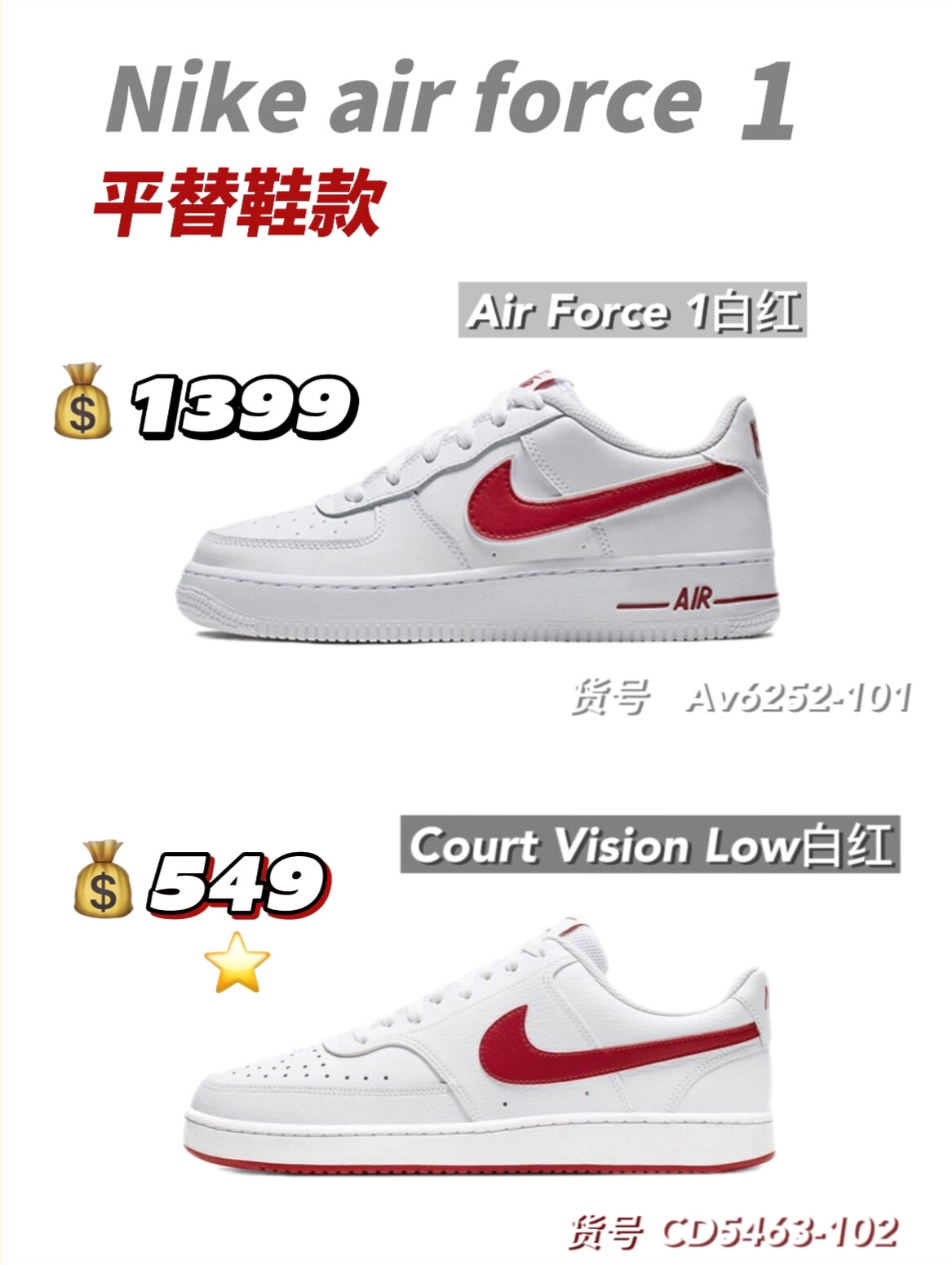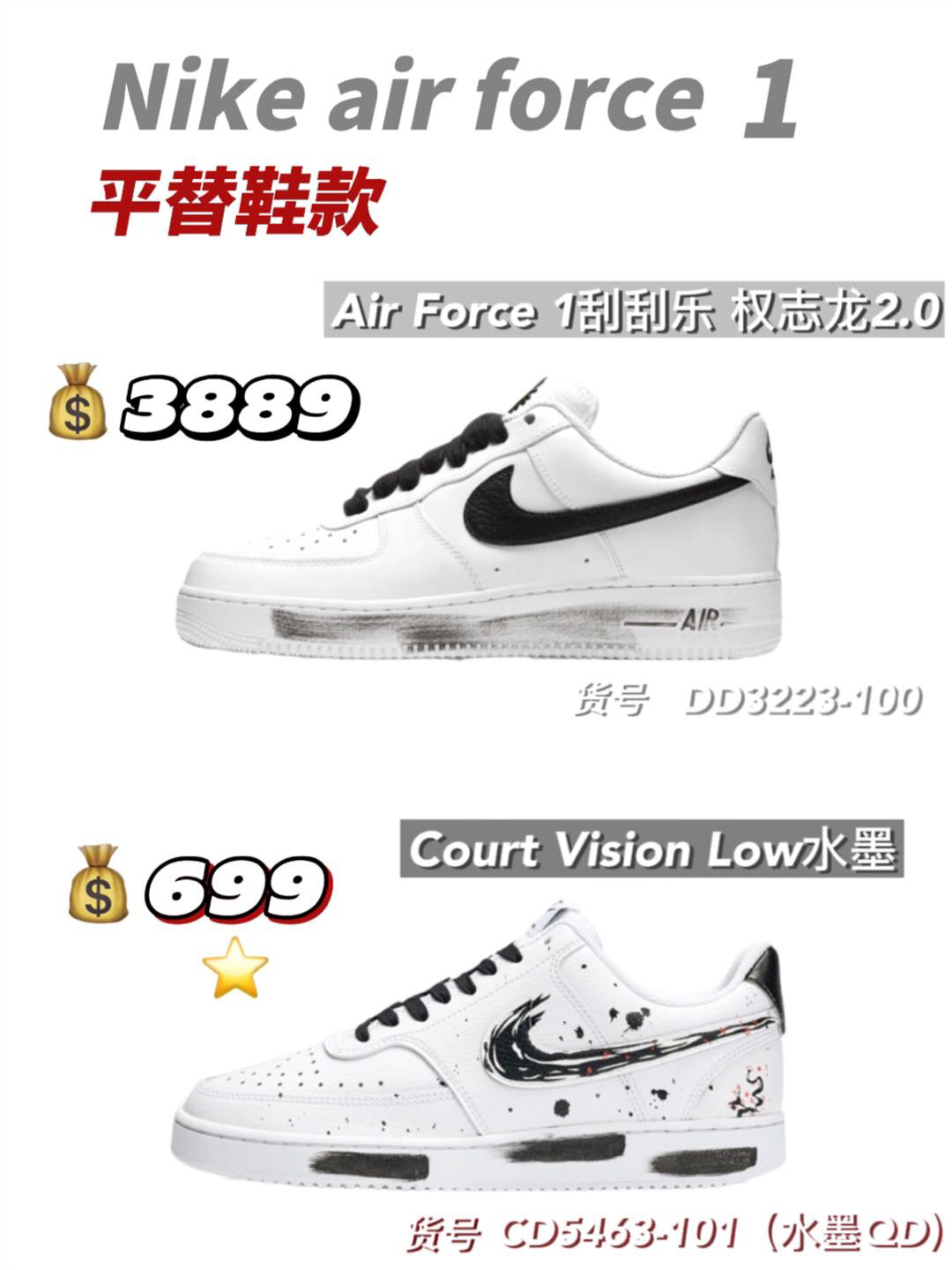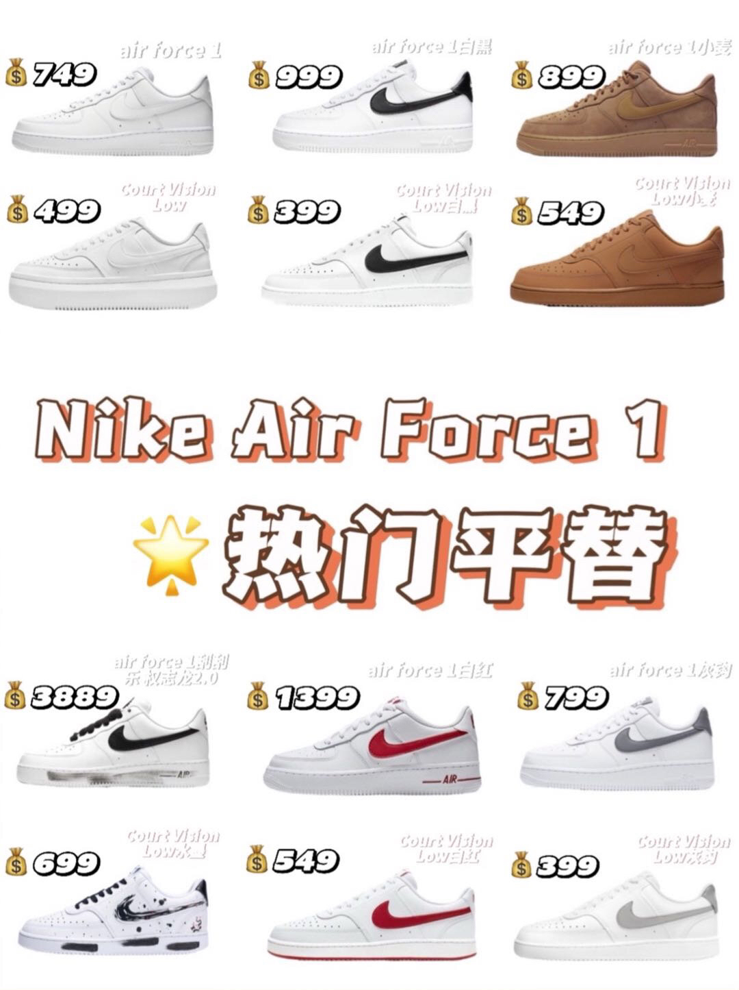 铁打的营盘流水的兵,不变的鞋款换色的鞋。从aj到dunk,多少人为了--双鞋而奔波? 其实呀,咱就是说动动脑子动动手,咱们自己来搞搞平替不香吗?又不是没有那实力,今天来给大家整几双Nike air force1平替 🥝Nike Air Force 1"07白 货号:CW2288-111 749 Nike Court Vision Alta白 货号:DM0113-100 499 🥝Nik...