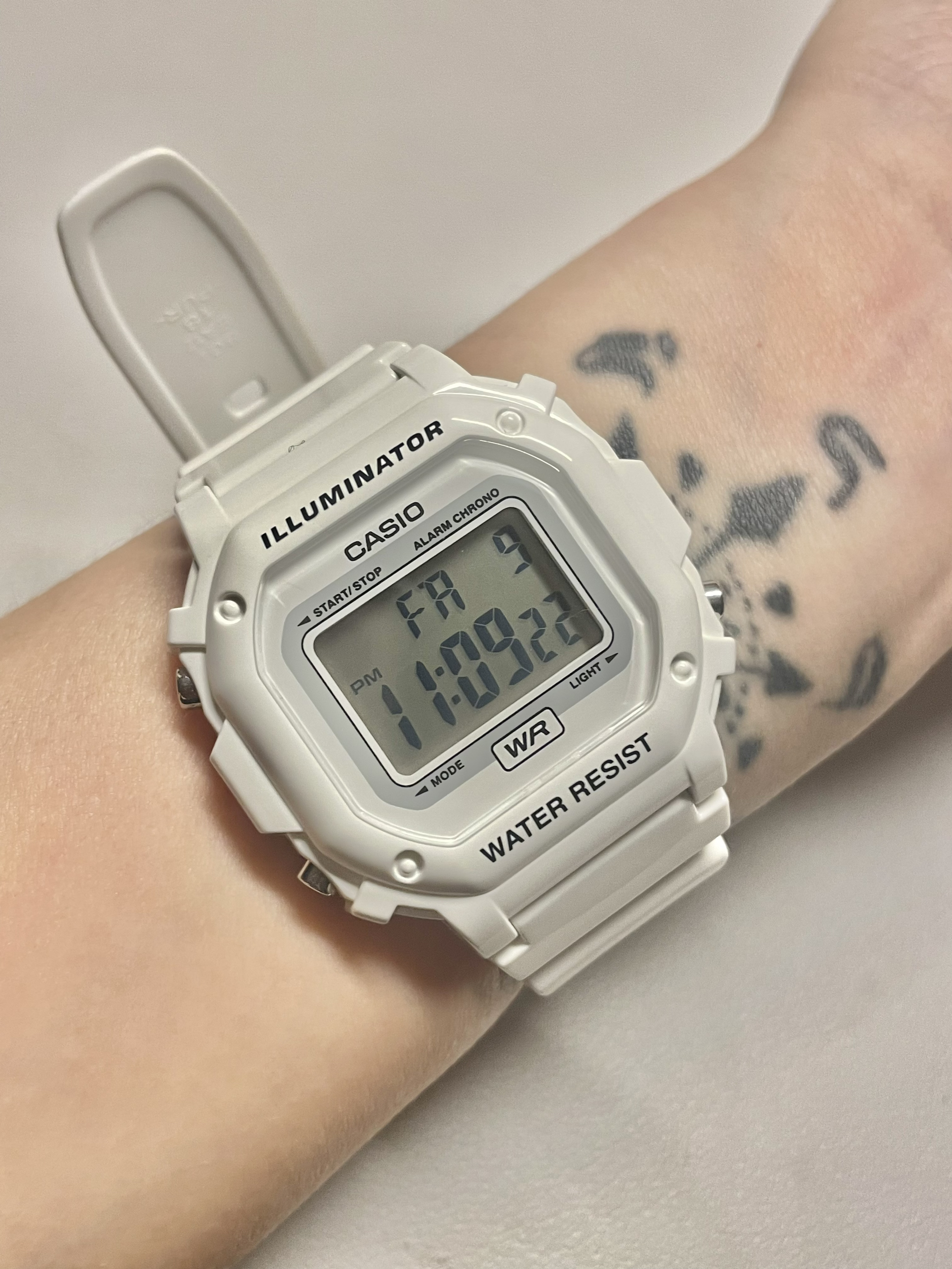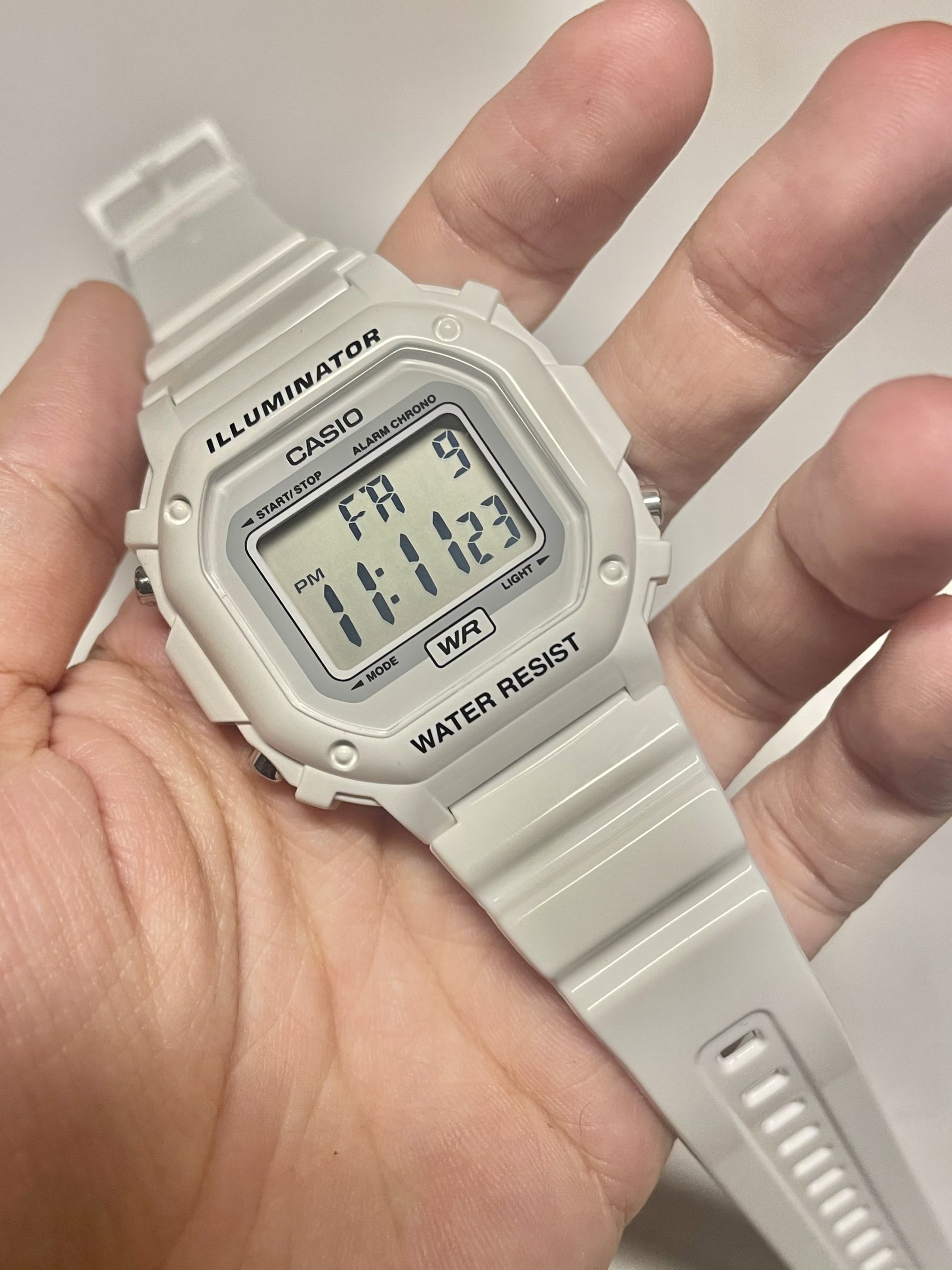 我的表大部分都是黑色的,看起来都比较沉稳, 终于入手了这款白色的小清新卡西欧. 重量只有31克, 虽然是橡胶表带但又厚实又柔软佩戴无感舒适.夜光秒表, 闹铃星期日期全都有,虽然不是百米防水, 只要不带去游泳应该问题都不大, 卡西欧的一般都比较耐造, 官方说有7年的电量,而且电池也便宜, 这表本身也省电,所以很省心. 好喜欢白色,奶呼呼的看起来就很治愈